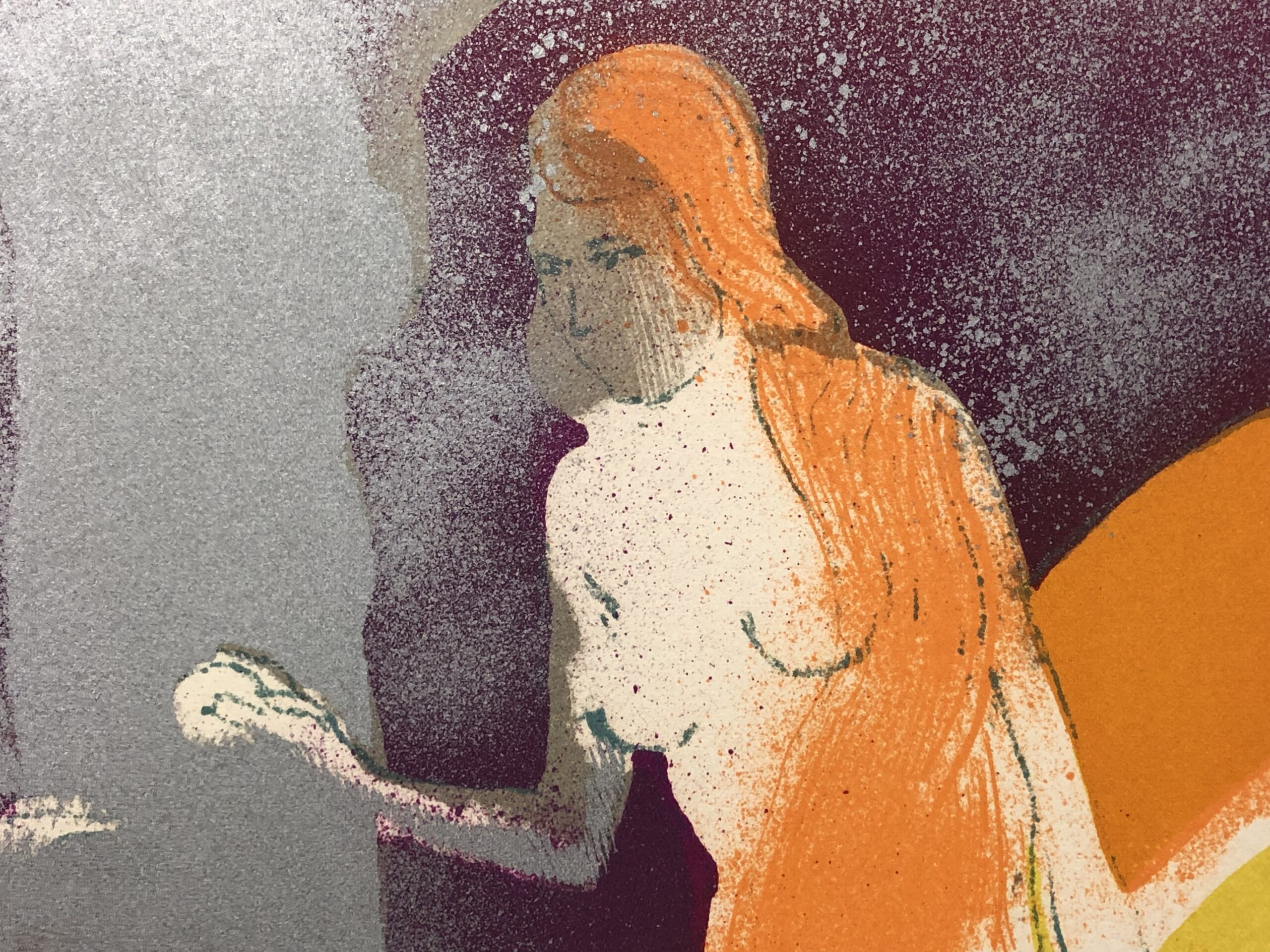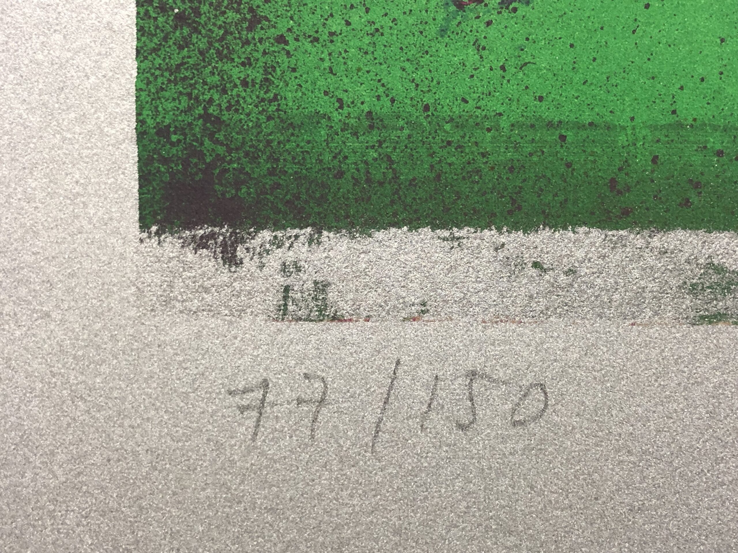 Color lithograph, signed in pencil and annotated “77/150” printed with a silvered background on heavy, felt-finish, cream wove paper. Near fine condition, light water damage at top , verso, not protruding to front. Free shipping to US address. (lff-o-lf)