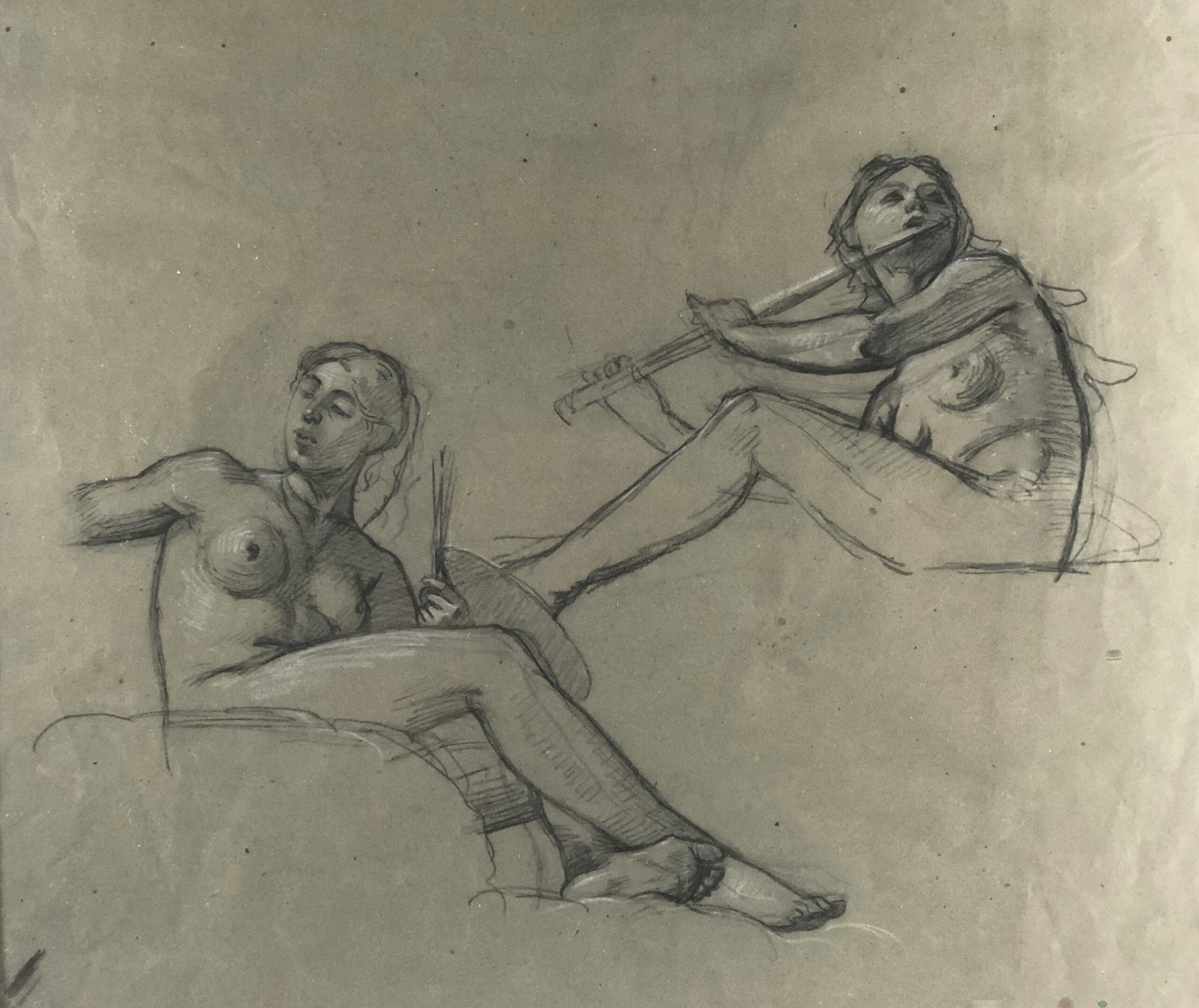 Black crayon, white and red chalk, signed lower right, executed on bluish-green, textured wove paper. Study for the mural Allegory of the Arts for the Museum in Senlis, 1889, never executed.