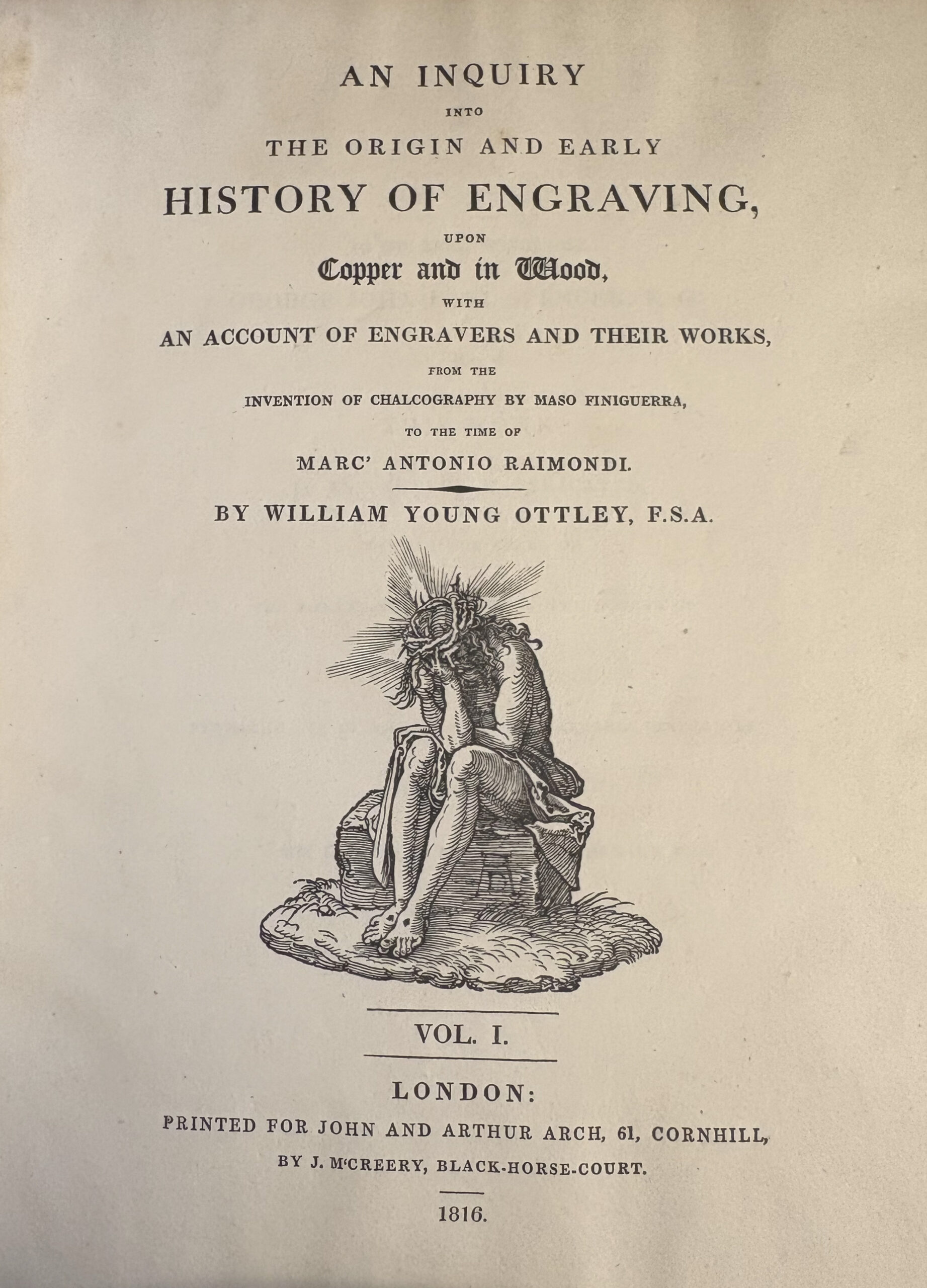 Two (2) volume set containing four (4) original woodcuts by Albrecht Durer’s Small Passion series of 1512. Published in London, 1816. The four original woodcuts, in Volume 2, were pulled from the original blocks in the British Museum.