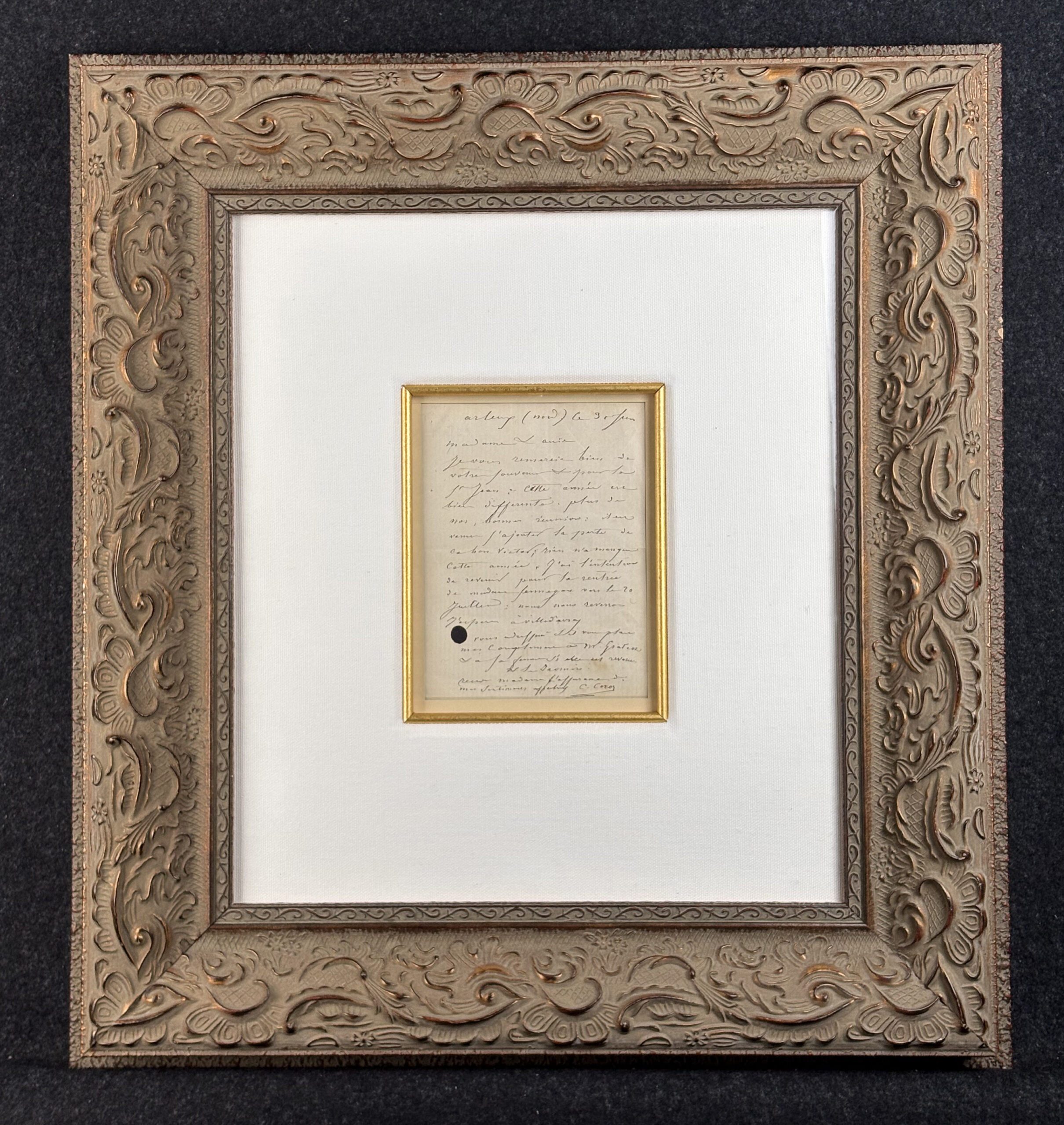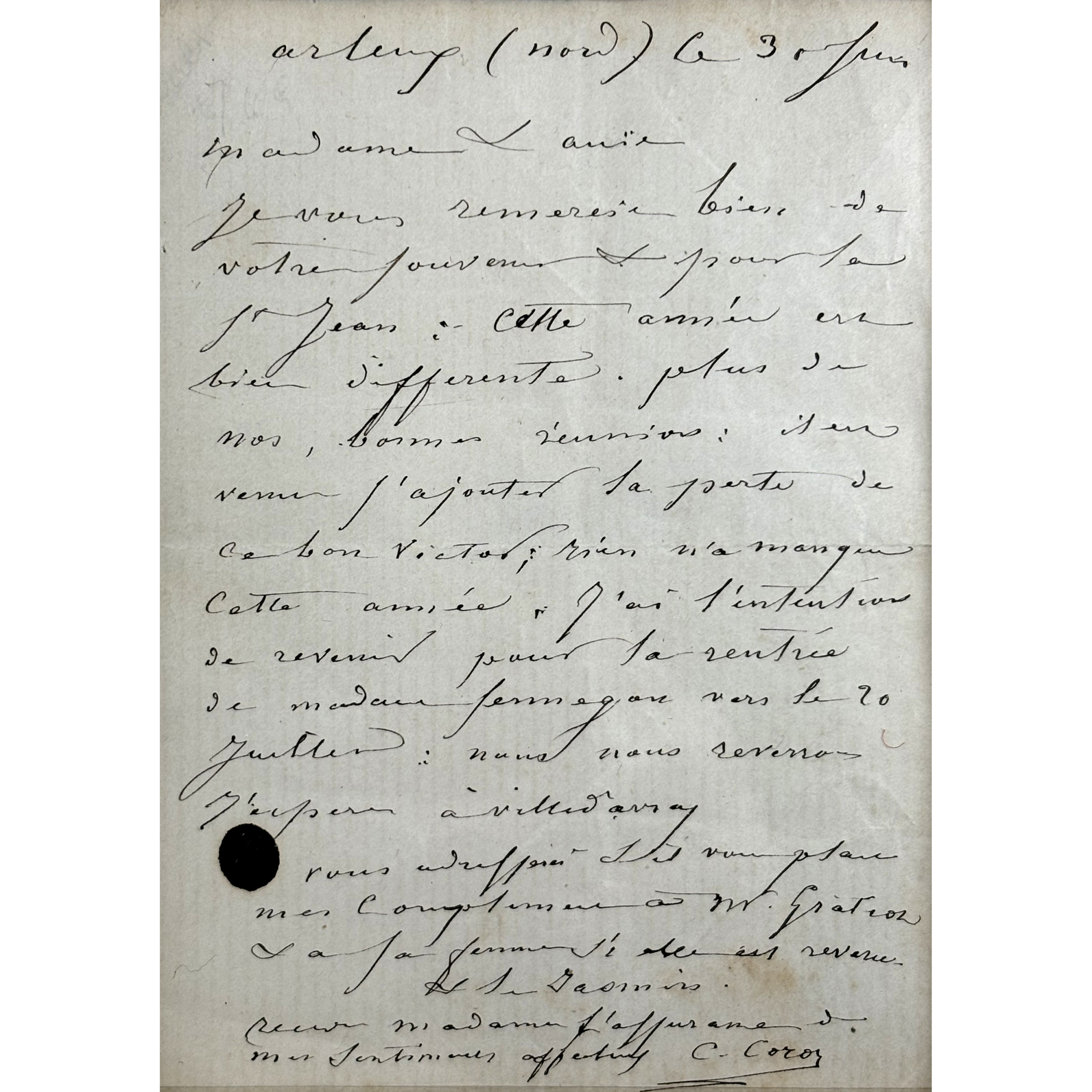 Signed autographed letter in French, in pen & ink to Madame Lause. Sent from Arleux-du-Nord, dated 30 June (no year), ca. 1971-72 when Corot was painting in Arleux-du-Nord. The identity of Madame Lause has not been discovered.
