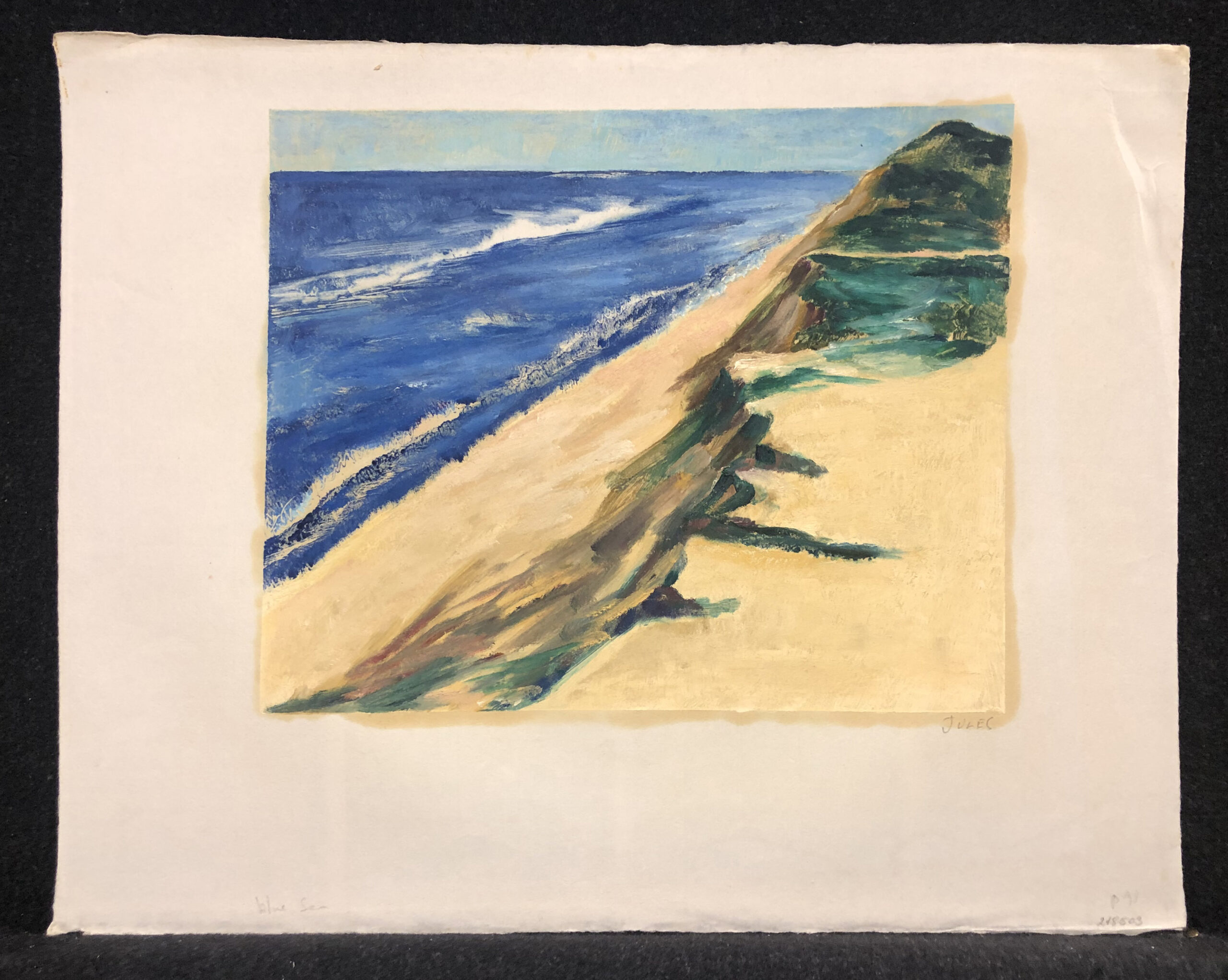 Monotype, signed “JULES” in pencil and annotated with title, printed in blue, green, brown, and yellow on natural-white Japan paper, 1,5 – 4.5 inches margins. Annotated “P. 9” lower-right corner indicating this image was the 91st work pulled at Provincetown, MA.
