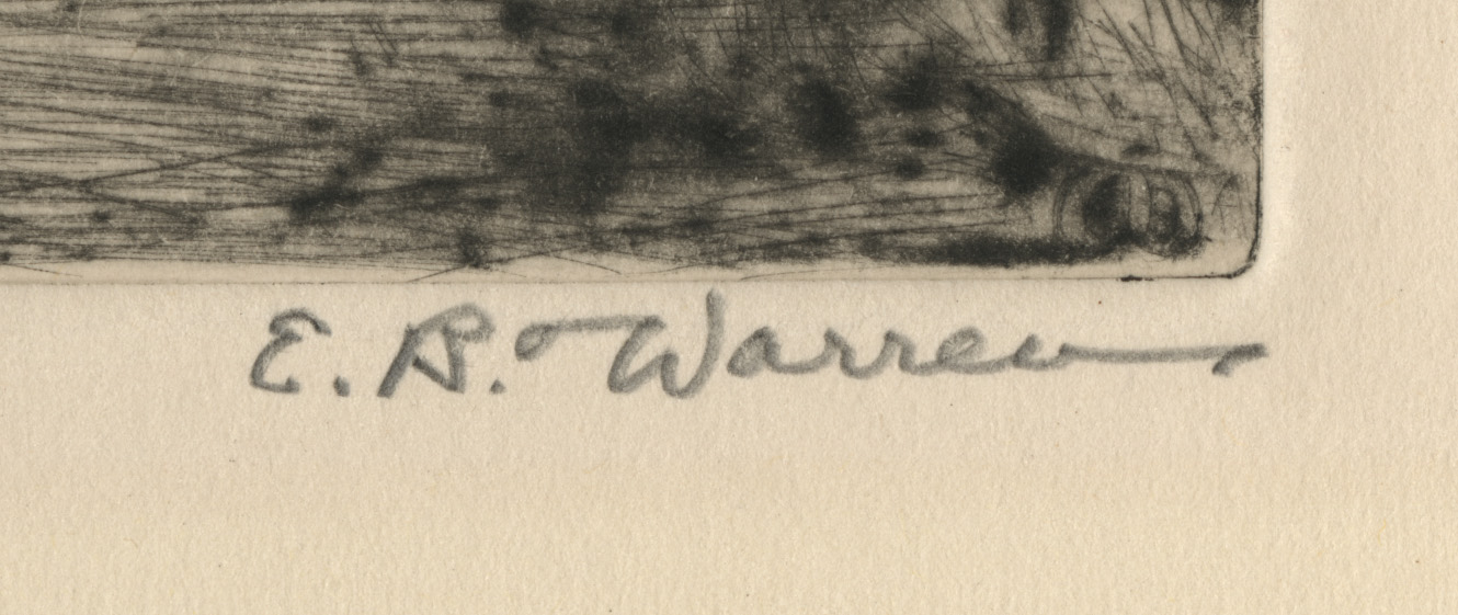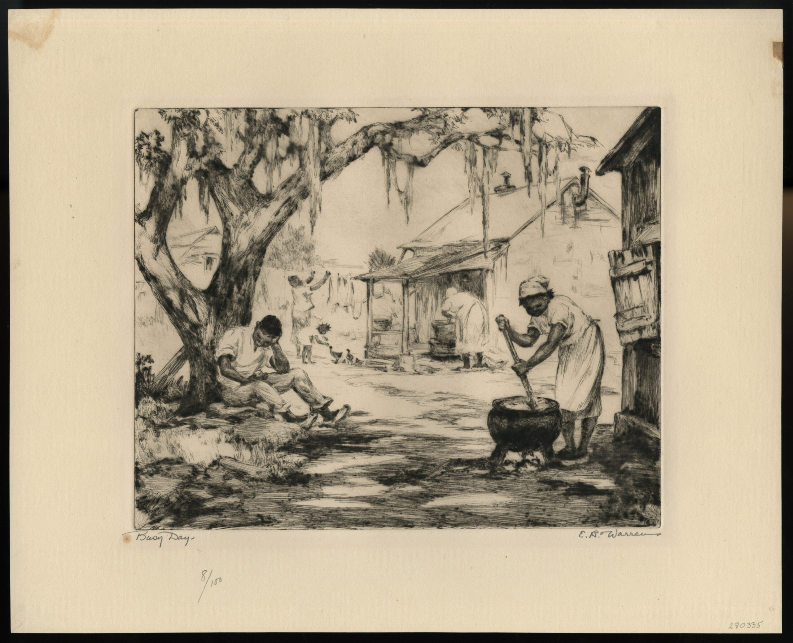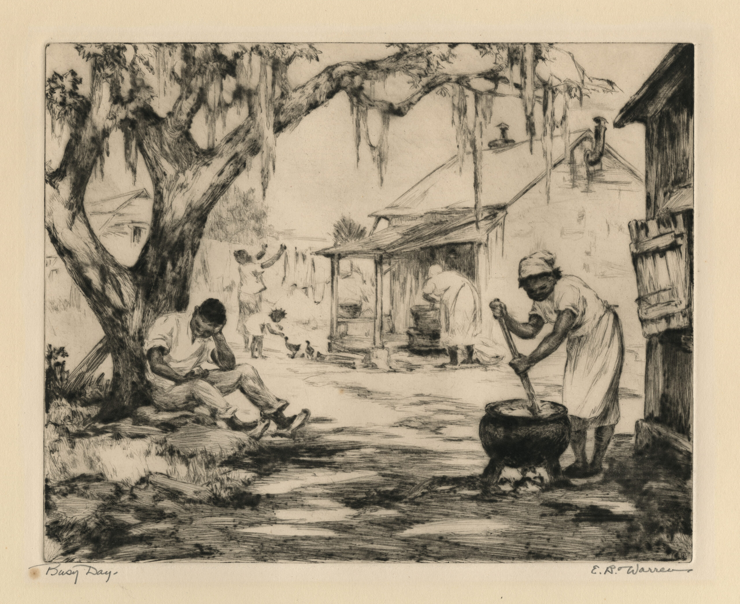 NotesElizabeth Warren married the artist Todd Lindenmuth, whom she met in Provincetown, and with whom she had two children. Both Todd and Elizabeth were very active in Provincetown, but in 1934, they visited St. Augustine, Florida and there they established a winter studio in the Fatio House on Aviles Street and became very active, respected members of that arts community. In 1940, the couple moved permanently to St. Augustine. "They never owned a car, and sought subjects on long walks around St. Augustine." This magnificent print, Busy Day, offers an insight into the depressing life of African-Americans in the rural South in the 1930s.