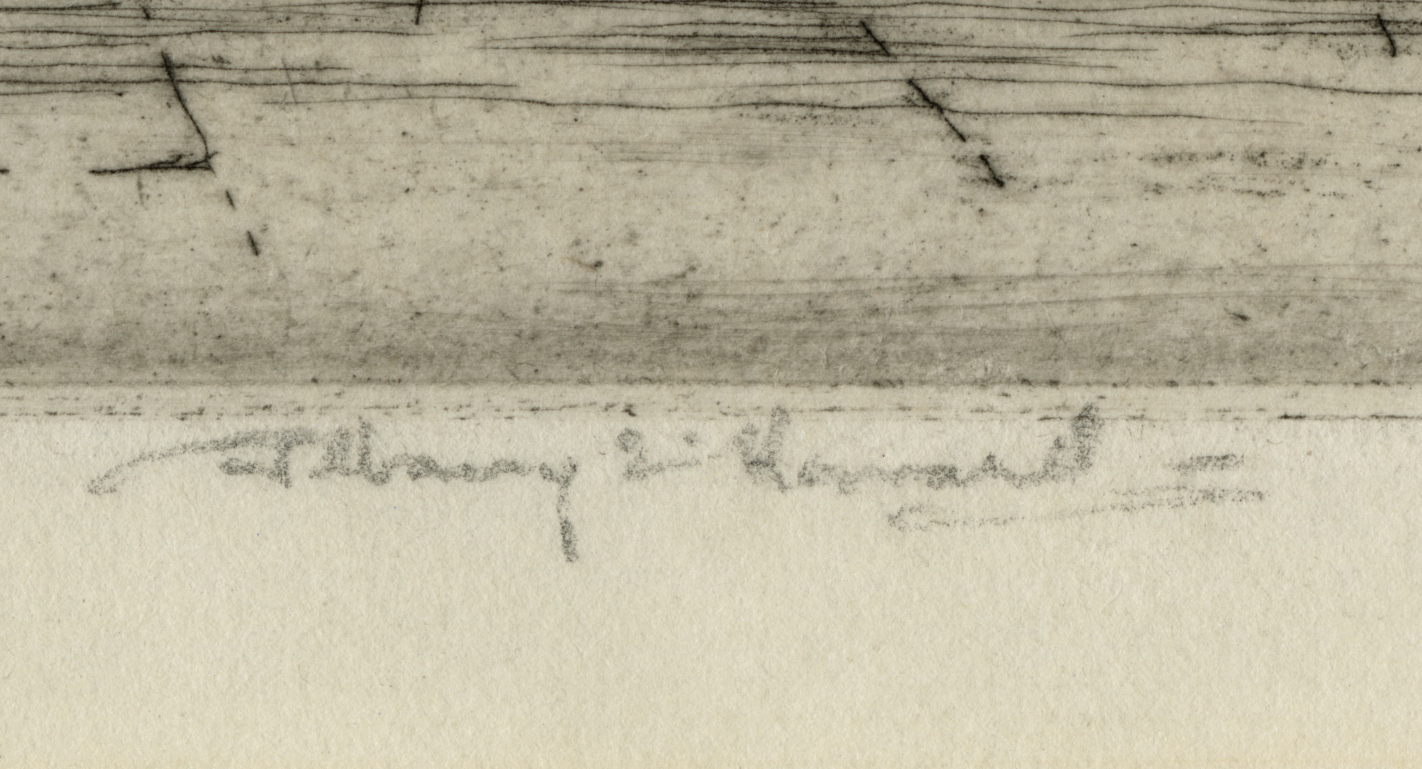 Etching, signed in pencil, with engraved title and credits in the image, printed on antique, fine-grained cream laid paper, 1.8 – 12.0 inch margins. Issued by the Fine Art Trade Guild, with their blindstamps at lower left. Excellent condition, tape residue at top margin, signature a bit rubbed. Free shipping to US address. (bx-13)