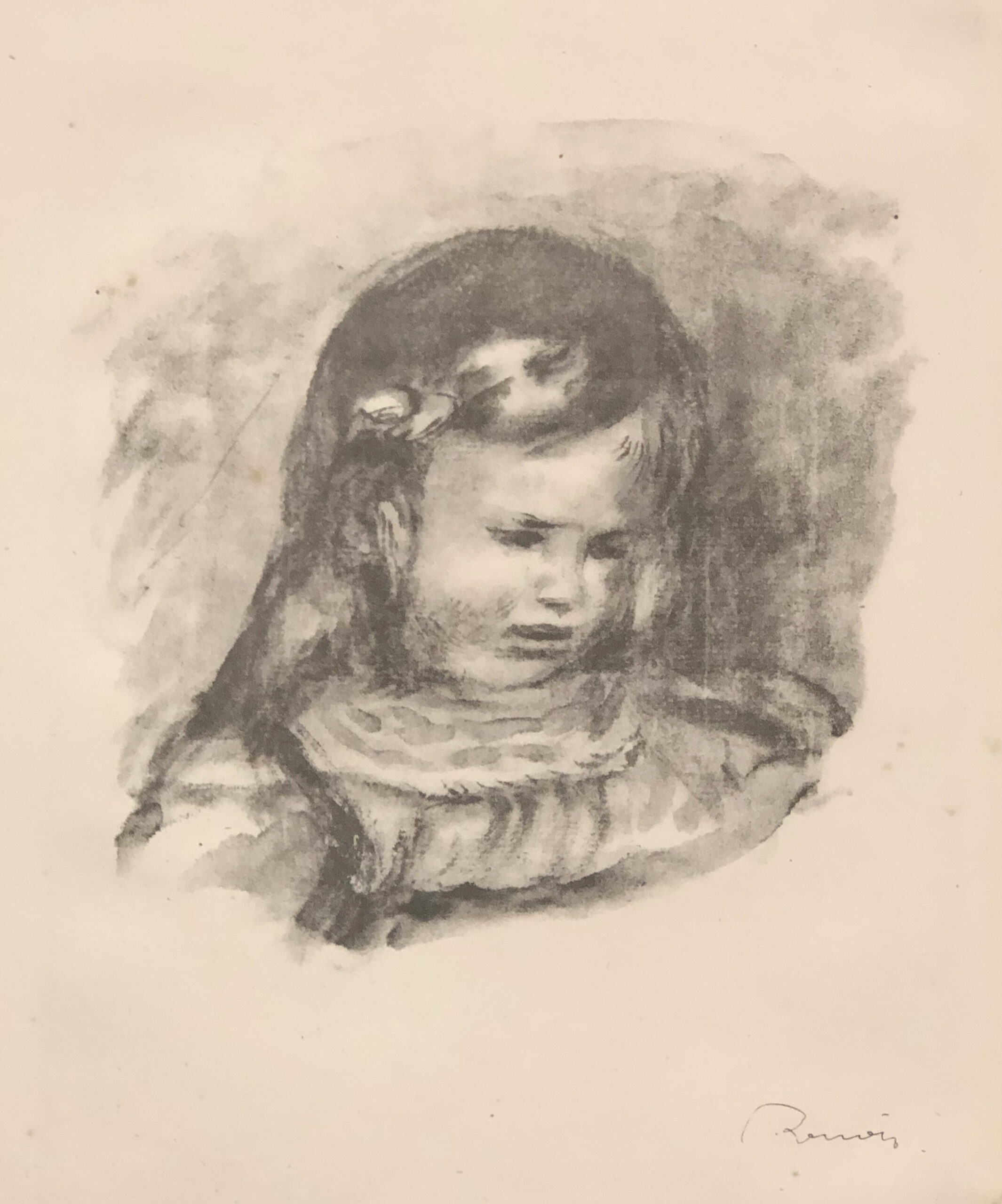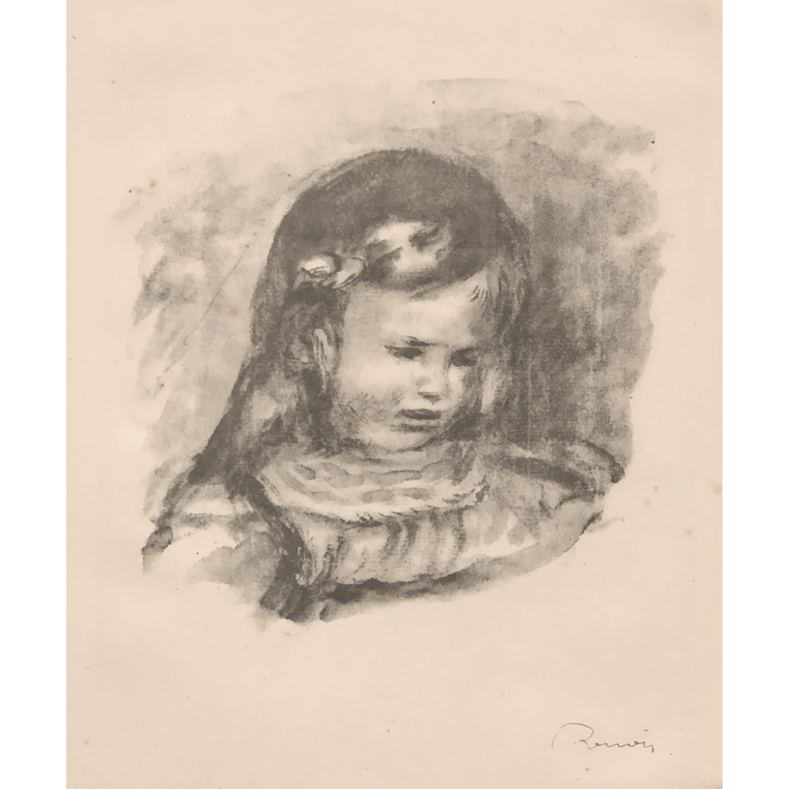 Original lithograph from the de Luxe edition. stamped signature at lower right, printed on fine-grained, cream wove Arches paper, 13.2 X 10.0 inches sheet. From DOUZE LITHOGRAPHIES ORIGINALES DE PIERRE-AUGUSTE RENOIR, published 1905, total edition of 1,000.