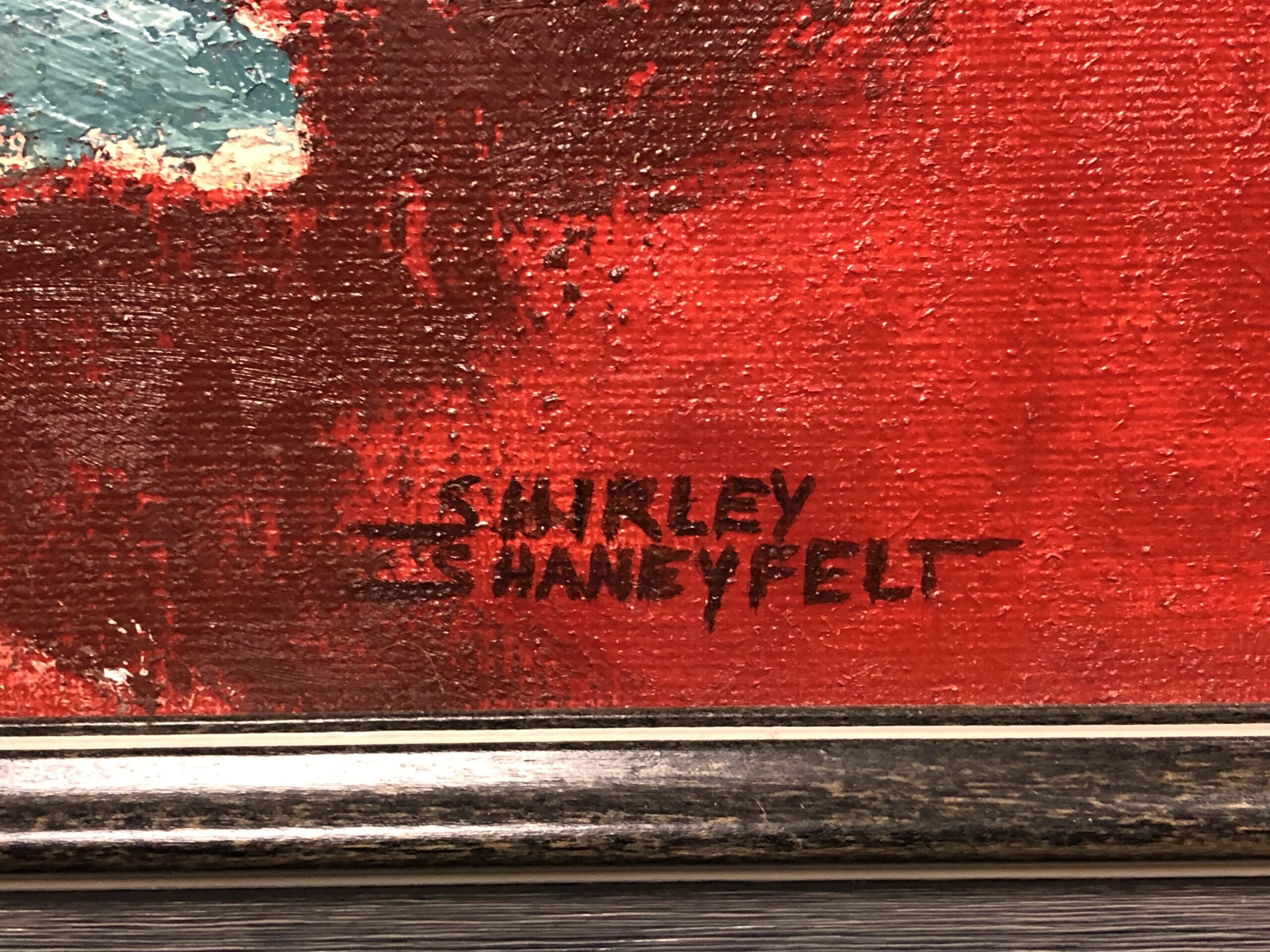 Oil on canvas, signed “Sherley Shaneyfelt” lower right, framed in a 1960s wood frame – a very large work. Fine condition. Free shipping to US address.