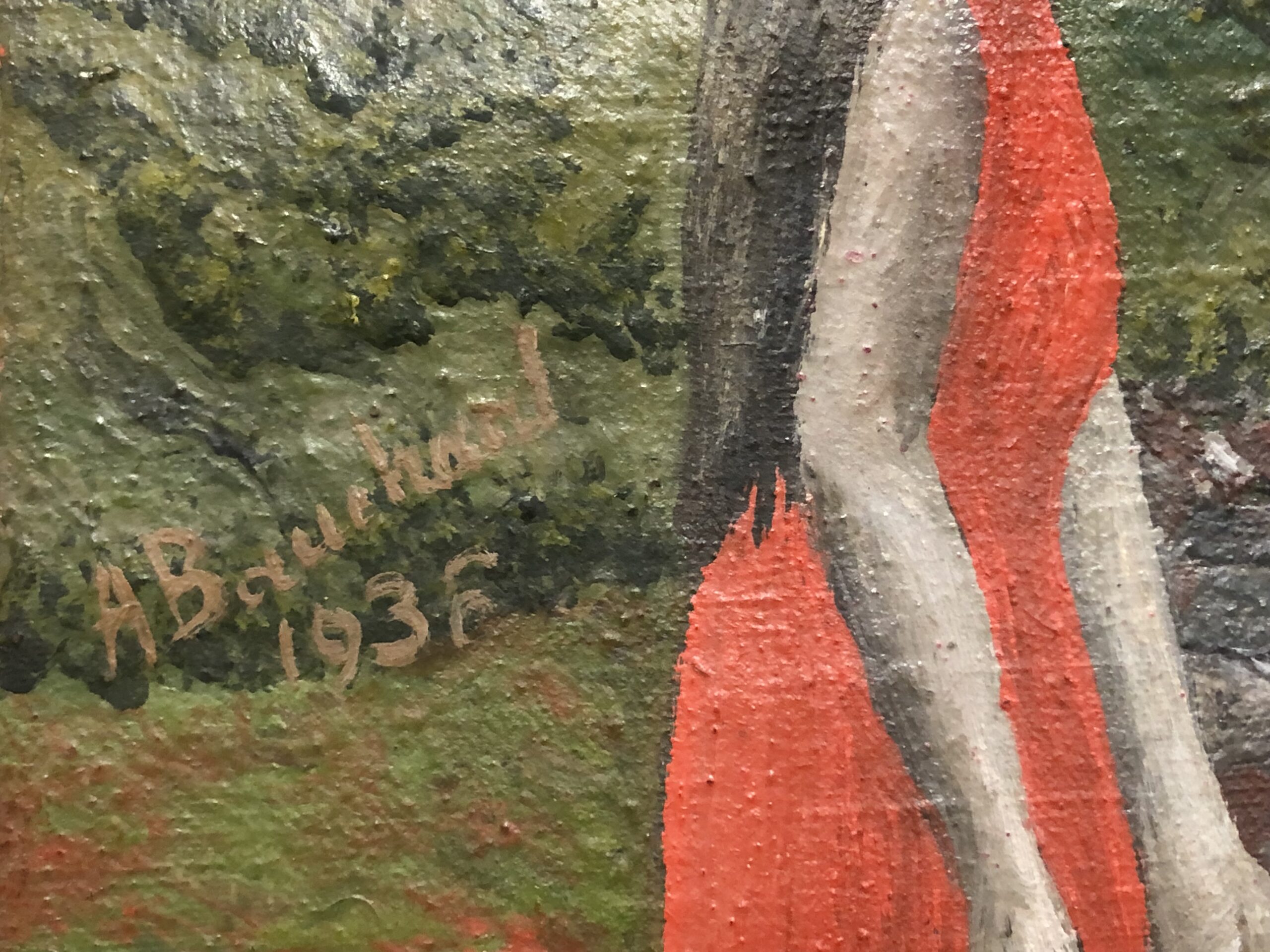 NotesAndré Bauchant was a French 'naïve' painter. He is known mostly as a painter of flowers and of landscape compositions with figures which were often informed by mythology and classical history. He was born in Château-Renault, Indre-et-Loire. The son of a gardener, he originally entered his father's trade, and progressed to operating a nursery. In 1914, he was called to serve in World War I. During the military service his drawing skills were noticed and he was trained as a mapmaker. After demobilization in 1919 he found his nurseries destroyed. He and his wife relocated to Auzouer-en-Touraine, where he found work on local farms. Inspired by the rural environment, at the age of 45, he dedicated himself to a career as a painter. Many of his early works depict biblical or mythological themes. His first exhibit was in 1921 at the Salon d'Automne, where he showed a large Ulysses and the Sirens and eight other paintings. Le Corbusier and Amédée Ozenfant wrote an article about him for the journal L'Esprit Nouveau in 1922, and Le Corbusier became an important collector of his work. In 1927 Bauchant was commissioned by Diaghilev to design sets for Stravinsky's Apollon Musagète. Subsequently, Bauchant's most frequent subjects were floral still lifes and landscapes with figures. In 1937 his paintings were included in the exhibition Maîtres Populaires de la Réalité, which traveled to Paris, Zurich, and London. In 1938–1939, a version of the same exhibition was presented at eight US museums, beginning with the Museum of Modern Art in New York. In 1949, a retrospective exhibition of 215 of his works was mounted by the Galerie Charpentier in Paris.