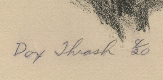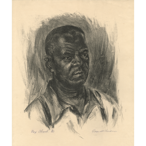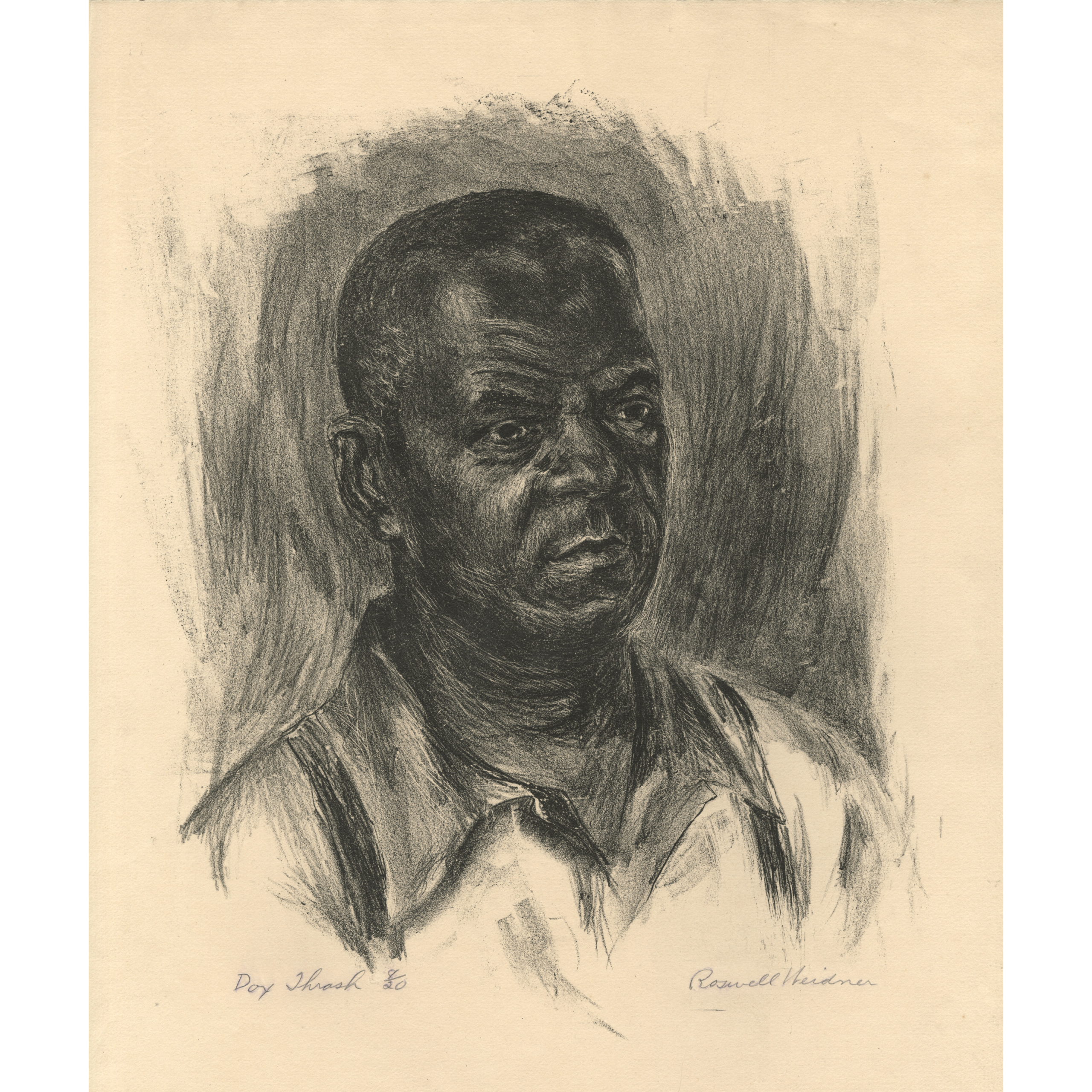 This print was executed as part of the WPA Fine Art program (FAP) in 1938. Weidner was a close friend of Thrash and he captured the dignity of his friend in this print. Thrash and Weidner explored the new carborundum mezzotint printmaking technique (co-invented by Thrash) together in Philadelphia while working for the WPA-FAP.