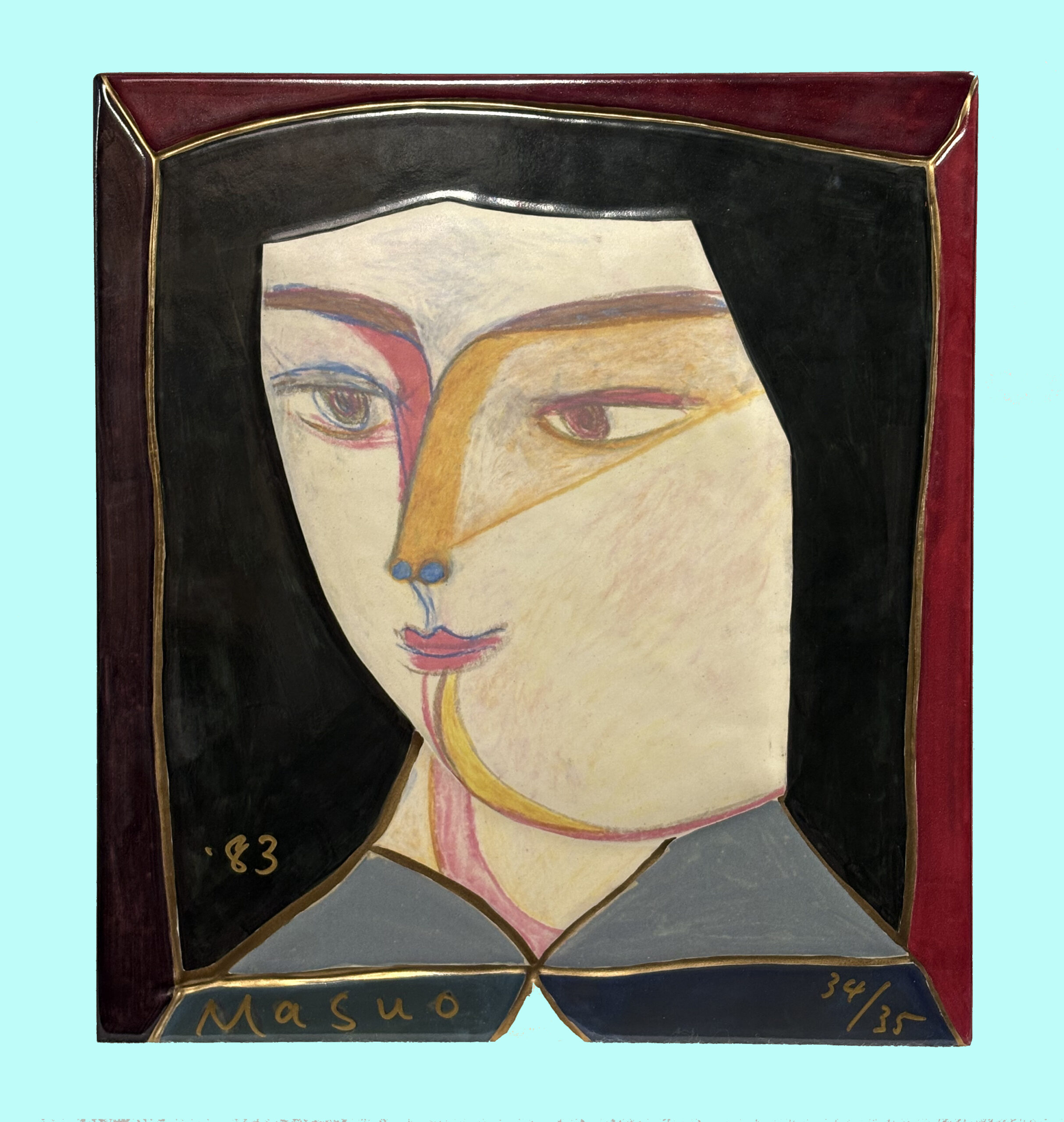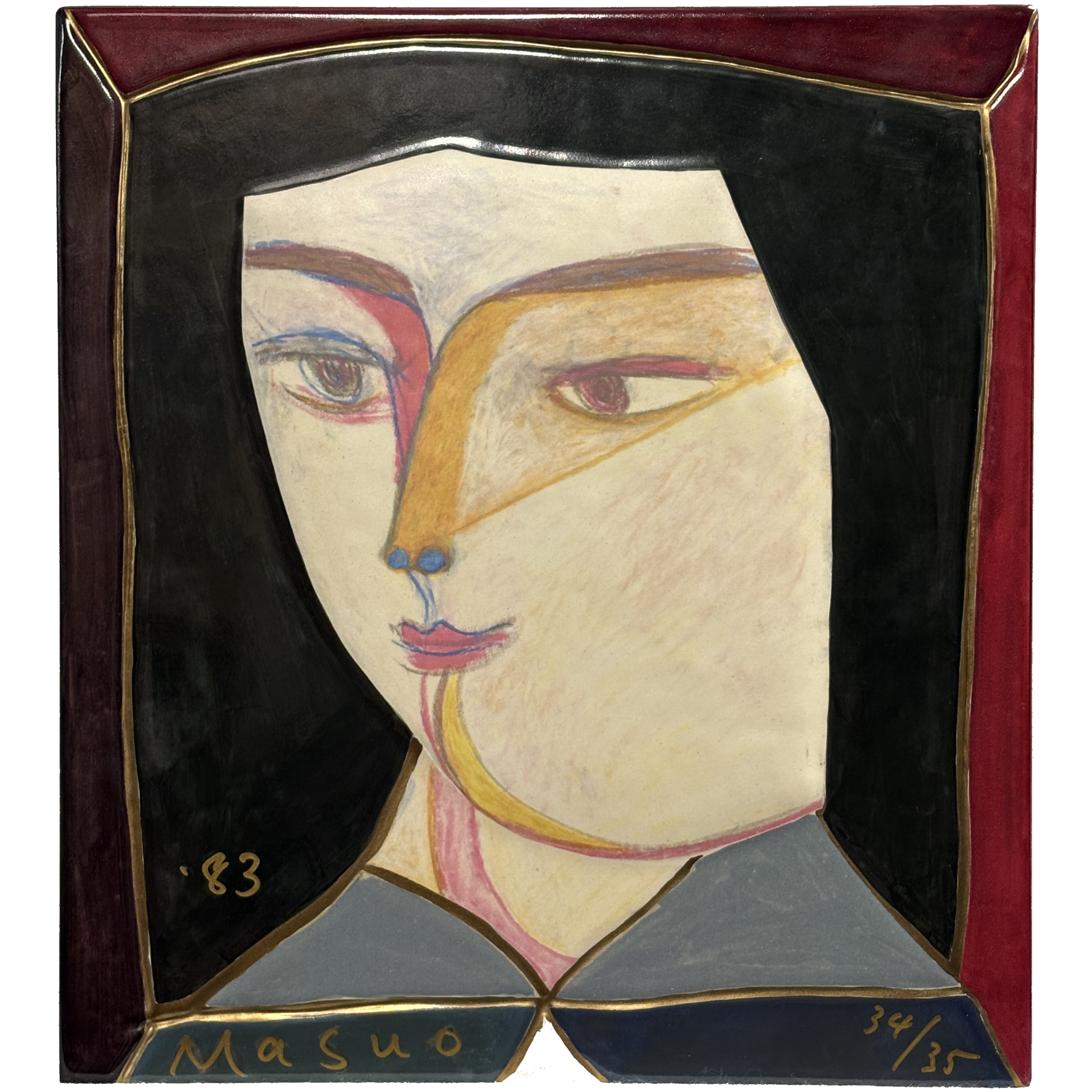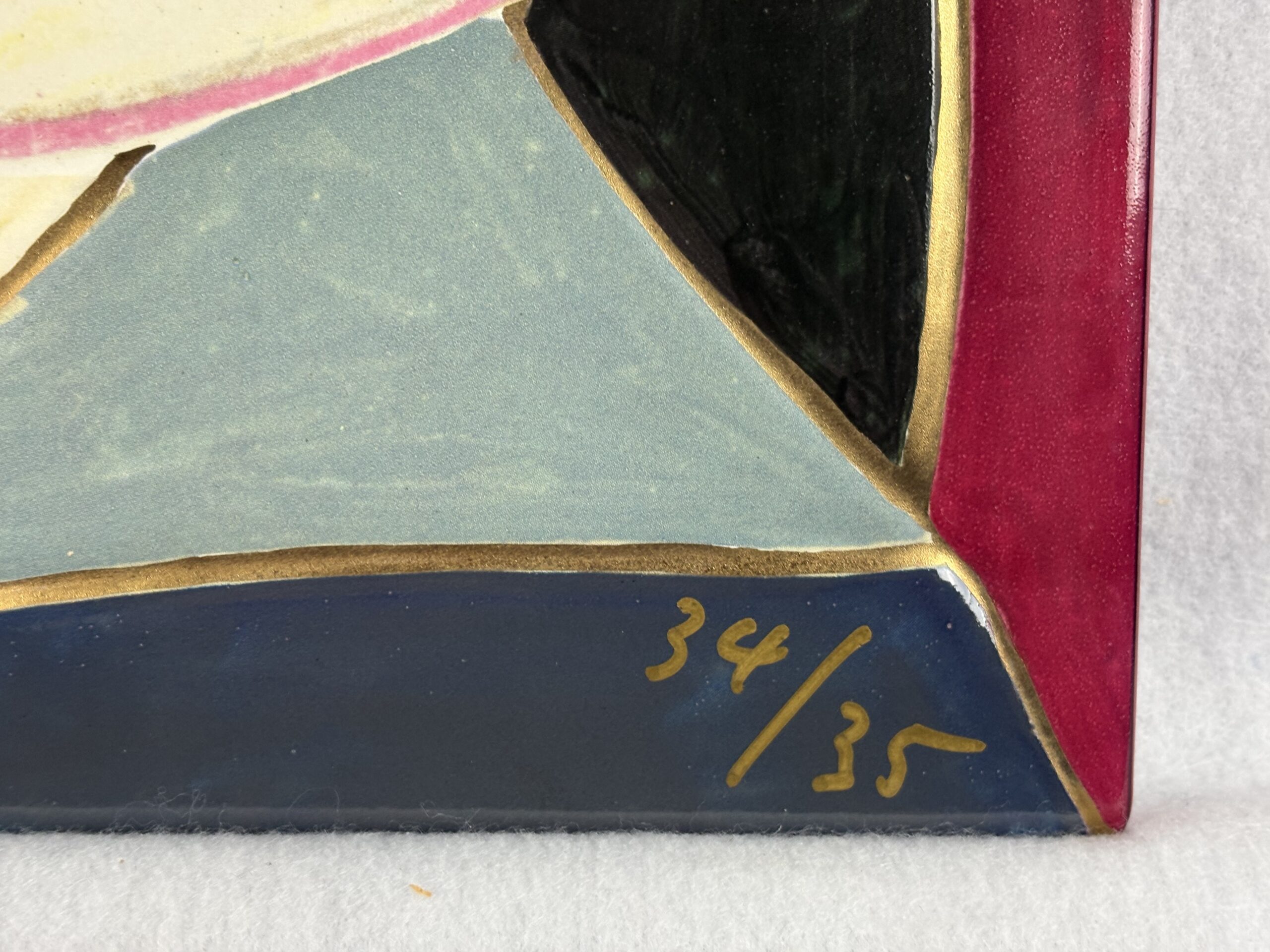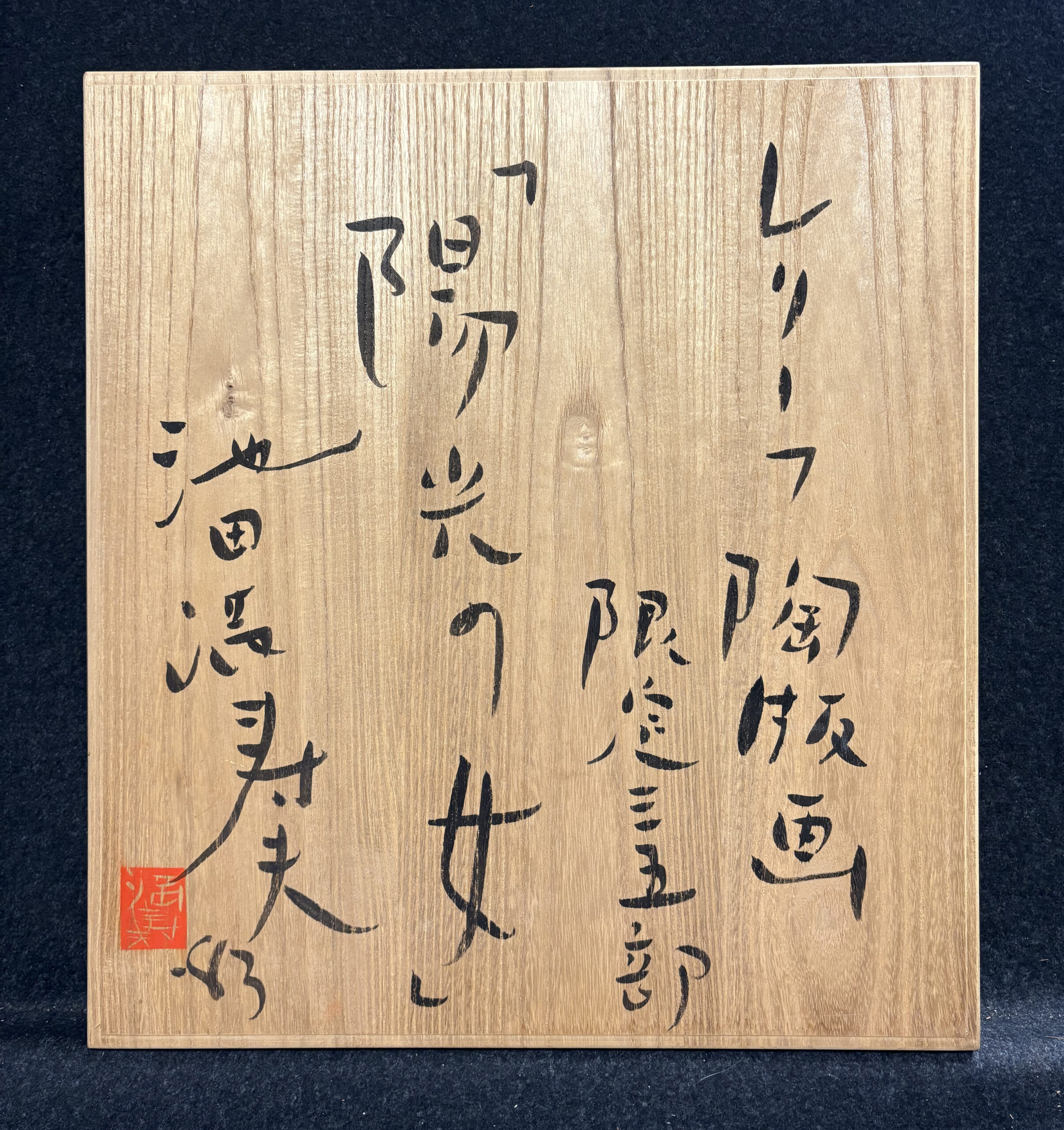 Glazed porcelain ceramic tile, signed and dated and annotated “34/35” under the glaze. In a Kiri (Paulownia) wood box with title, date, and credits (in Kanji) written on the front, as issued.