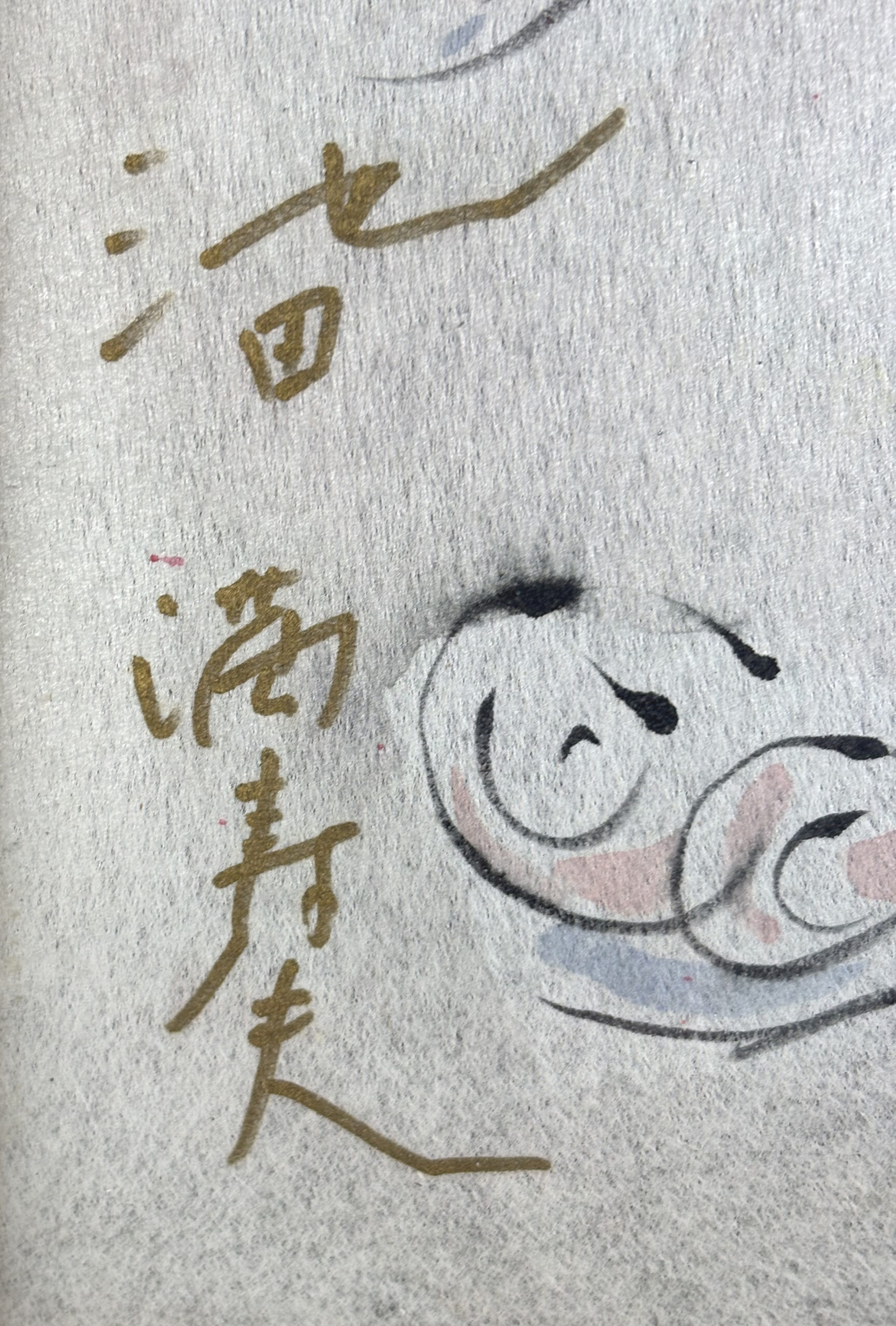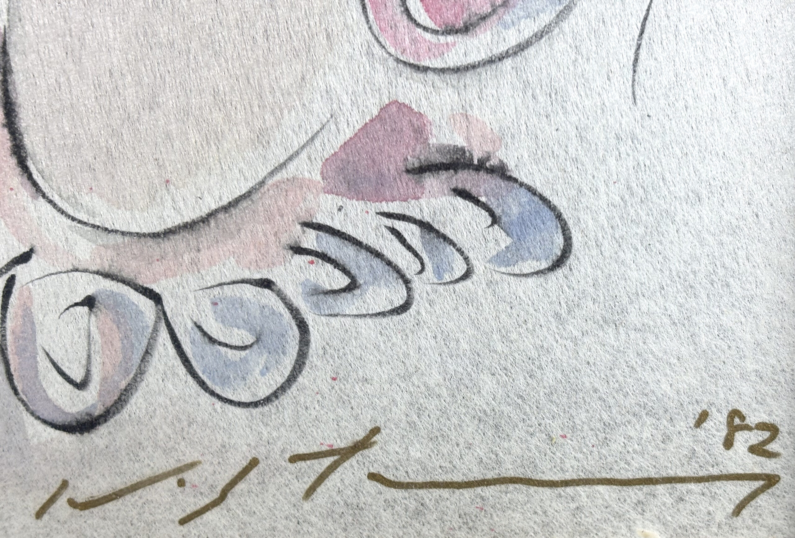 Watercolors on thin paper board with silvered facing, signed in Kanji at left and in Roman characters and dated “82” at bottom.