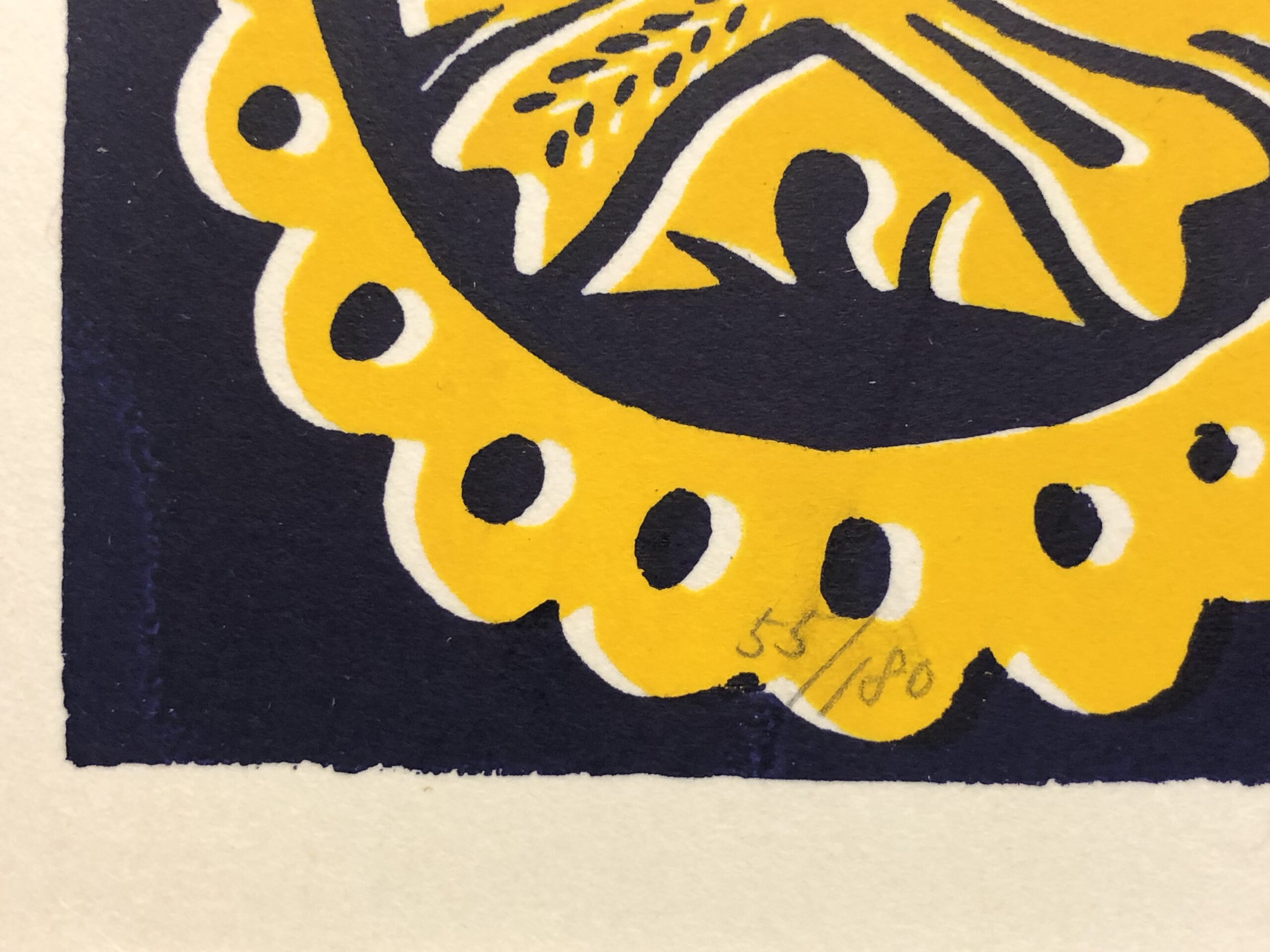 Woodcut, signed with reddish crayon at lower right in the image and annotated “55/160” at left, printed in black and gold on smooth, stiff wove paper. Rare. Fine condition. Free shipping to US address.