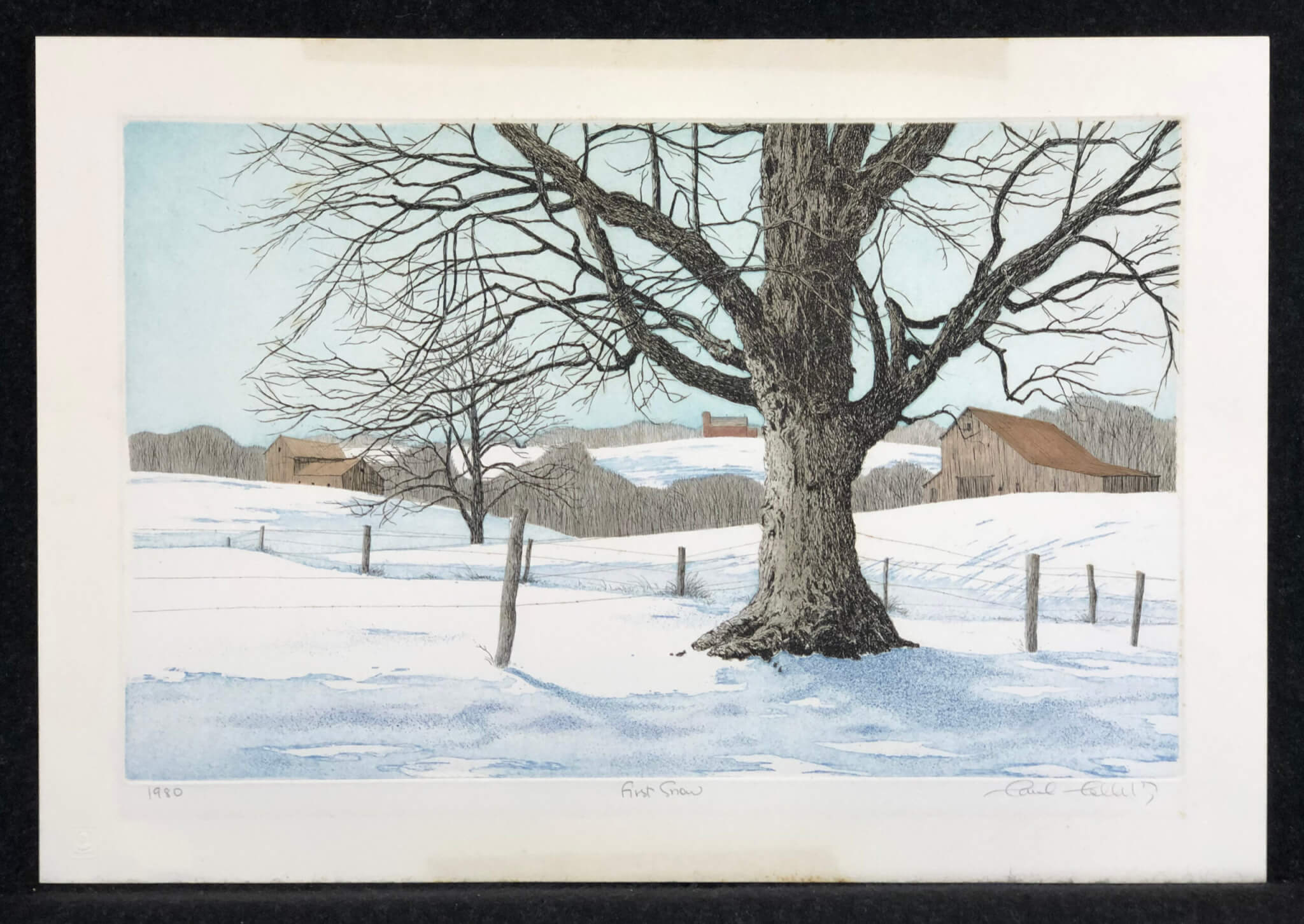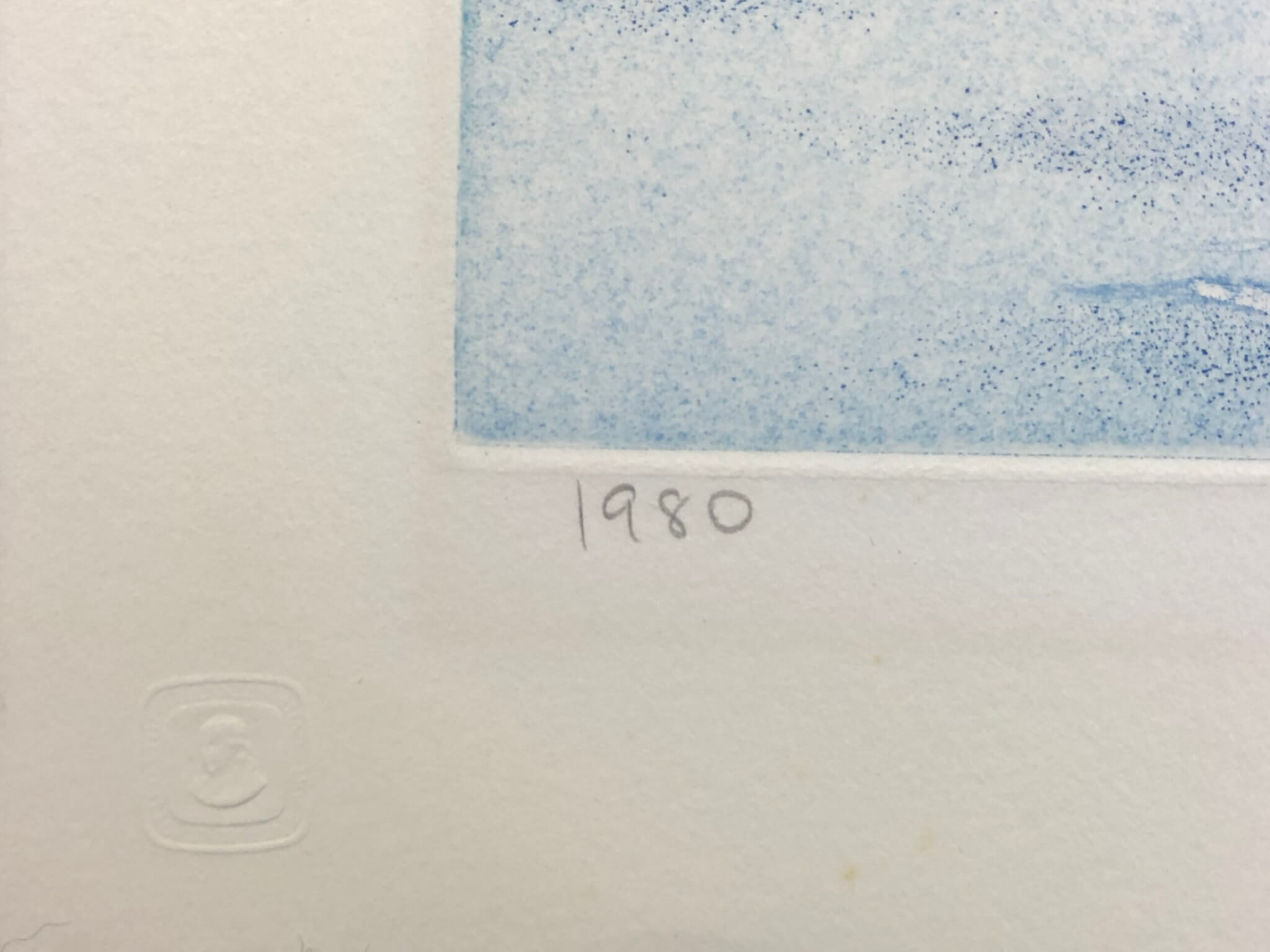 Signed in pencil and annotated with title and “1982”, printed on heavy, felt-finish, pale-cream wove paper. Issued by the Franklin Institute Gallery of Fine Art, 1982, with their embossed seal at lower left corner. Very good condition, old tape stains verso, bleeding to front. Free shipping to US address.