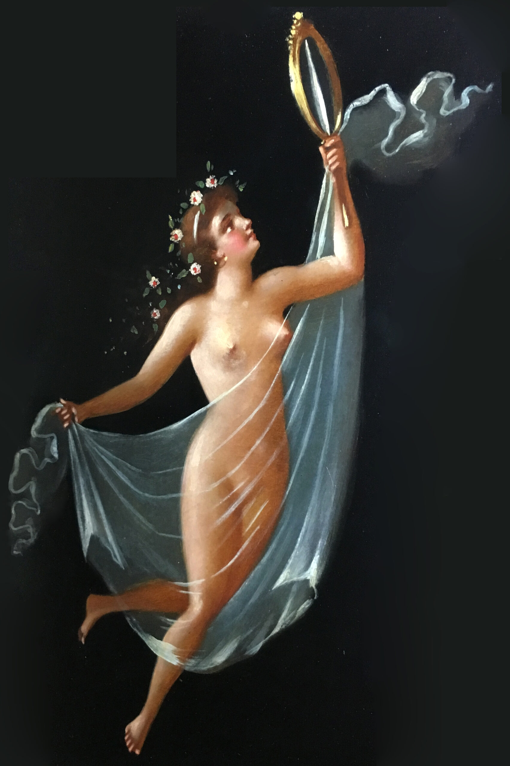 NotesThis painting is a fragment of a larger canvas painted ca. 1829-30 by an unknown American artist. The image was inspired by the recent archeological discoveries at Pompeii. A variant of this image was found on the walls of the villa of a wealthy Roman citizen excavated at Pompeii in 1829. The news of the discovery traveled quickly to the Colonies and rapidly became the fashion for rich families to decorate their homes.