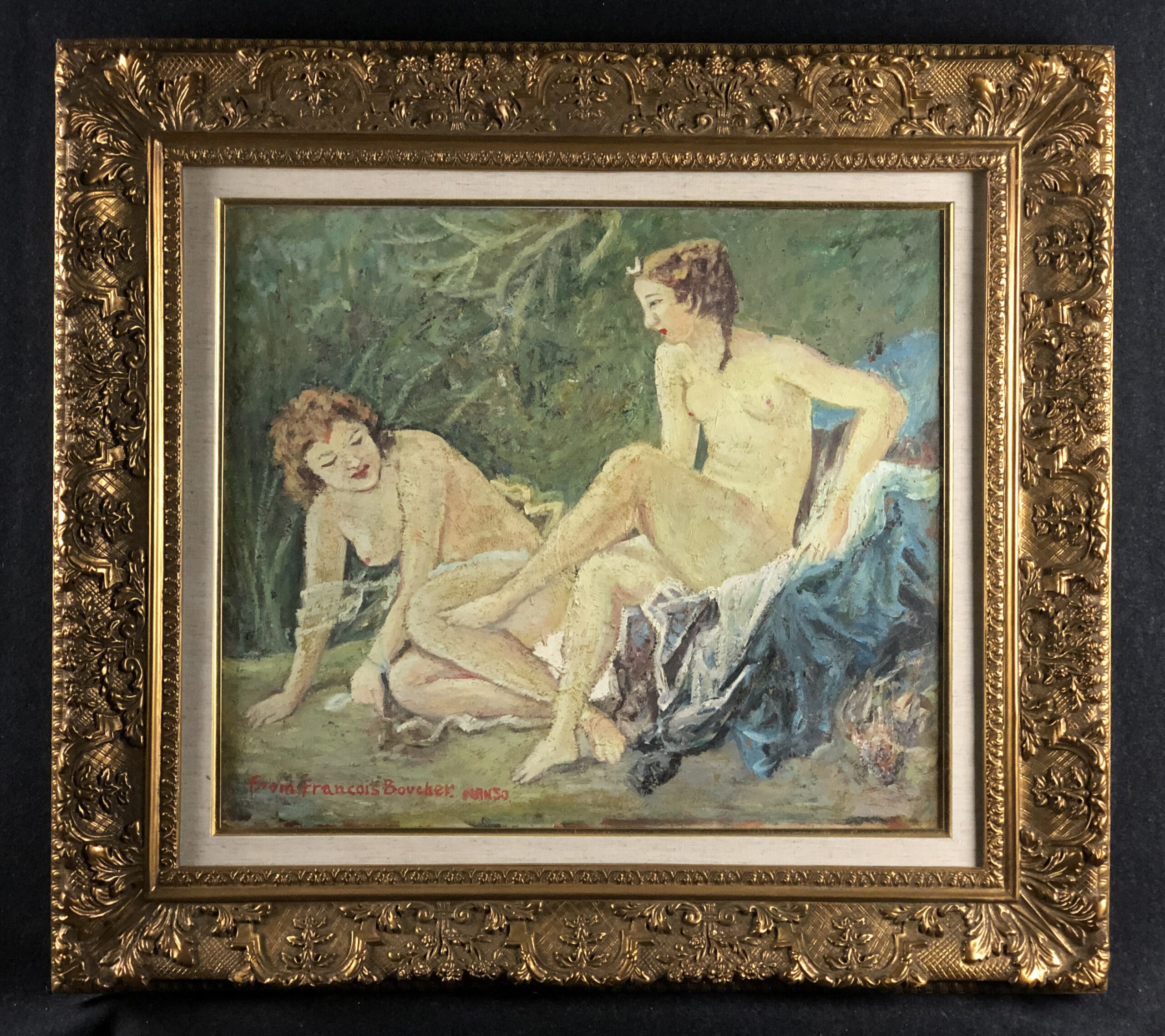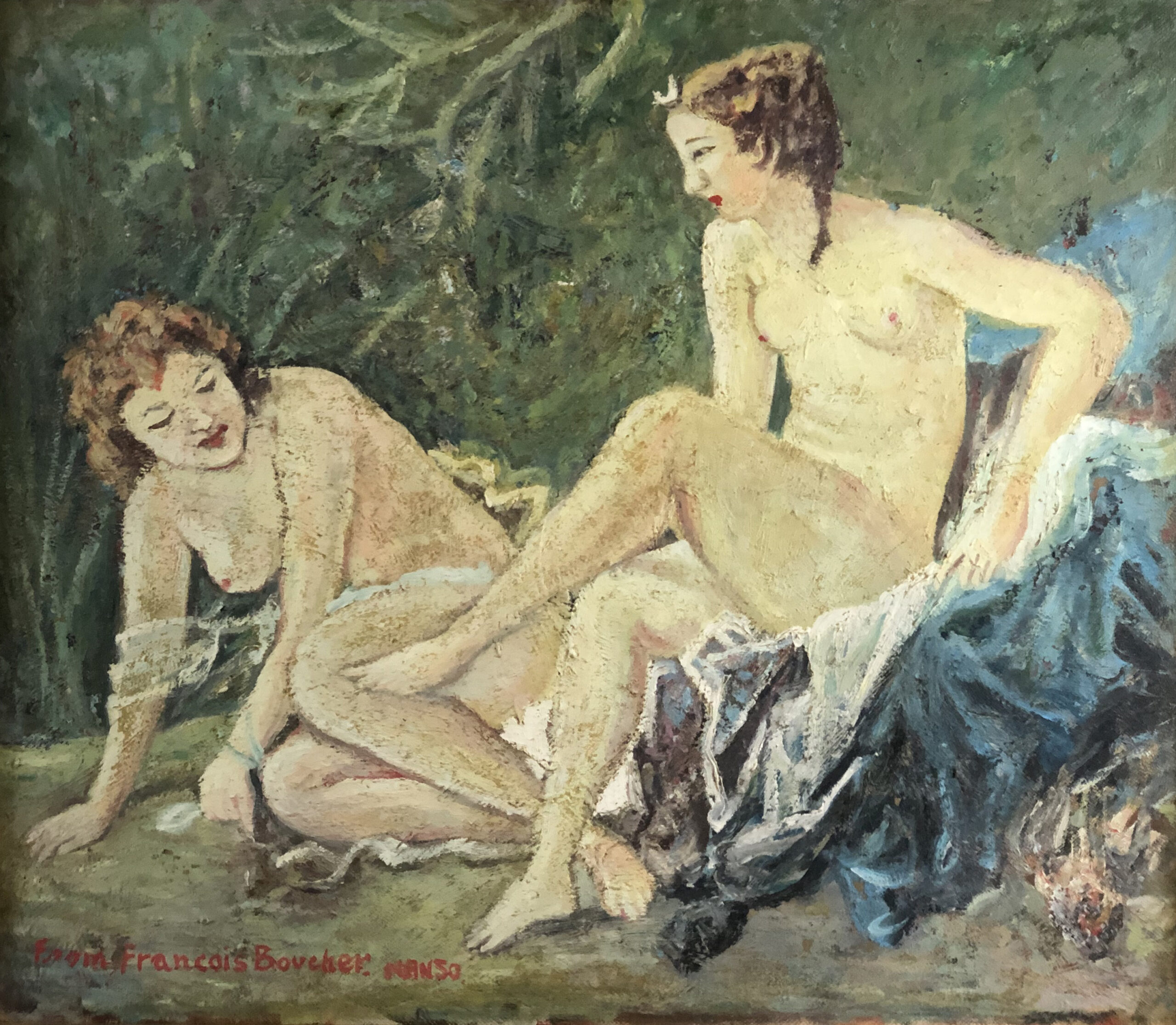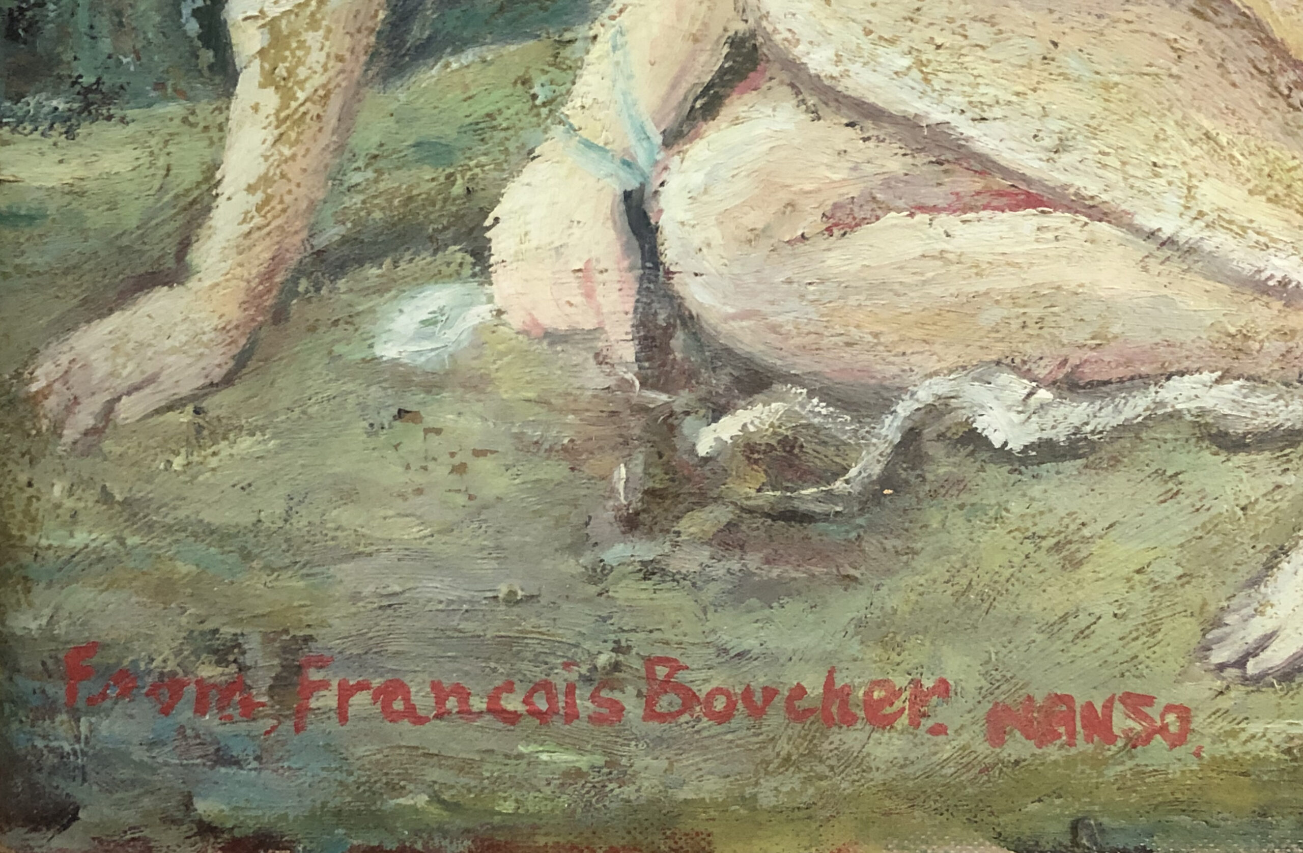Oil on canvas, signed “From Francois Boucher. Nanso.” A heavy impasto hommage rendering of Boucher’s Diana Resting after her Bath (1742).