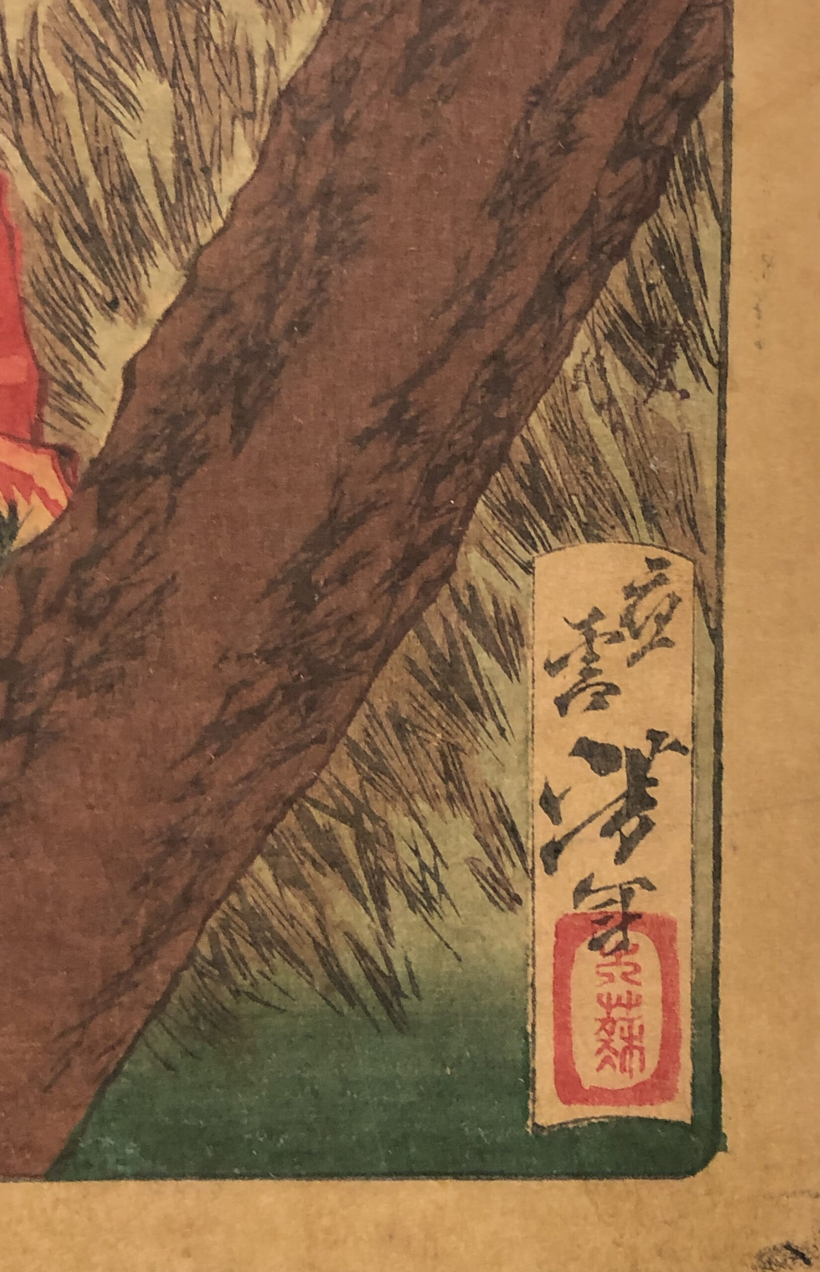 Polychrome woodblock print, vertical oban, printed on brown laid paper. From the series Dai Nippon Meisho Kagami, published by Funazu Chojiro, 1878.