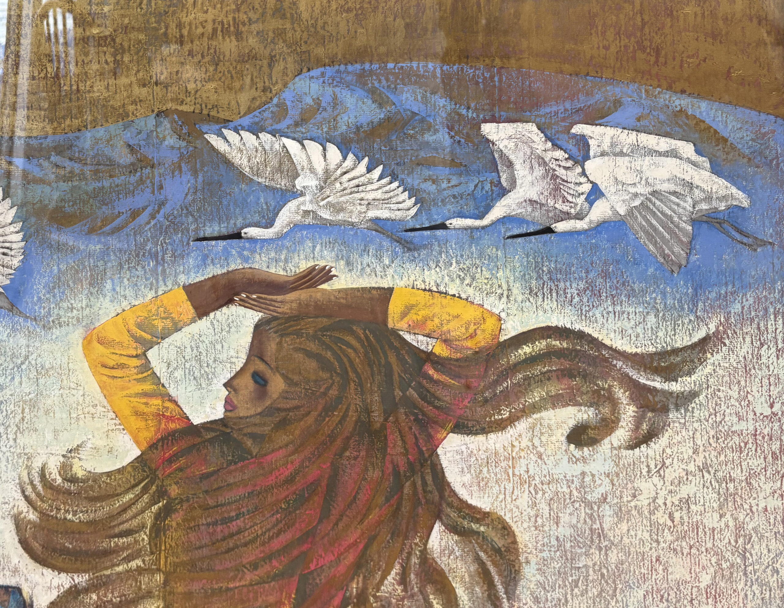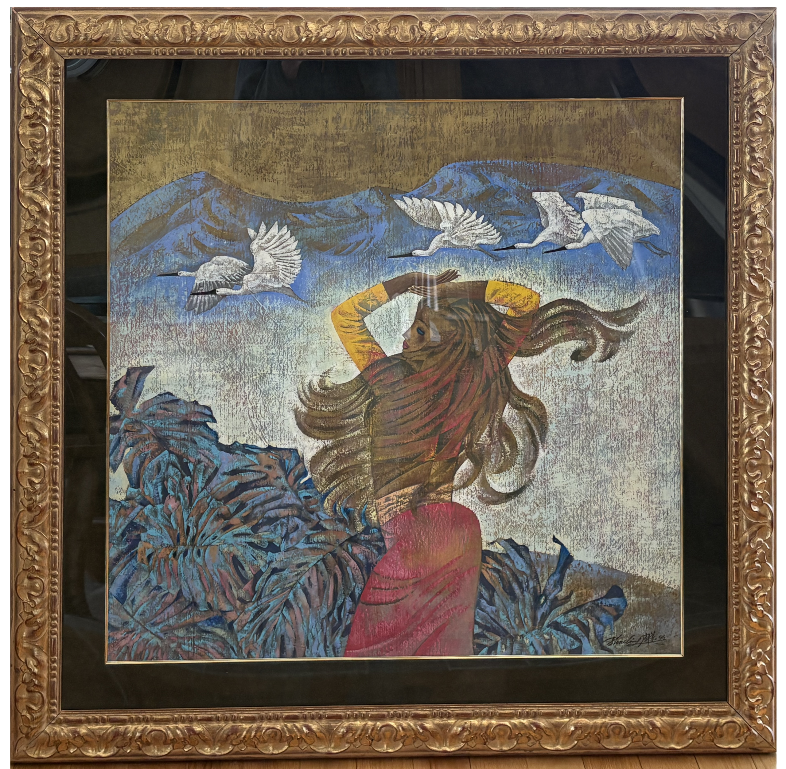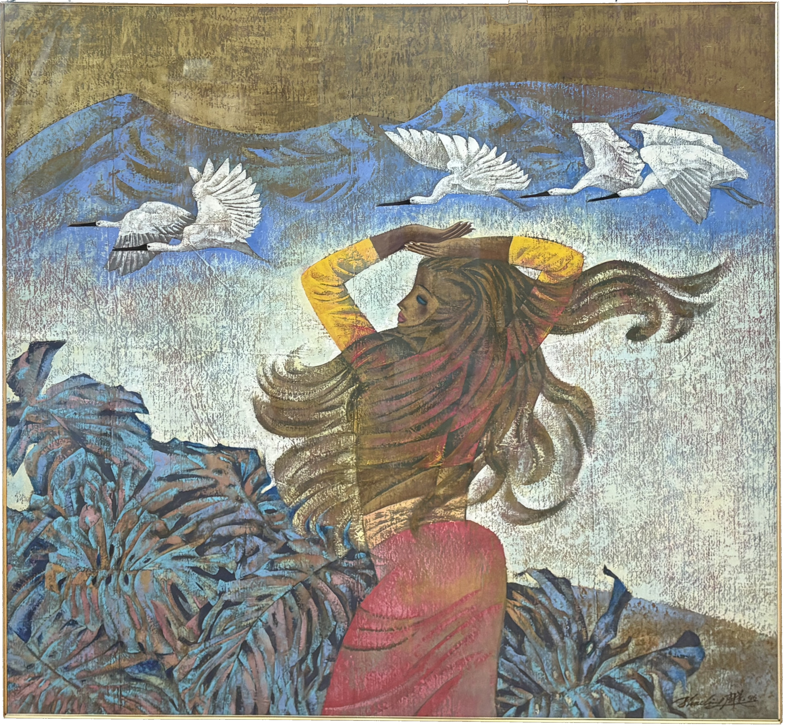 In 1973, she finally returned to Beijing to be reunited with her husband and child who was born in 1968. The child had been kept in Beijing with grandparents because Zhou Ling had no facilities to care for the baby where she worked. In 1974, Zhou Ling became an art teacher at the Central Institute of Nationalities in Beijing where she taught many students of the minority nationalities among whom she had lived in Yunnan Province. Zhou Ling has been influenced by ancient frescoes, painted pottery, and sculptures. She paints beautiful, earth mother-type women. Large and powerful, they more than confirm Chairman Mao's maxim that "women hold up more than half the sky." In 1991, Zhou Ling traveled to Hawaii. She had been commissioned to do a series of paintings for the Grand Wailea Resort & Spa. Zhou Ling was overwhelmed by the natural beauty of Maui. The tropical environment reminded her of earlier life in the verdant jungles of Yunnan Province. The landscape, its flora and fauna, and people who were Polynesian in appearance brought back memories of the ethnic minority groups of her homeland.