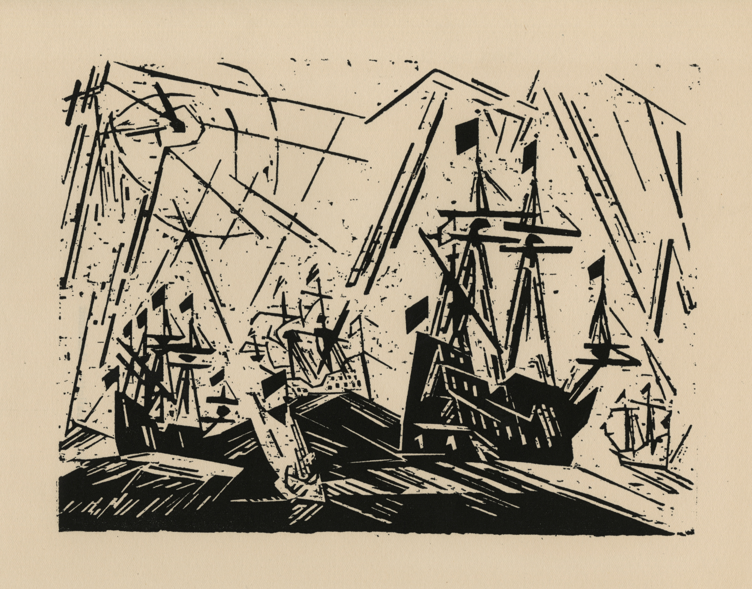 In addition to drawing, painting, woodcutting, and printmaking, Feininger created art with painted toy figures being photographed in front of drawn backgrounds.