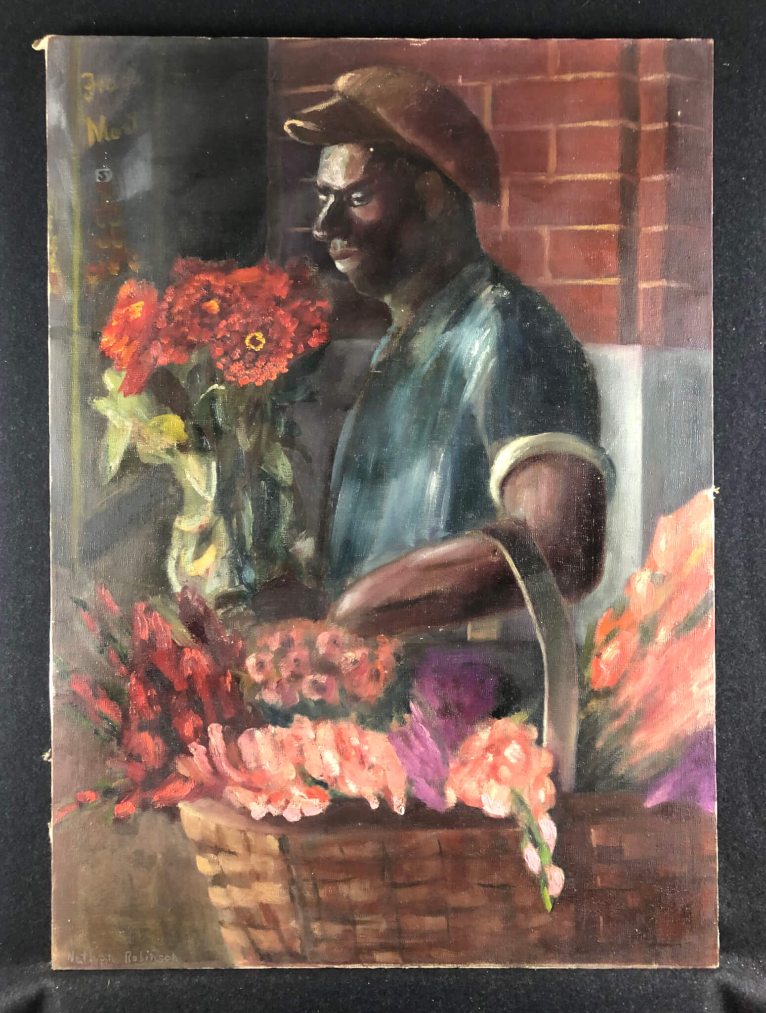 NotesNathan Robinson was born in Richmond, Virginia, in 1914. He had his first art training at William and Mary College Extension Division. Later he attended the National Academy of Design in New York and studied privately with Dimitri Romanovsky, noted portrait painter. After three years in New York, he returned to Richmond and ran an art school for eleven years. Then, for the health of his son, he moved the family to Arizona where he was associated with the Desert House in Tucson. His early work largely reflect African American life in Richmond VA in the 1940s and 50s.