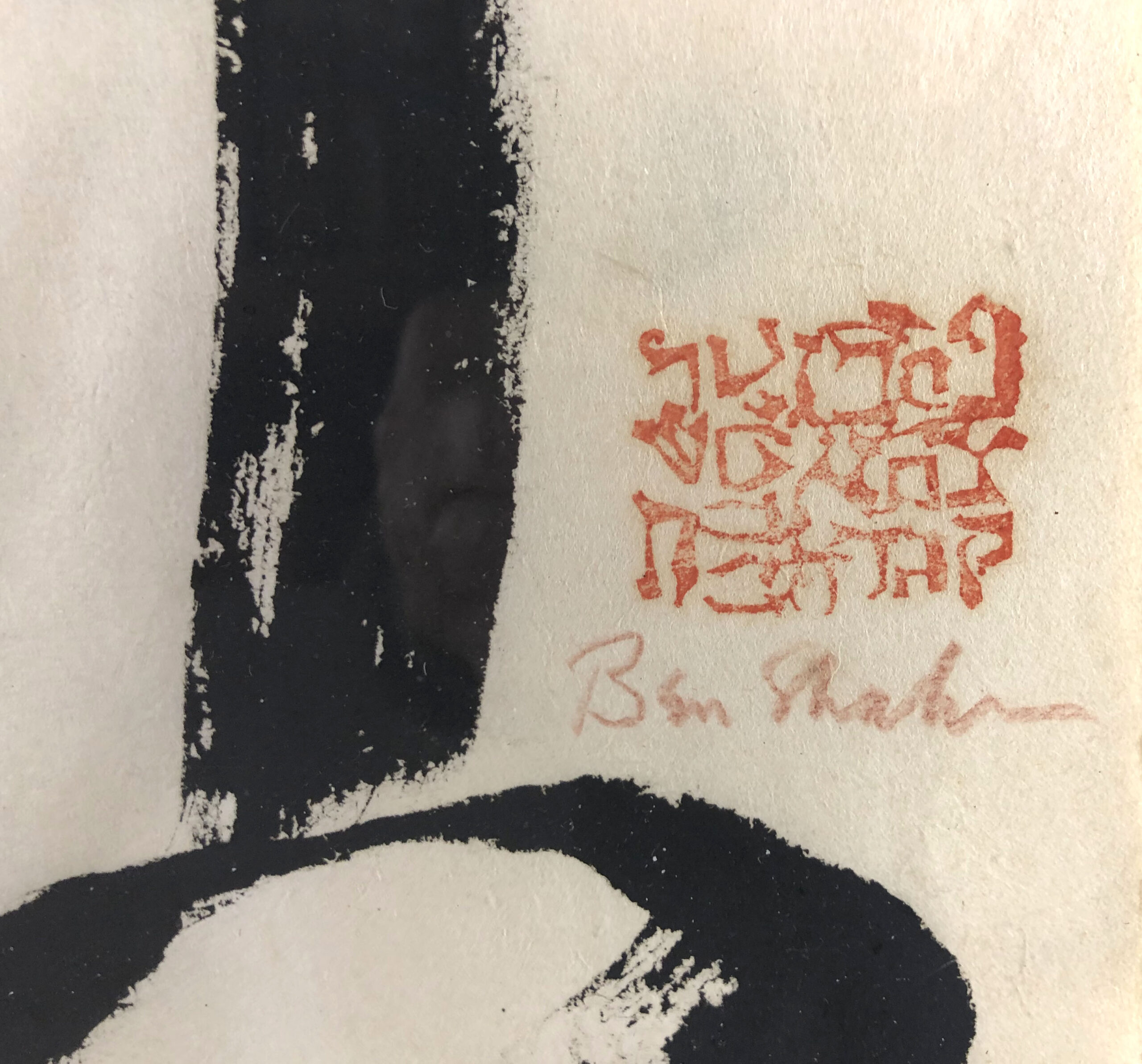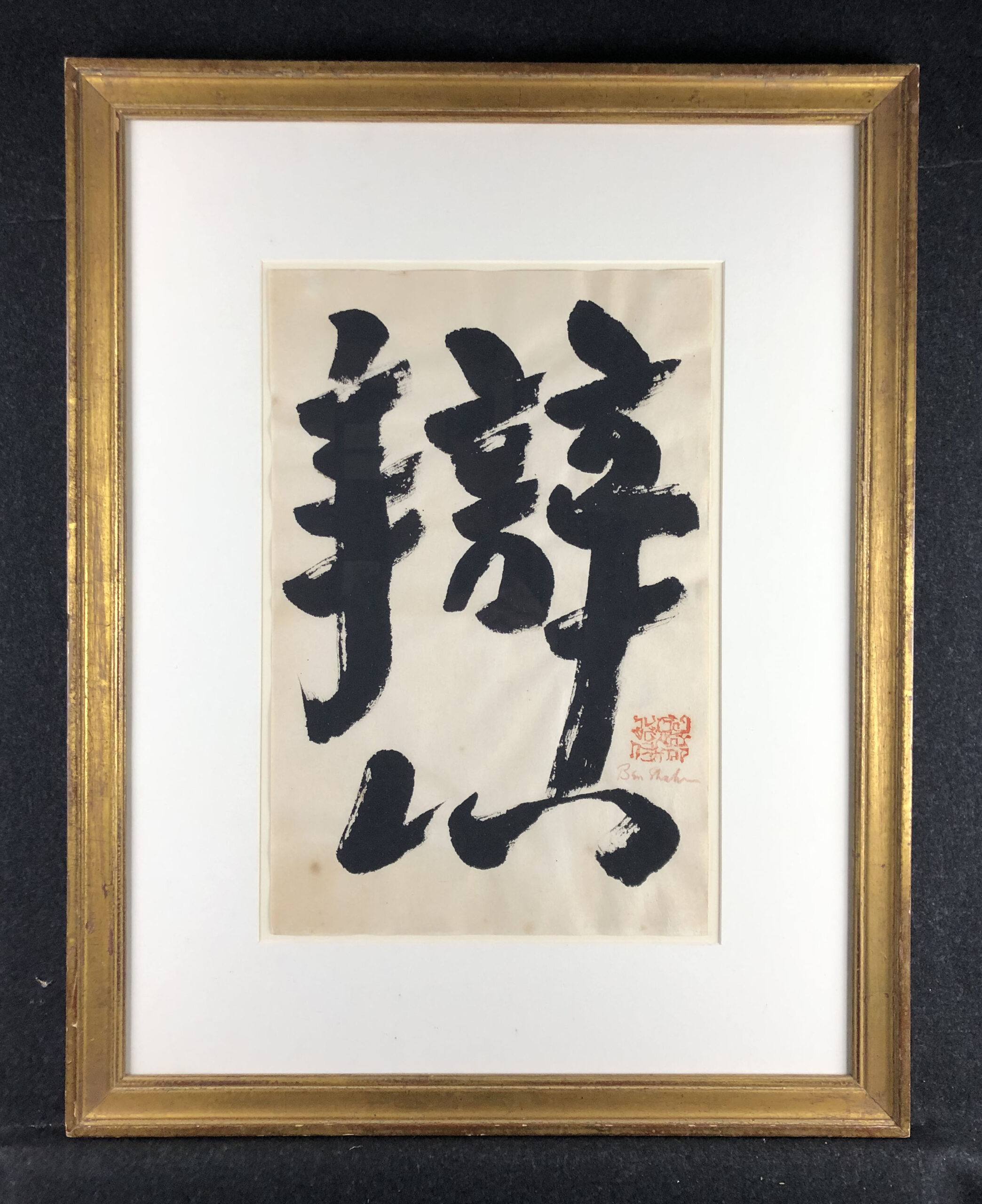 Brush and ink Kanji characters for “Ben Shahn”, signed with brown crayon lower right and Shahn’s red ink chop above the signature.
