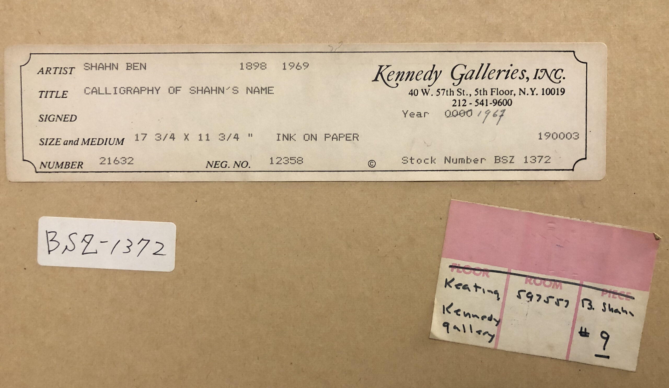 Ben Shahn visited Japan in 1960. During this visit, he captured over 300 photographs, many of which were later showcased in exhibitions such as "Ben Shahn: Cross Media Artist/Photographs, Paintings and Graphic Arts" held at The Museum of Modern Art, Hayama in 2011. This work is one of several calligraphic works created during this visit. The Kennedy Galleries label on the verso erroneously dates the work to 1967.
