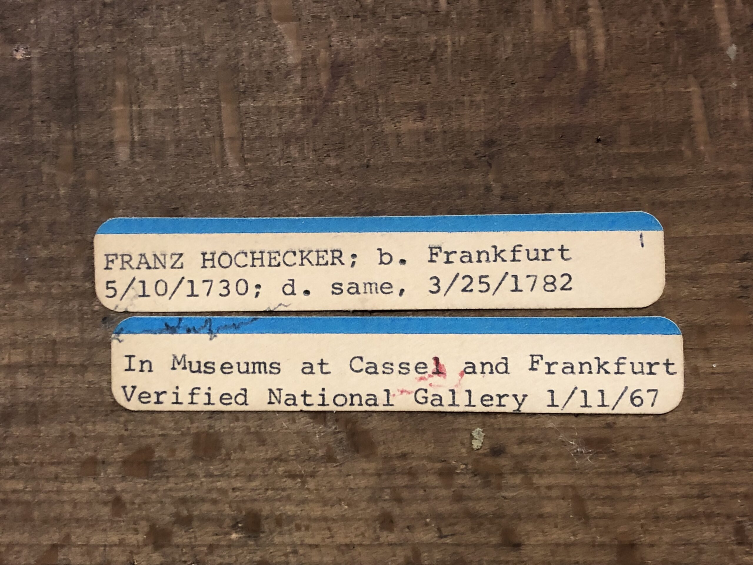 NotesHochecker was a landscape painter. In 1744 he married the sister of the painter Christian Georg Schütz the Elder. In the workshop of his brother-in-law, he became his employee. As a test piece created in 1760 for the Frankfurt Council he painted a view of Frankfurt, for which he received citizenship. Hochecker was influenced by Schütz, who for his part, drew inspiration from Dutch models and Italian Vedutists as well as from Herman Saftleven the Younger's (1609 - 1685) Nachbarocke’s atmospheric ideal landscapes, Castles, and ruins.