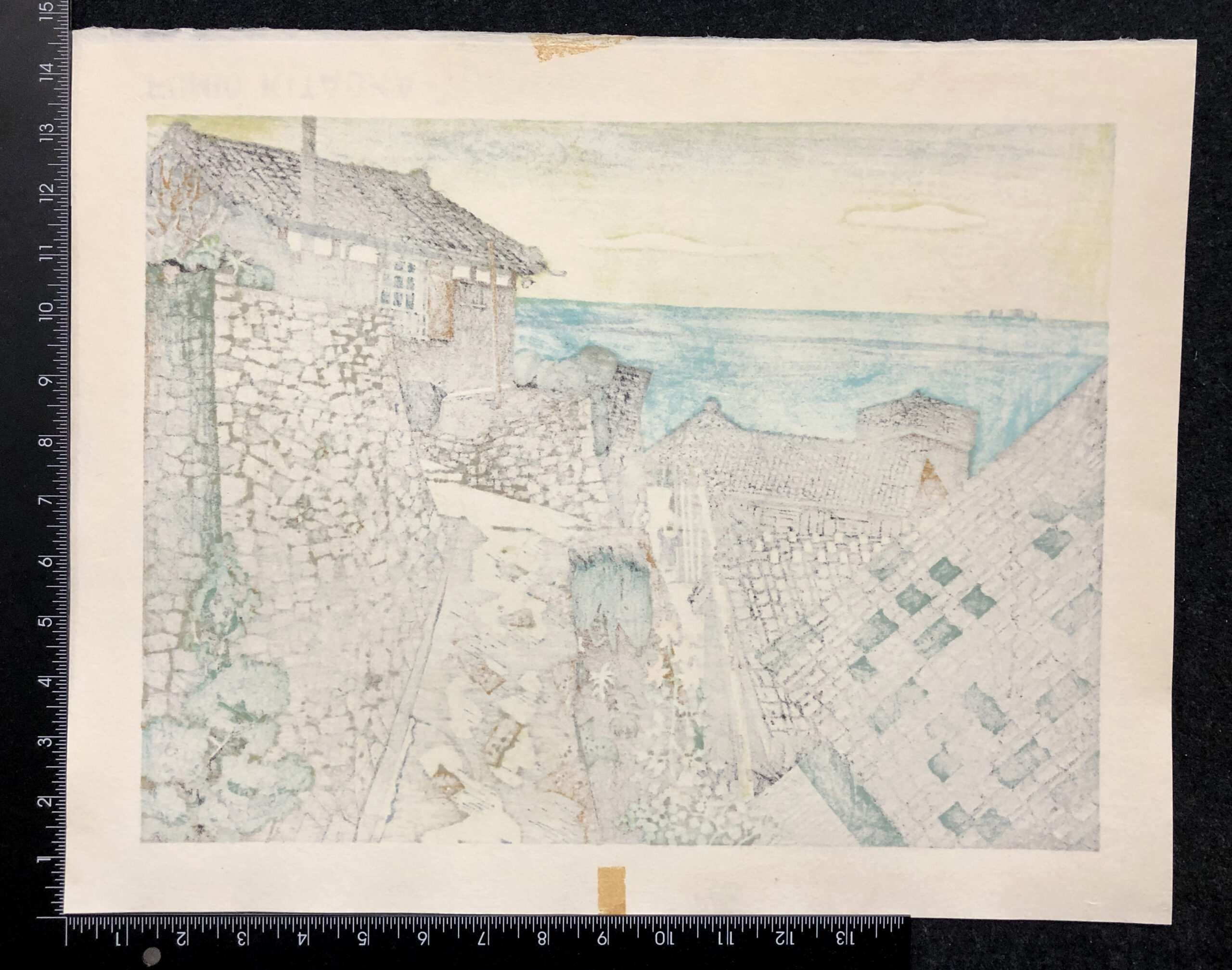 After returning to Tokyo he attended the evening classes of one of Japan's most influential woodblock artists, Koshiro Onchi (1891-1955) joining Onchi's First Thursday Society and contributing prints to its publication Ichimokushū in 1947 and 1948. The following year Kitaoka created the series The Face of Tokyo, five portfolios of prints documenting the beginning resurgence of post-war Japan. [See this collection's print Around Ochanomizu (Kanda River).] In 1955, Kitaoka moved to Paris to study wood engraving techniques at the Ecole des Beaux Arts. He was not interested in formal theories of art, but he sought to understand the work of Western painters such as Van Gogh, Cezanne, Matisse and Picasso.