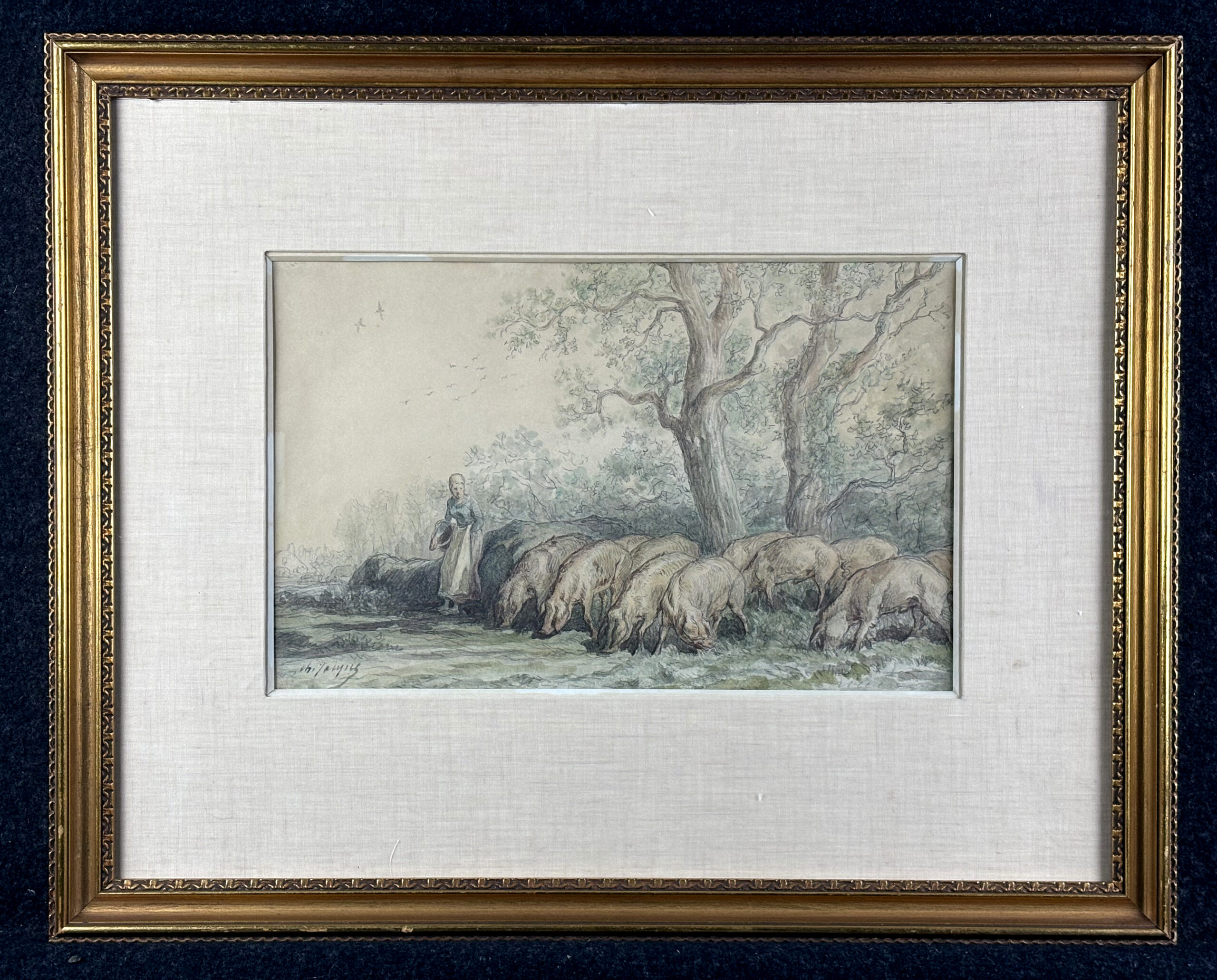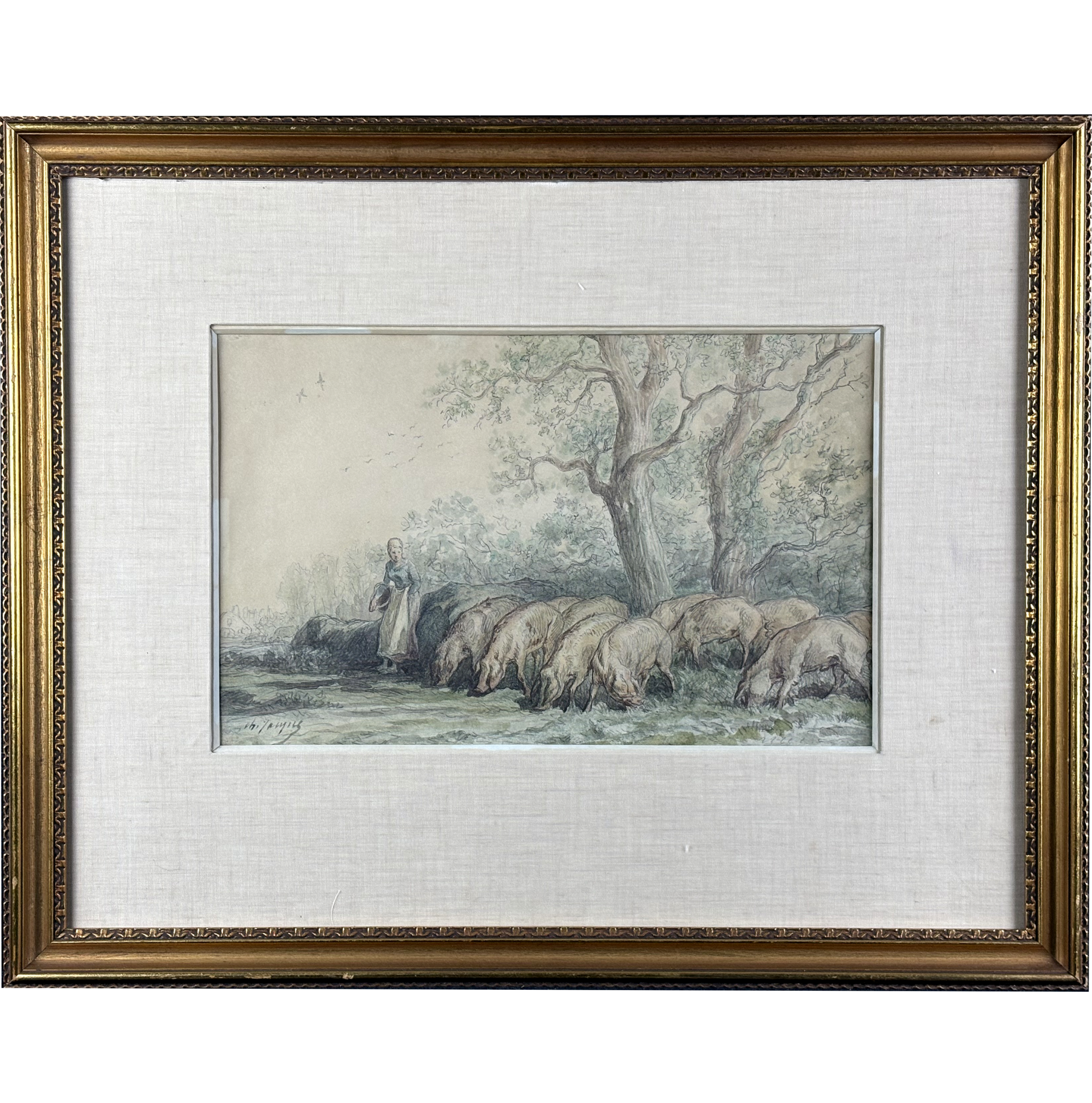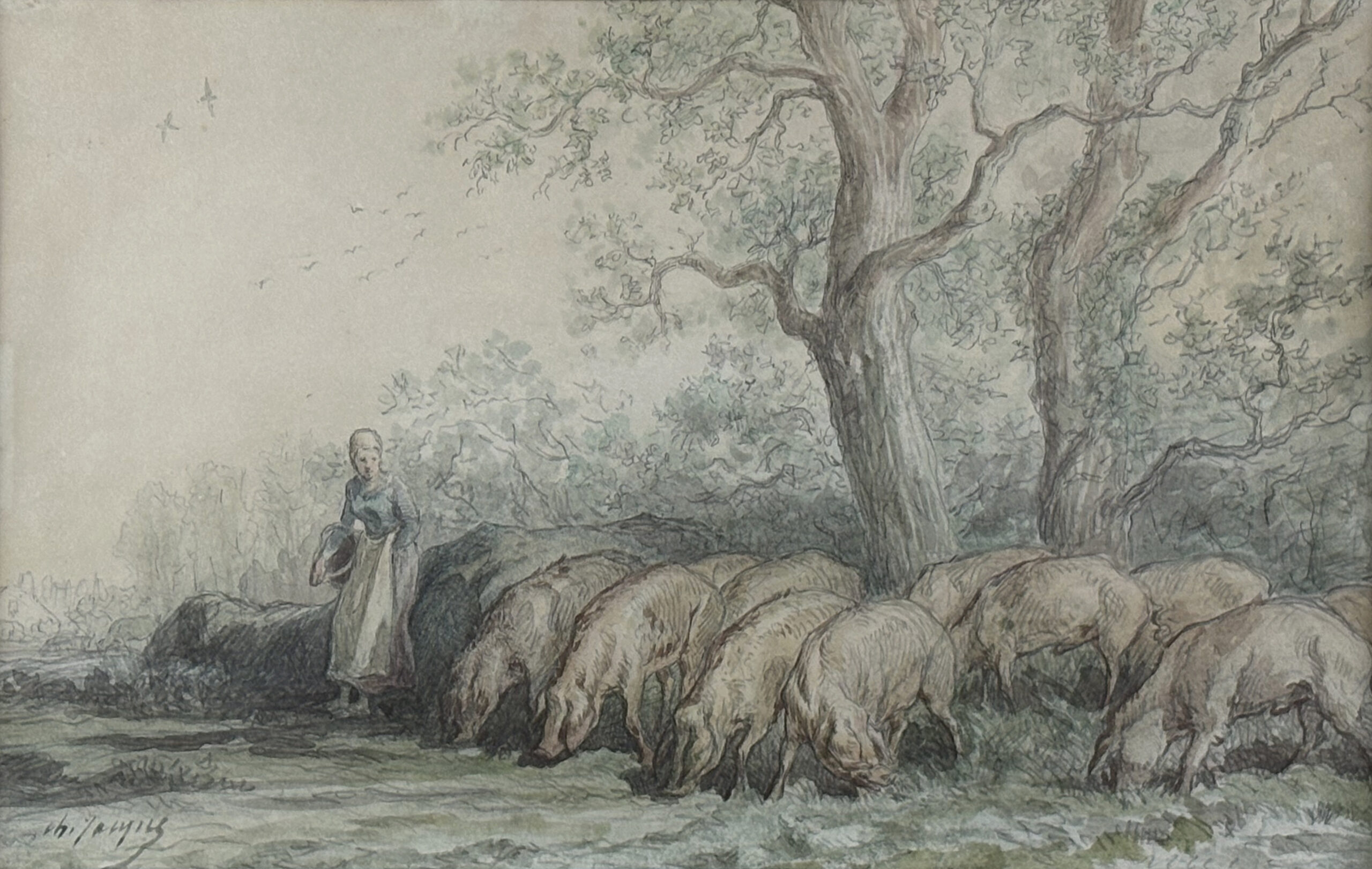 Fleeing the Cholera epidemics that besieged Paris in the mid-nineteenth century, Charles Jacque relocated to Barbizon in 1849 with Millet. There, he painted rustic or pastoral subject matter: shepherds, flocks of sheep, pigs, and scenes of farm life. In addition to painting, Jacque was also famous for his etchings and engravings. He, along with Félix Bracquemond and Felix Buhot, is credited with the nineteenth-century revival of seventeenth-century techniques. He began his career as an engraver around 1841 by publishing a series of etchings with Louis Marvy. He followed this work with a series of engravings based on the works of Adriaen van Ostade, after which he began to create original engravings / artworks. Charles Baudelaire said of him, "Mr. Jacque’s new reputation will continue to grow always, we hope. His etchings are very bold and his subject matter is well conceived. All that Mr. Jacque does on copper is filled with a freedom and a frankness which reminds one of the Old Masters."