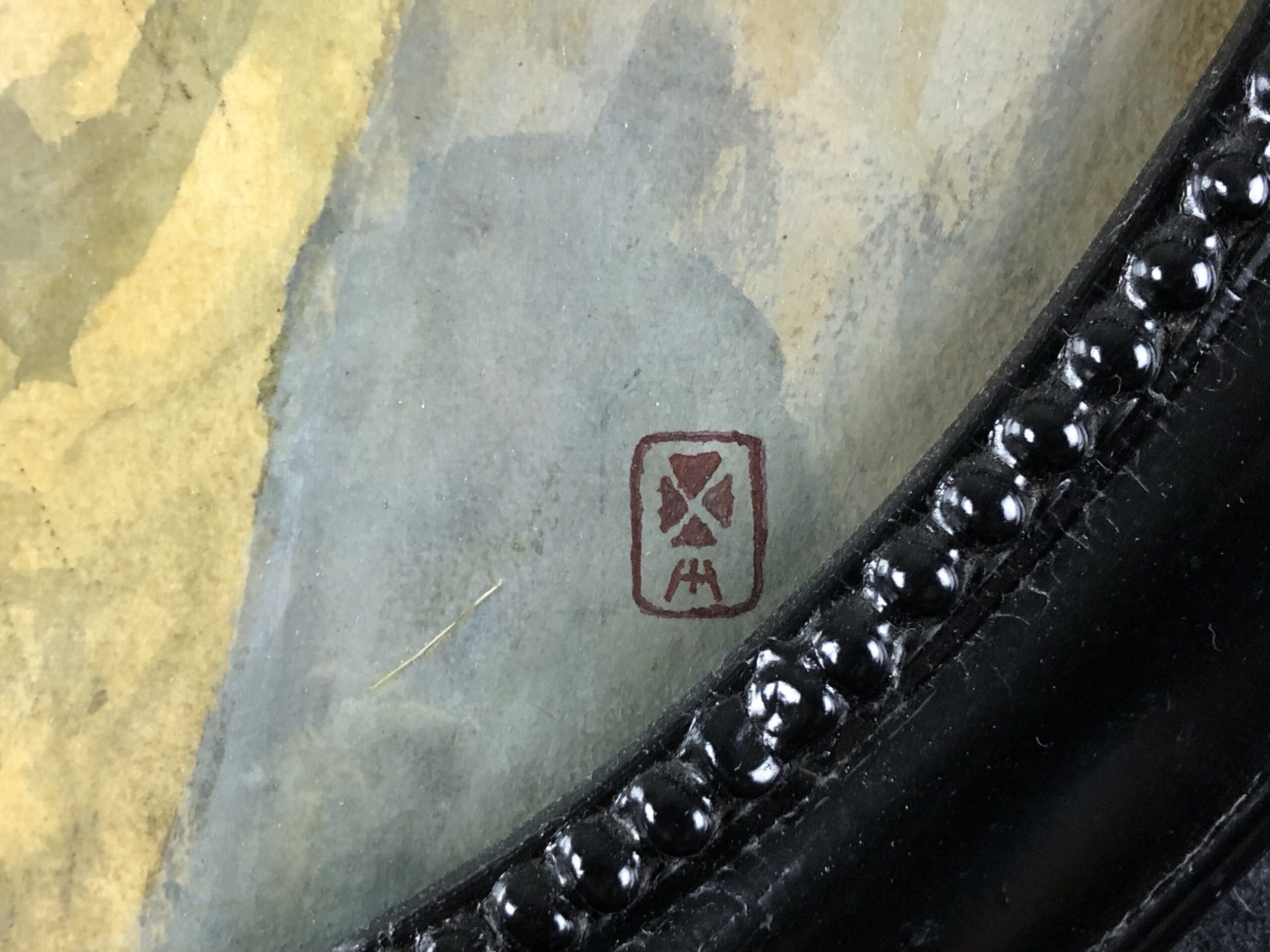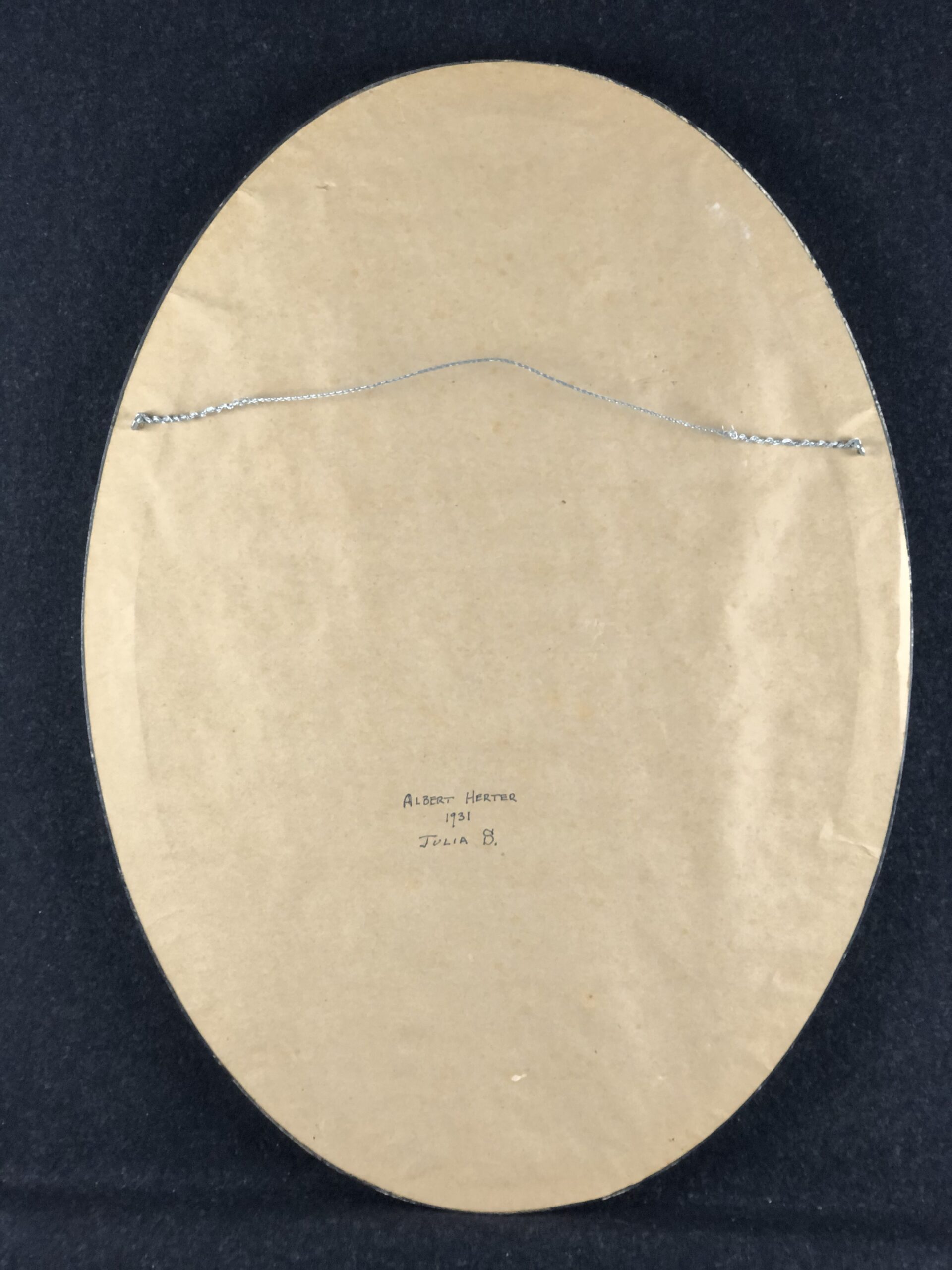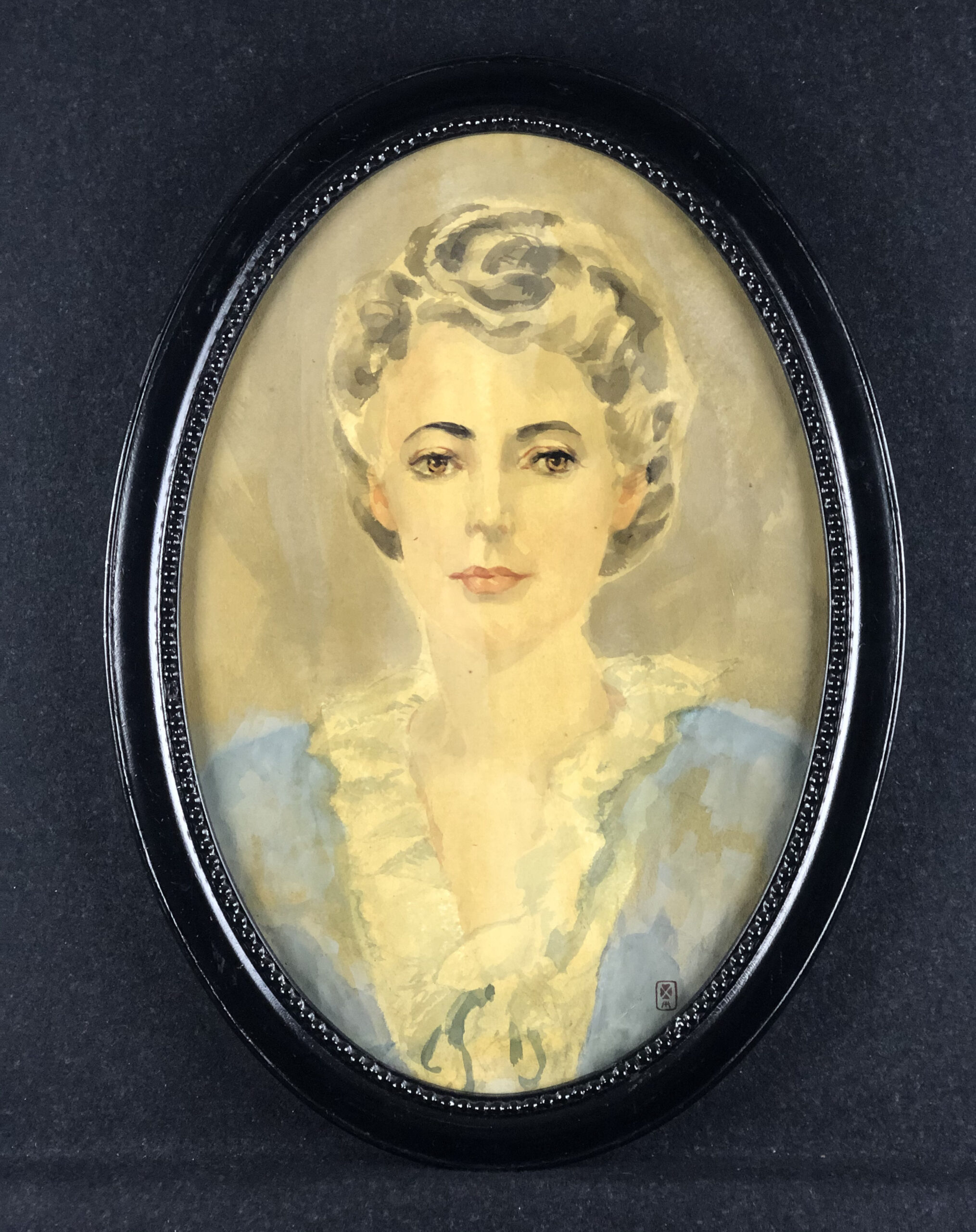 Watercolor on wove paper in oval frame, signed with the artist’s cypher stamp.