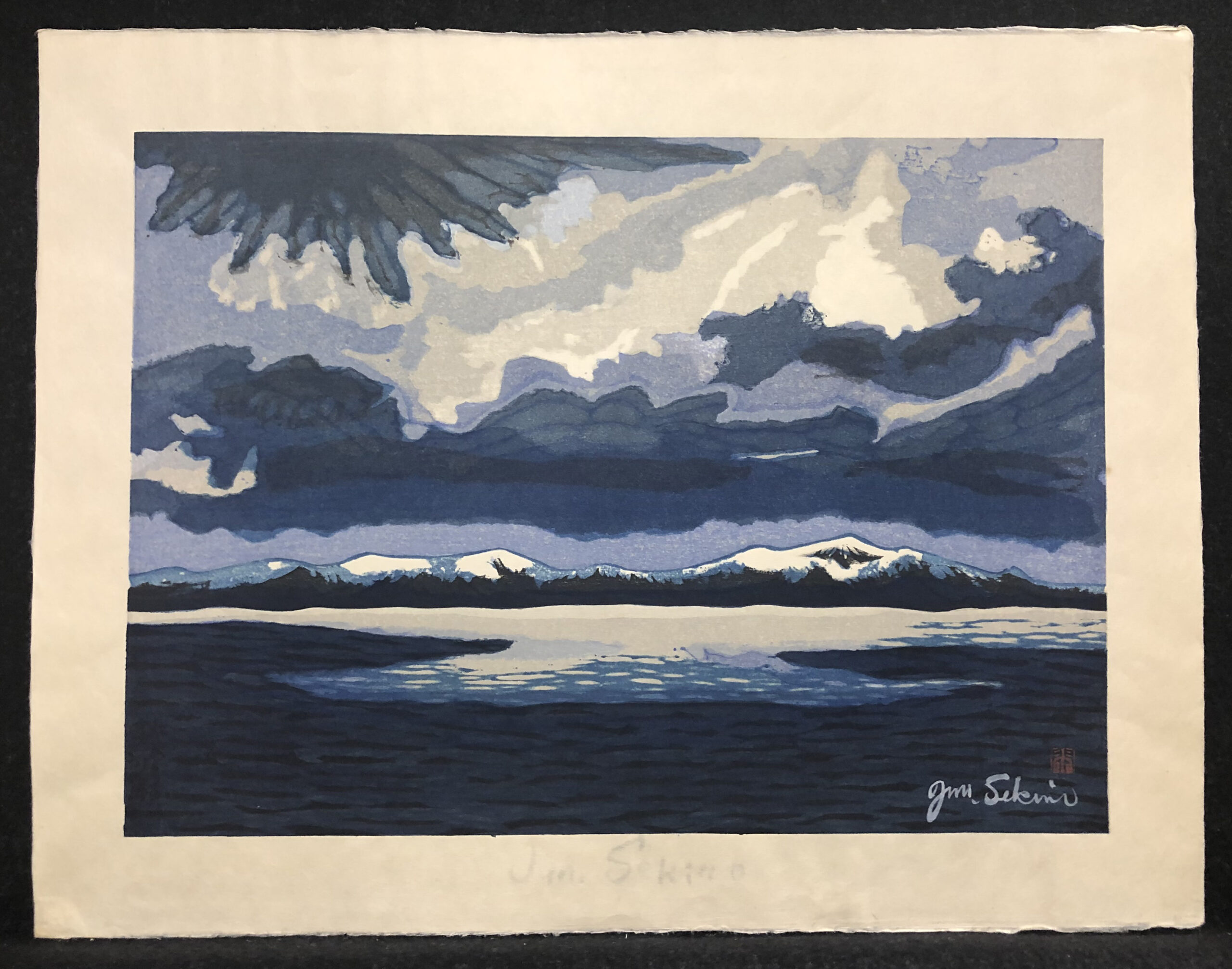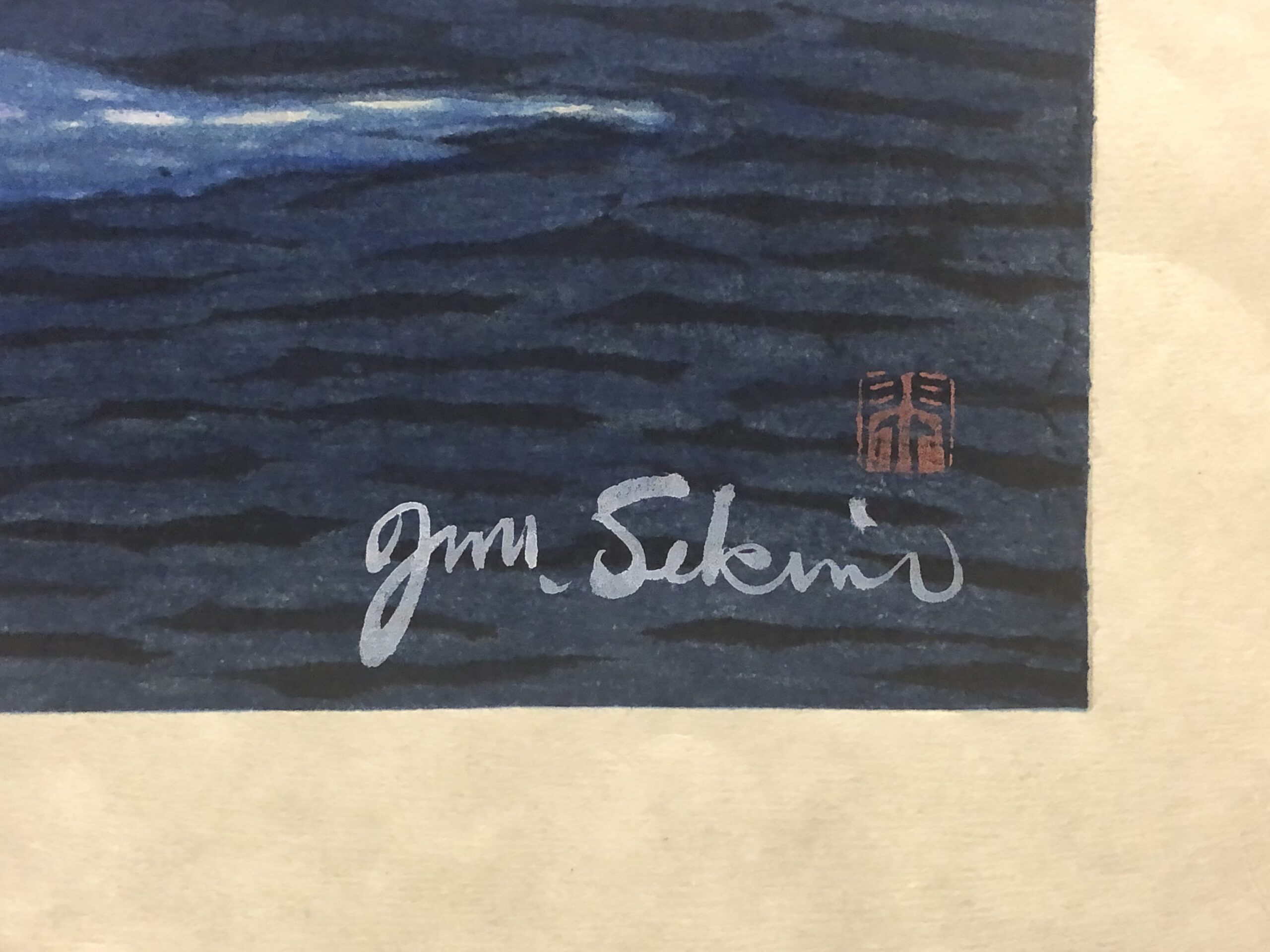 Polychrome woodblock print, signed boldly in white printer’s ink in the image and with the artist’s red ink chop, printed in shades of blue and tan on hand-made Japan kozo paper watermarked “Jun Sekino”. Fine condition. Free shipping to US address.