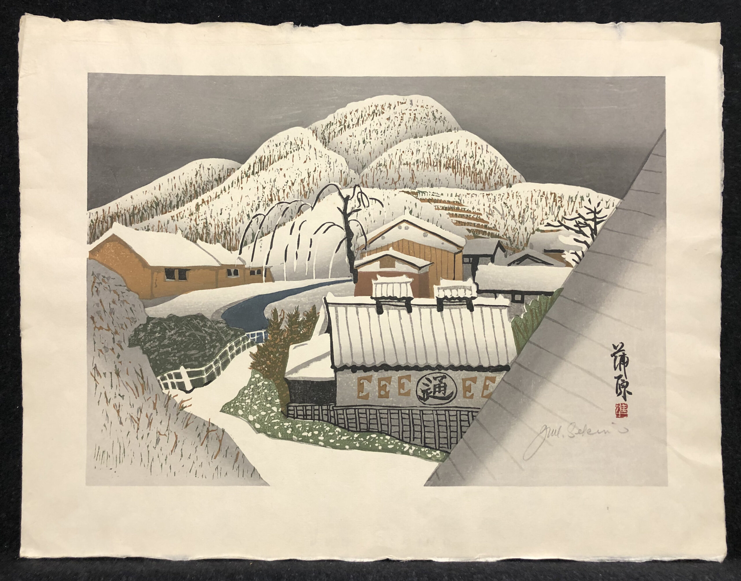Polychrome woodblock print, signed in pencil in the image and with the artist’s red ink chop, printed on hand-made Japan kozo paper watermarked “Jun Sekino”. Fine condition. Free shipping to US address.