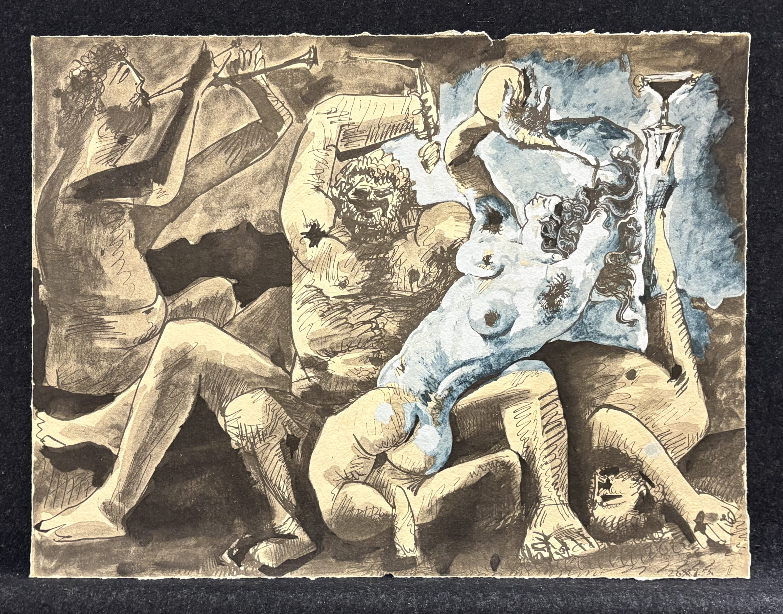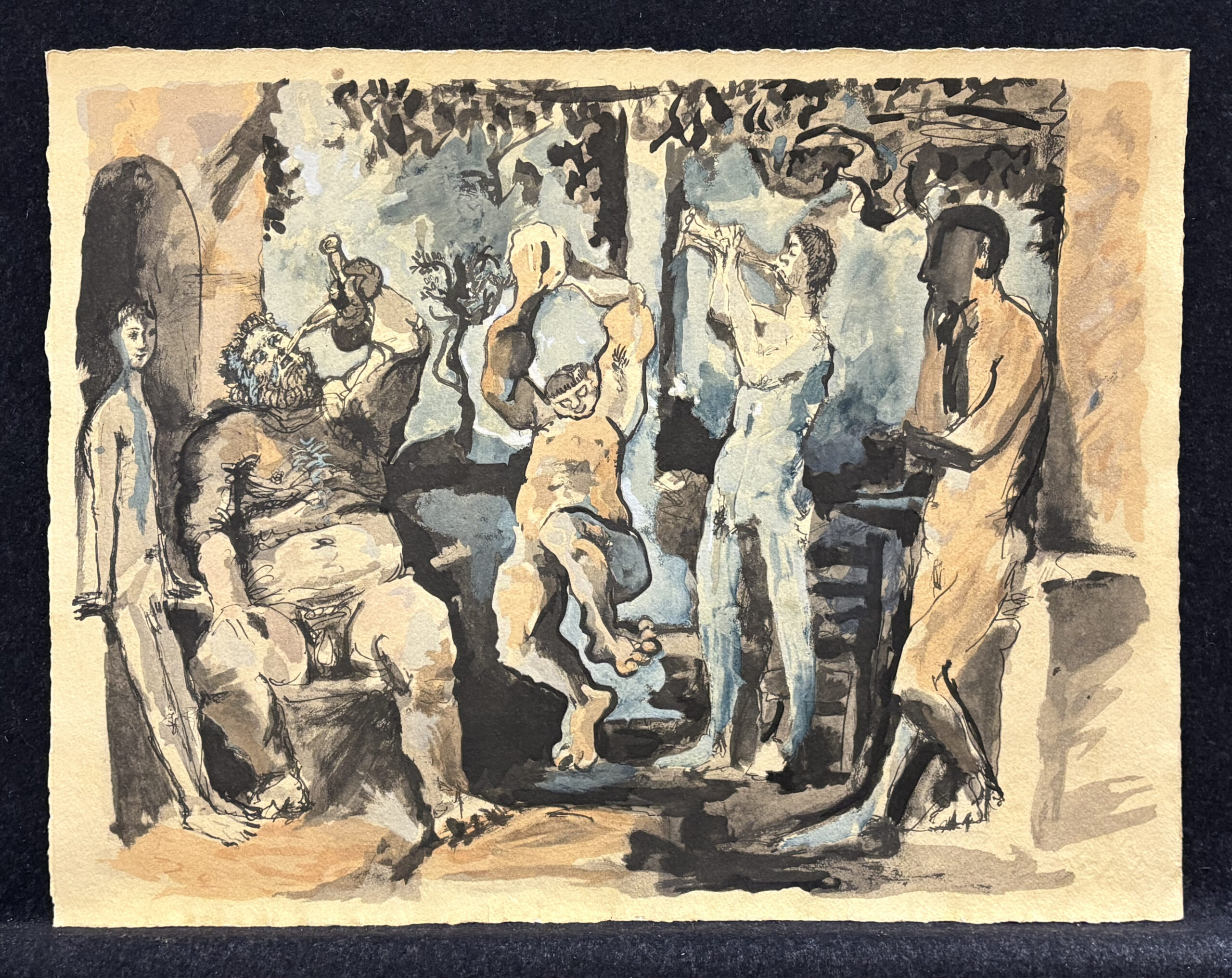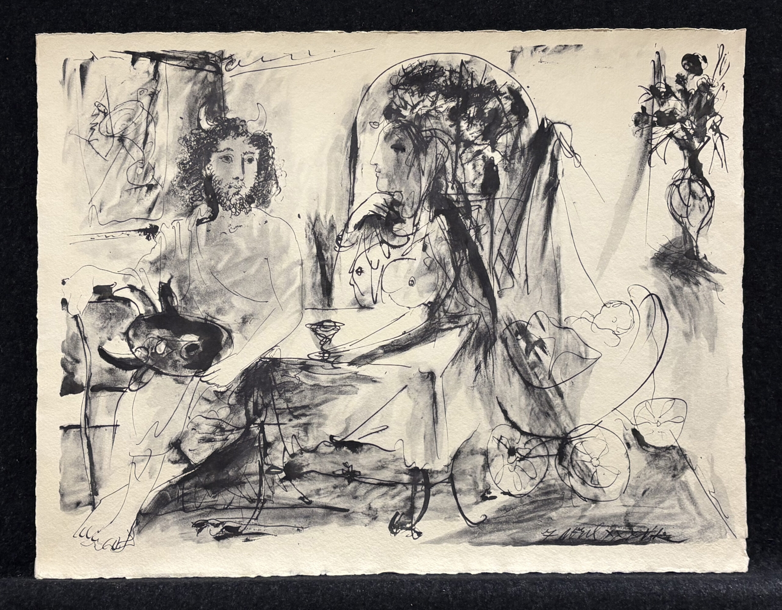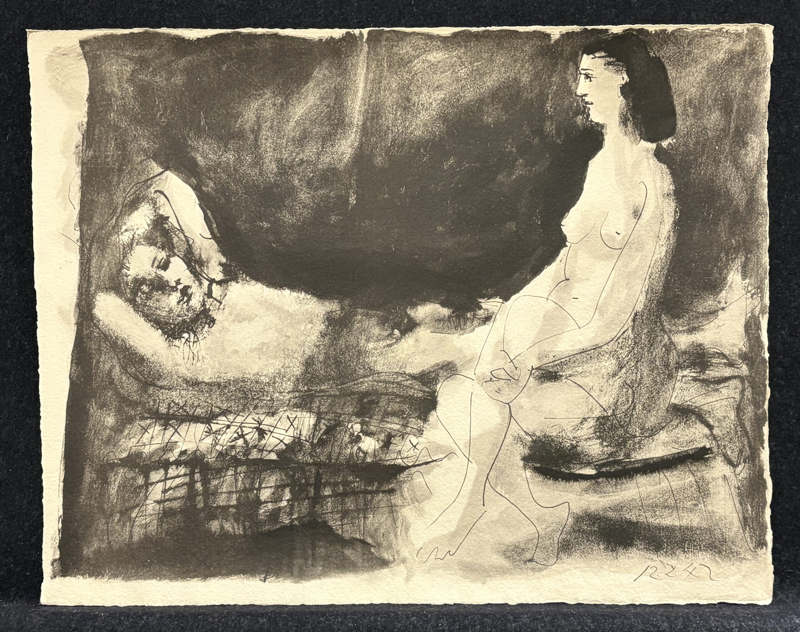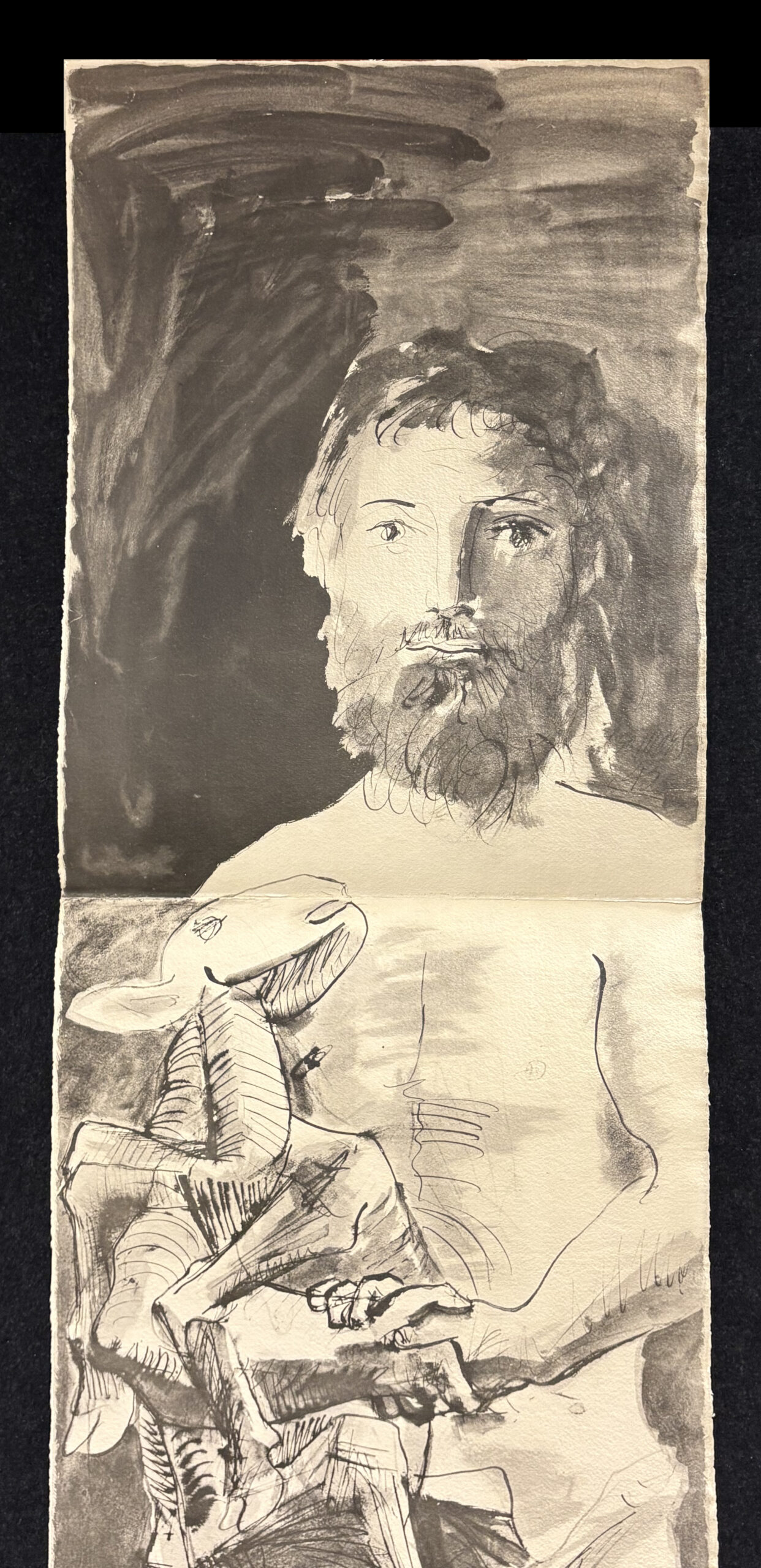 Clamshell portfolio with fifteen (15) collotype lithographs after Picasso drawings, numbered 60 (printed) on the colophon, from the edition of 500, published by Au Vent D’Arles, Saint-Paul-de-Vence, France, 1967.