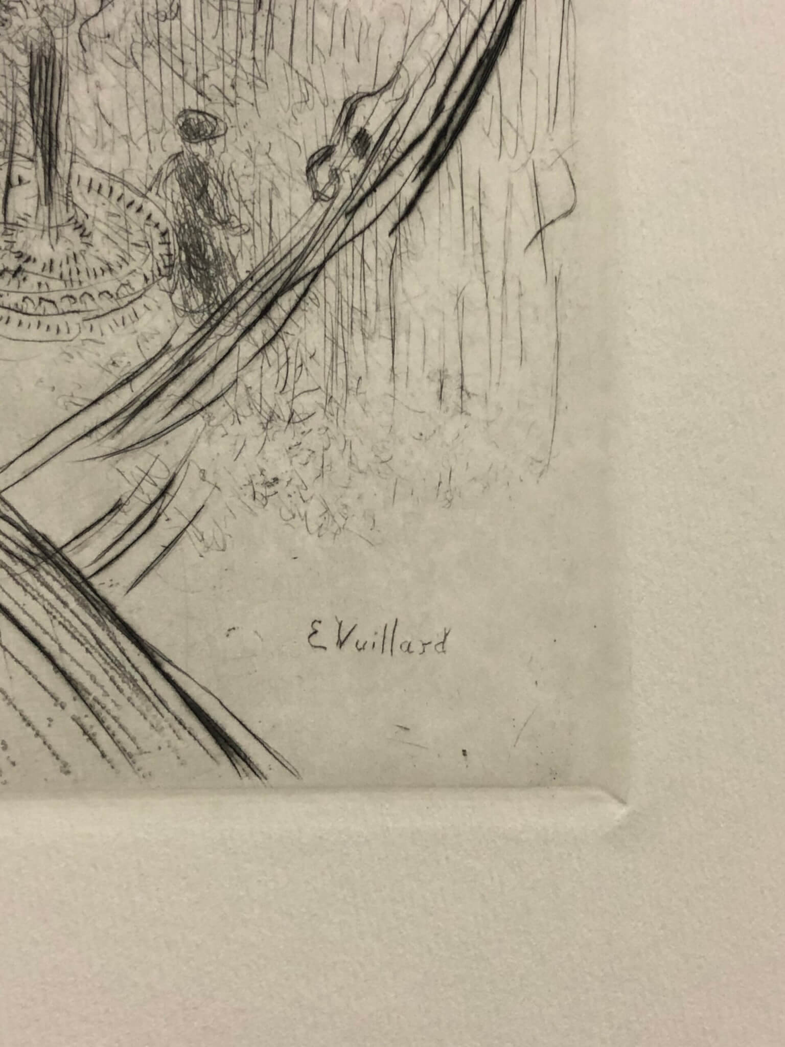 NotesJean-Édouard Vuillard was a French painter, decorative artist and printmaker. From 1891 through 1900, he was a prominent member of the Nabis, making paintings which assembled areas of pure color, and interior scenes, influenced by Japanese prints, where the subjects were blended into colors and patterns. He also was a decorative artist, painting theater sets, panels for interior decoration, and designing plates and stained glass. After 1900, when the Nabis broke up, he adopted a more realistic style, painting landscapes and interiors with lavish detail and vivid colors. In the 1920s and 1930s he painted portraits of prominent figures in French industry and the arts in their familiar settings.