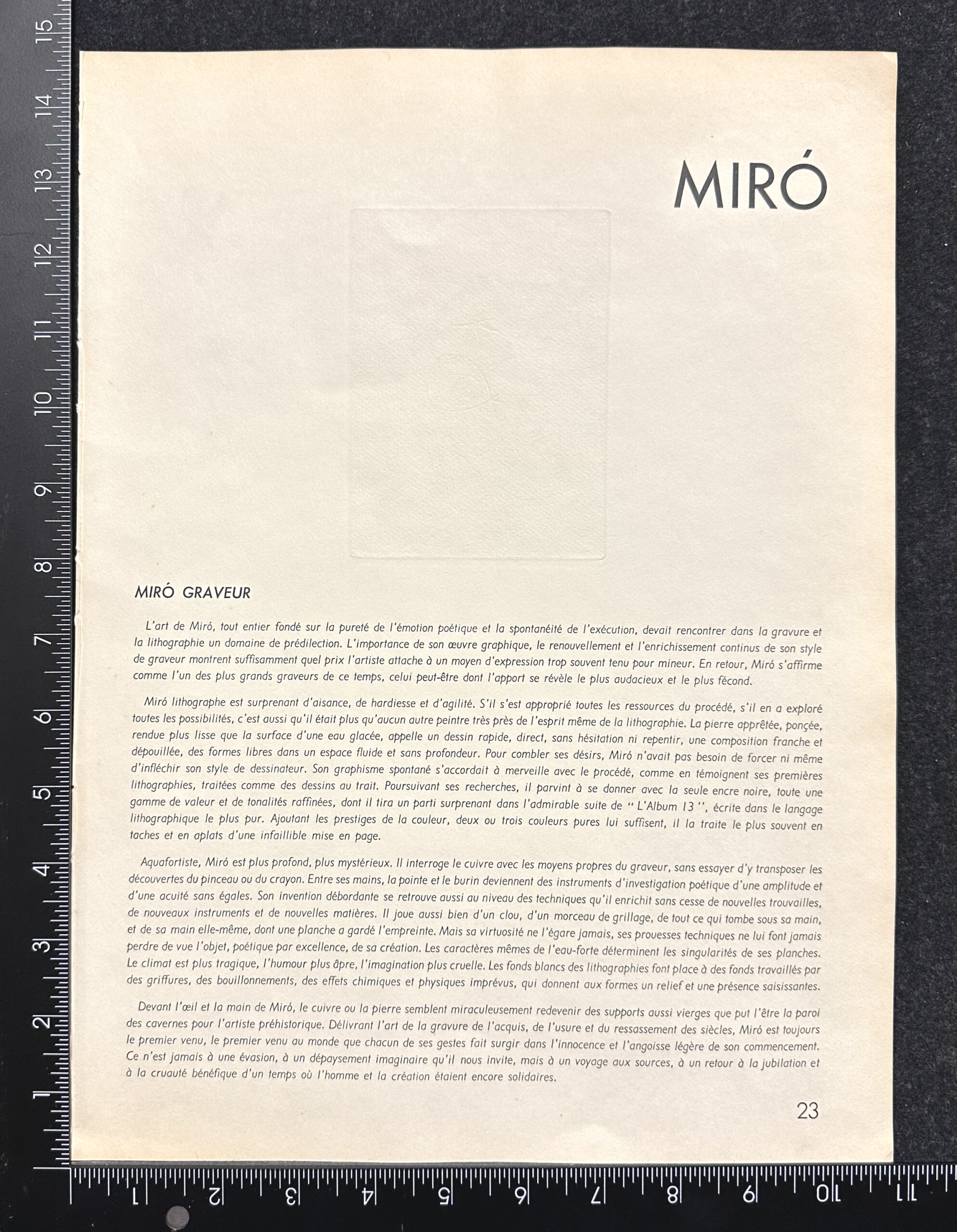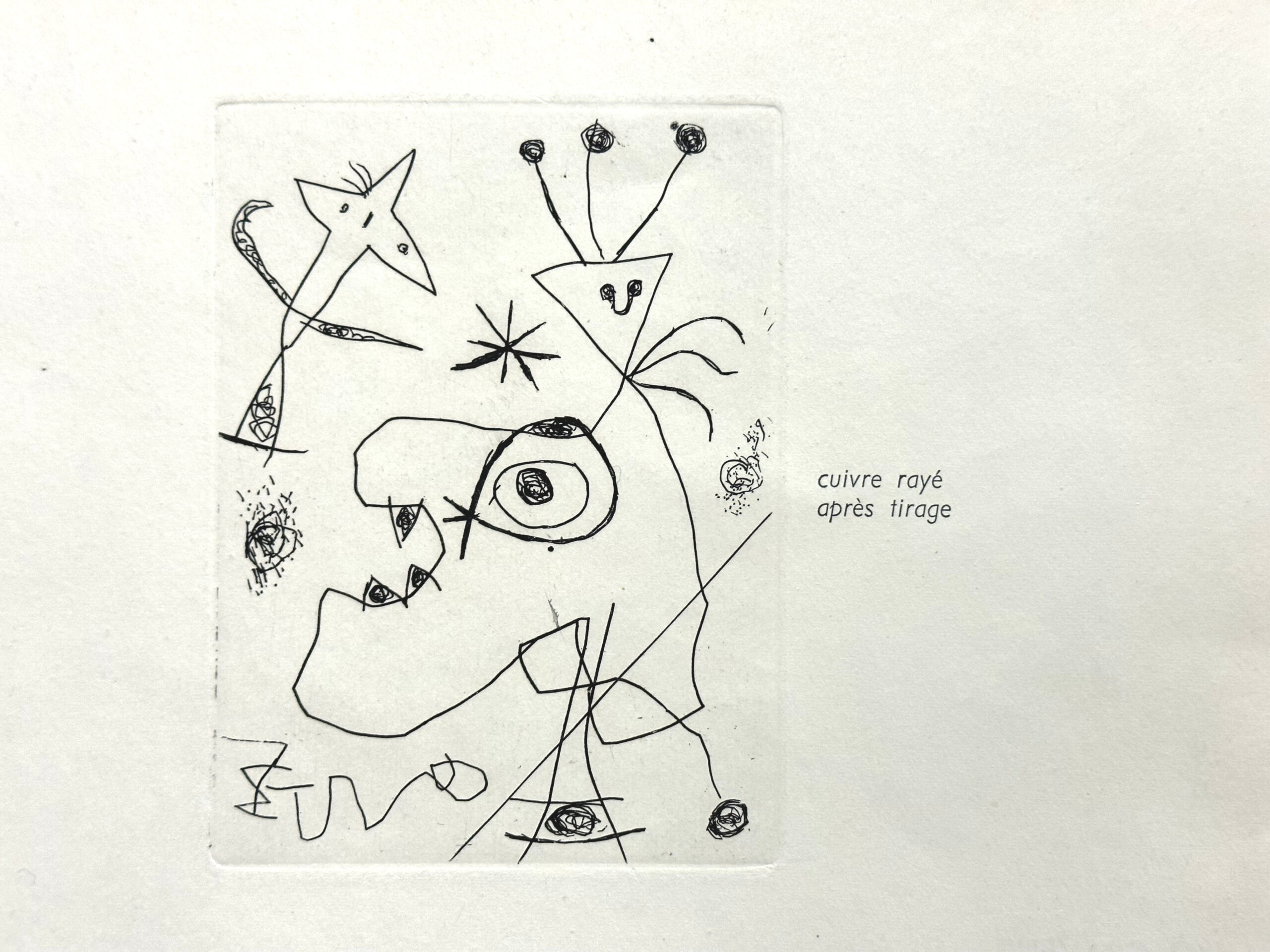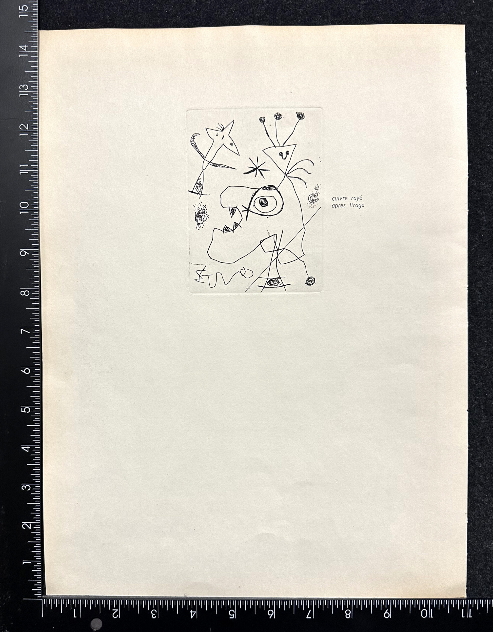 Etching, unsigned, printed on fine-grained, cream wove paper, uncut page as published in Derrier le Miroir, 10 ans d’Editions 1946-1956, Maeght Editeur, Paris, 1956, edition 1000, with letterpress text at right of the impression reading “cuivre raye apres tirage” and letterpress text on verso. Fine condition, full, uncut page. Free shipping to US address.