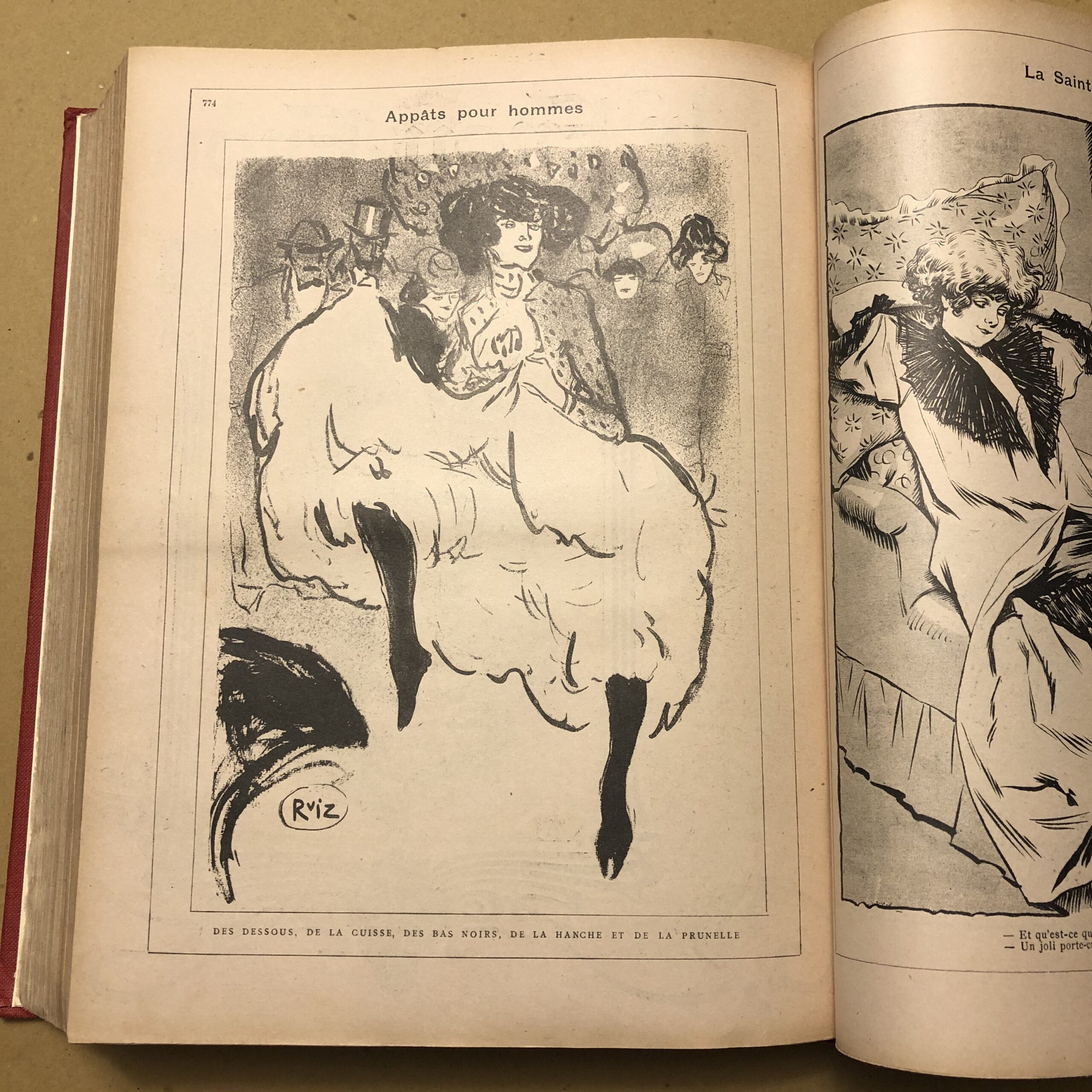 Bound book with two (2) original zincograph plates by Picasso, signed “Ruiz” in the plate, printed on thin, pulp newsprint. The first plate, titled Appats pour Hommes (Bait for Men) is Picasso’s first commercial work, published on page 774 of No. 46, 31 Aug. 1901. The second illustration (page 820) is titled Beuglant et Chahut and shows four (4) vignettes of female dancers.