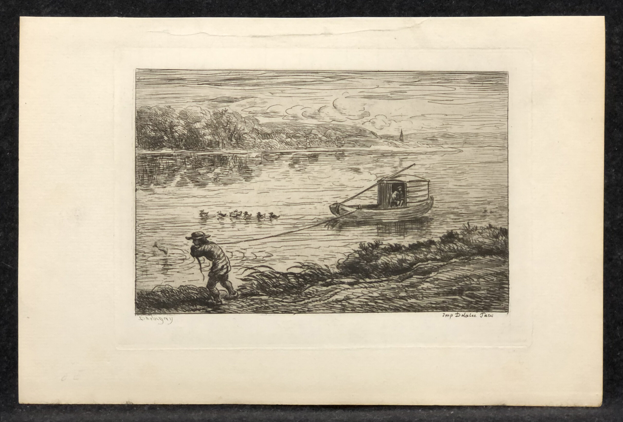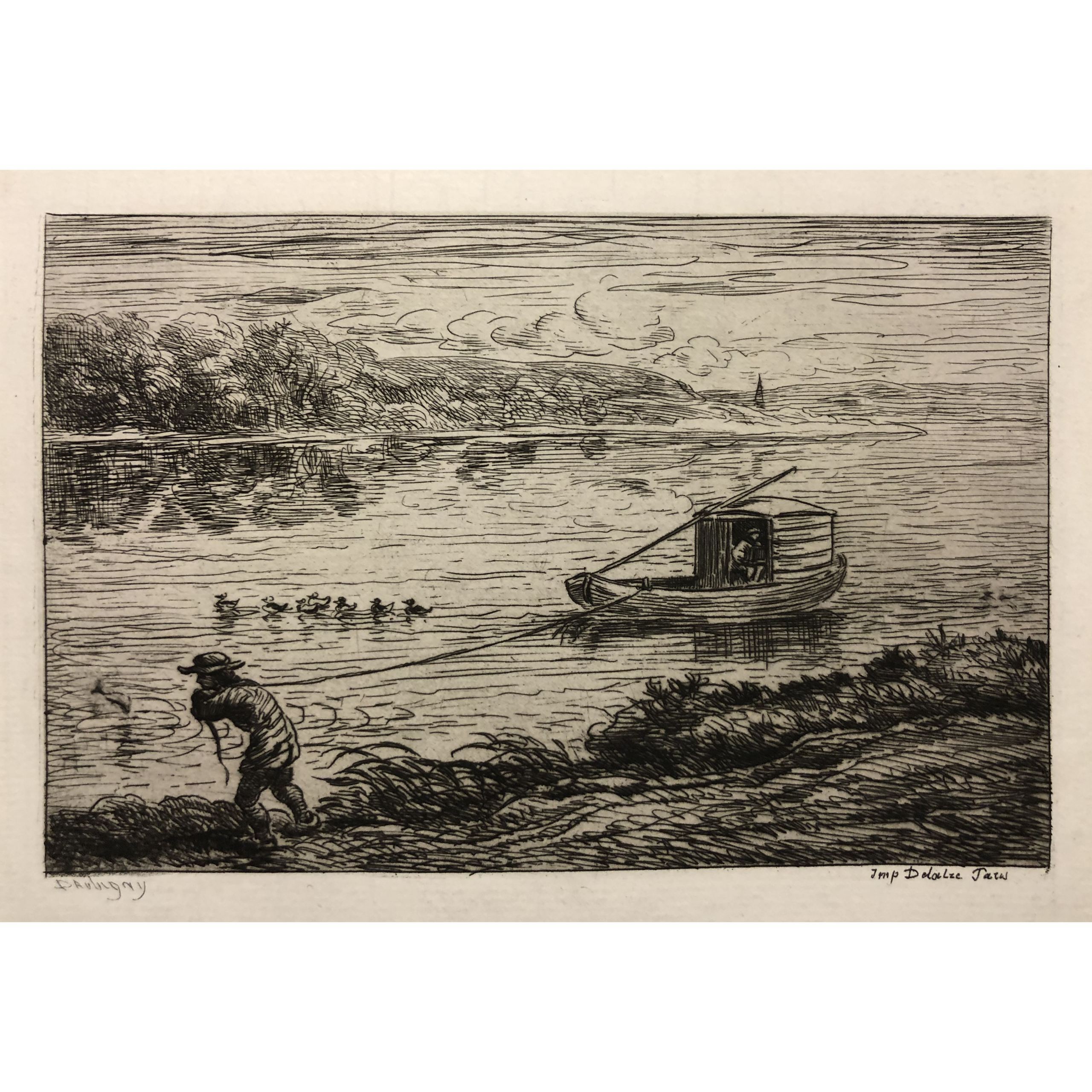 Original etching, not signed, with etched signature at lower left, printed by Auguste Delatre on felt-finish, cream laid paper. Plate 1 from Voyage en Bateau, published by Delatre, Paris, 1862.