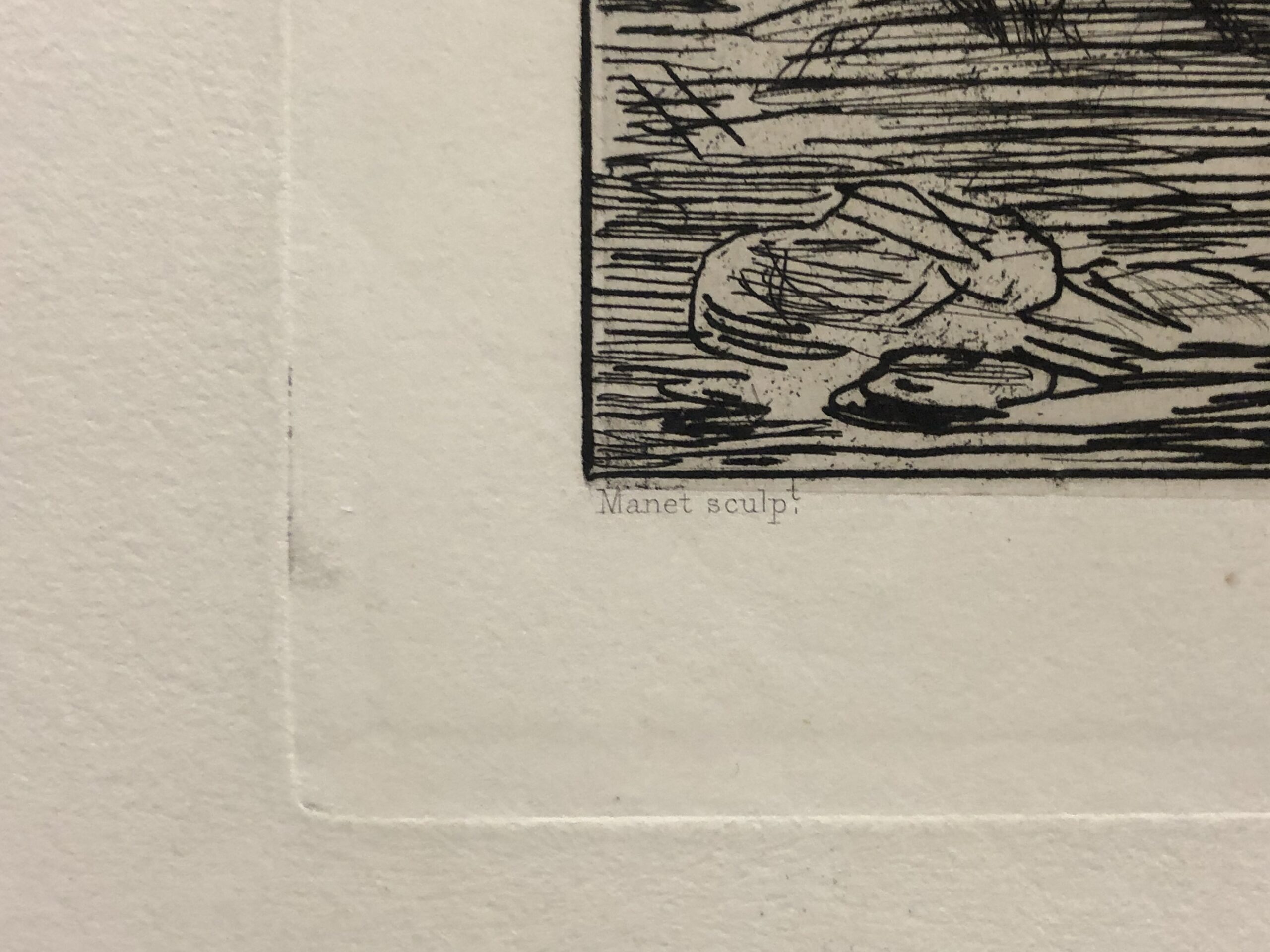 NotesEdouard Manet (1832 - 1883) was one of the most important and innovative artists of his time, a deliciously masterful painter who was skillfully able to translate his art into the various graphic media. A founding member of the Société des Aquafortistes in 1862, and thus actively taking part in the revival of printmaking as an art form in its own right, he was drawn to etching quite early on, with nearly all of his production dating to the 1860s. Although not a technician in the proper sense, he often sought to turn technique to advantage through bold experimentation.