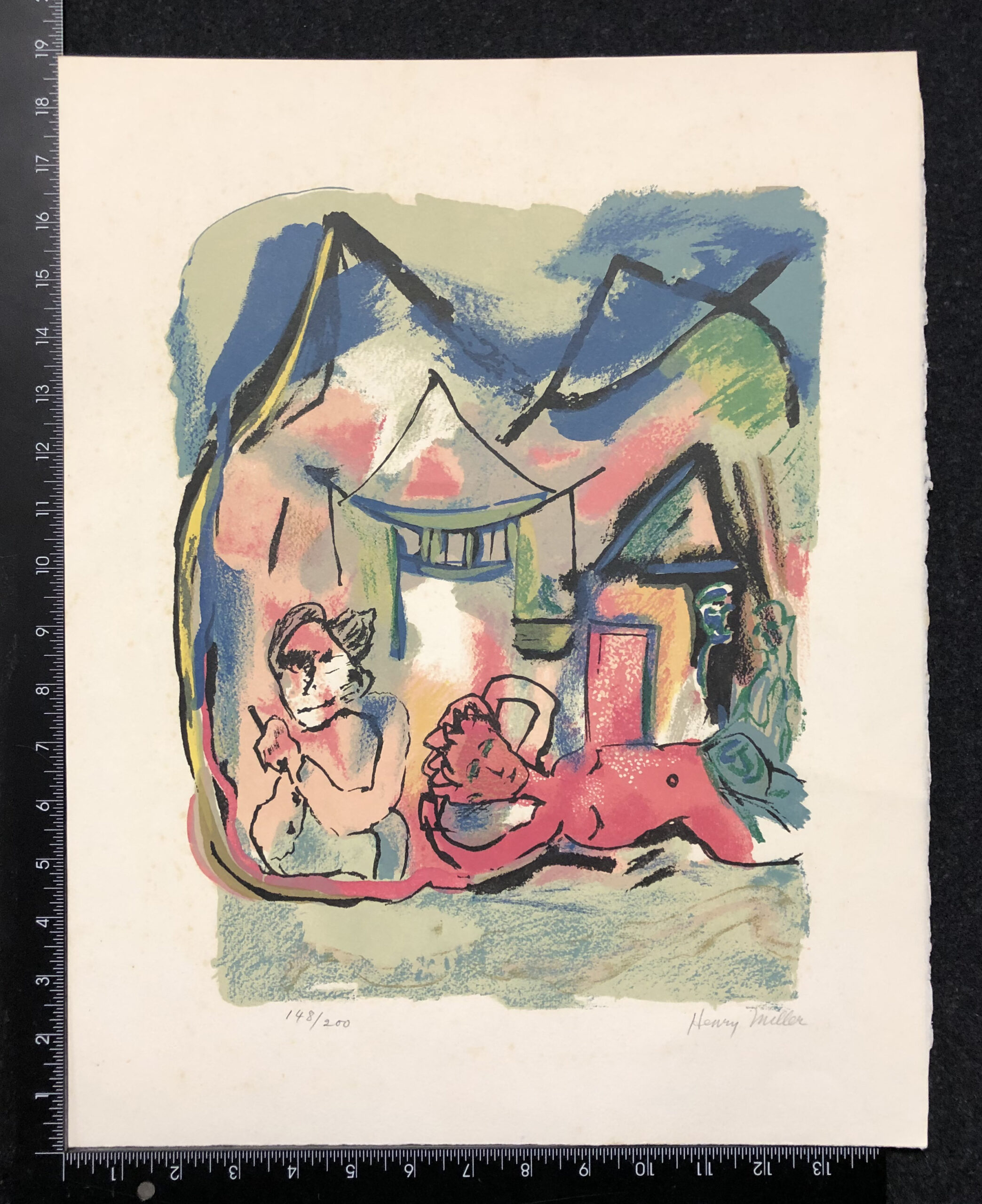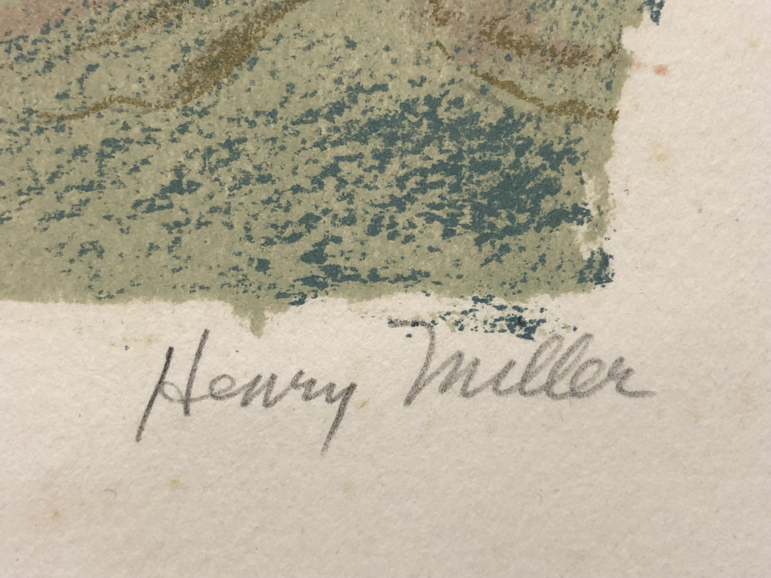 NotesIn addition to his enormous literary abilities, Miller produced numerous watercolor paintings and prints (etchings, lithographs and serigraphs). He was a close friend of the French painter Grégoire Michonze. It is estimated that Miller painted 2,000 watercolors during his life, and that 50 or more major collections of Miller's paintings exist. The Harry Ransom Center at the University of Texas at Austin holds a selection of Miller's watercolors, as did the Henry Miller Museum of Art in Ōmachi City in Nagano, Japan, before closing in 2001. Miller's daughter Valentine placed some of her father's art for sale in 2005.