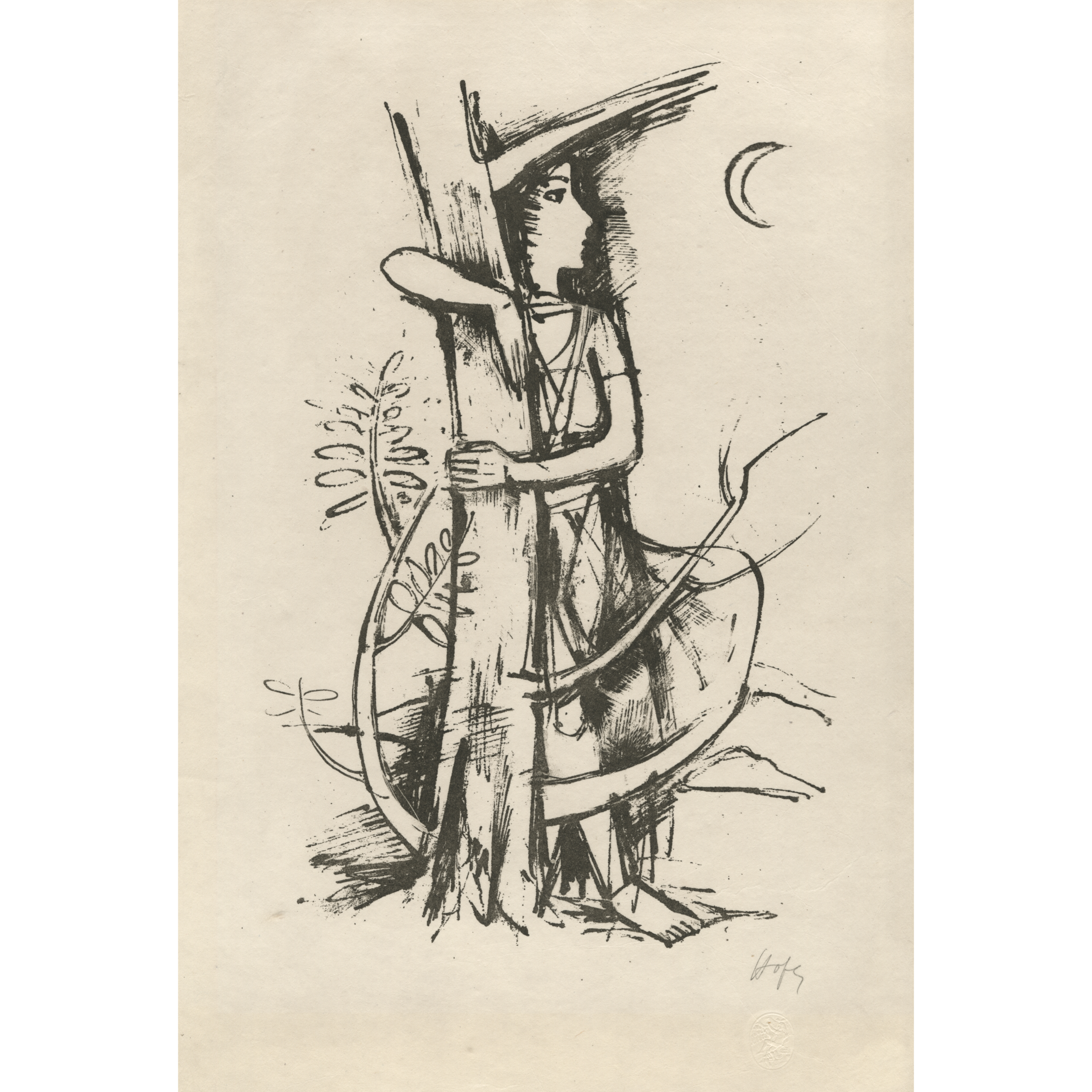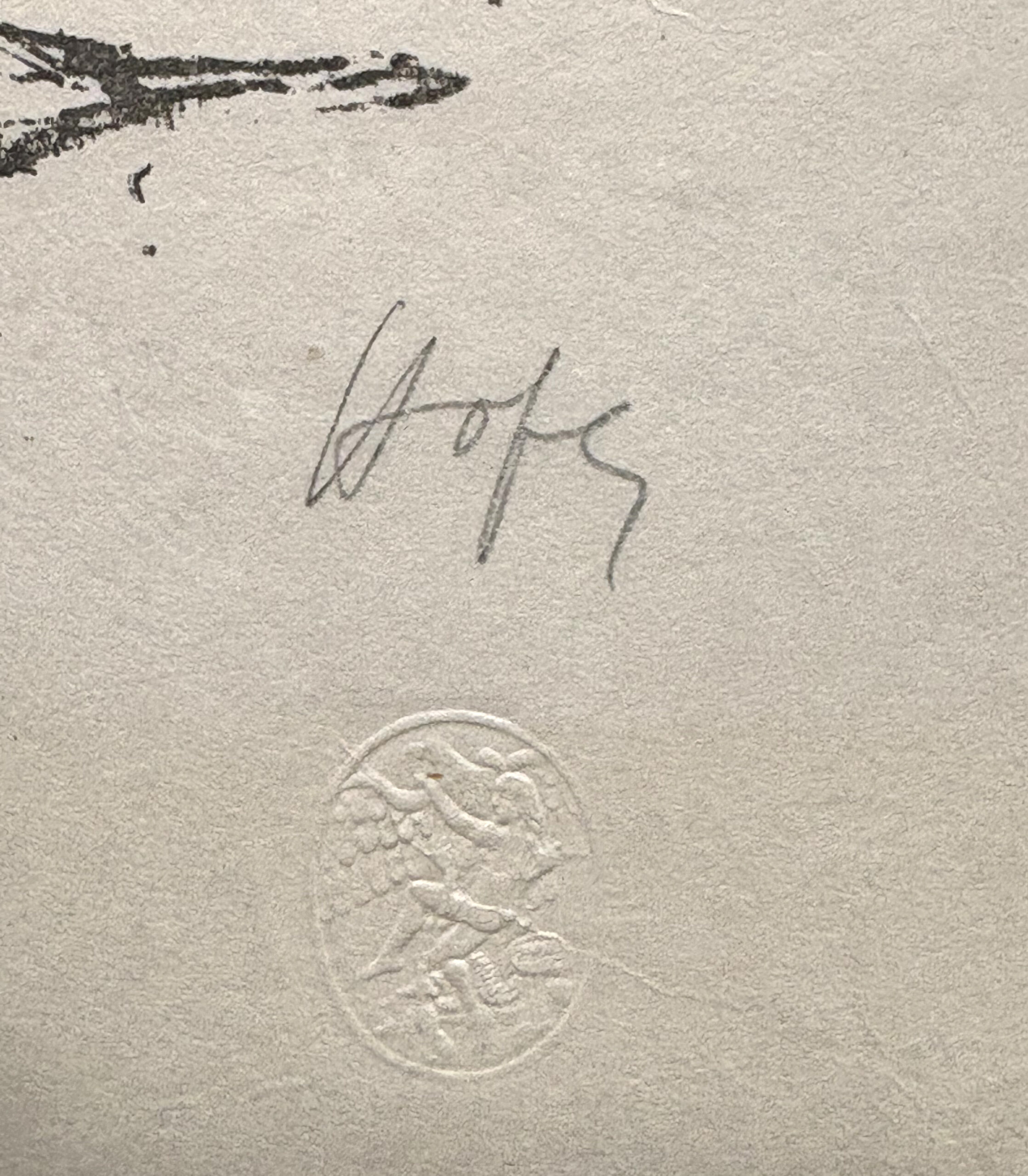 Original lithograph, signed in pencil, printed in gray ink on cream, Imperial Japan paper. With the publisher’s embossed blindstamp below the signature.