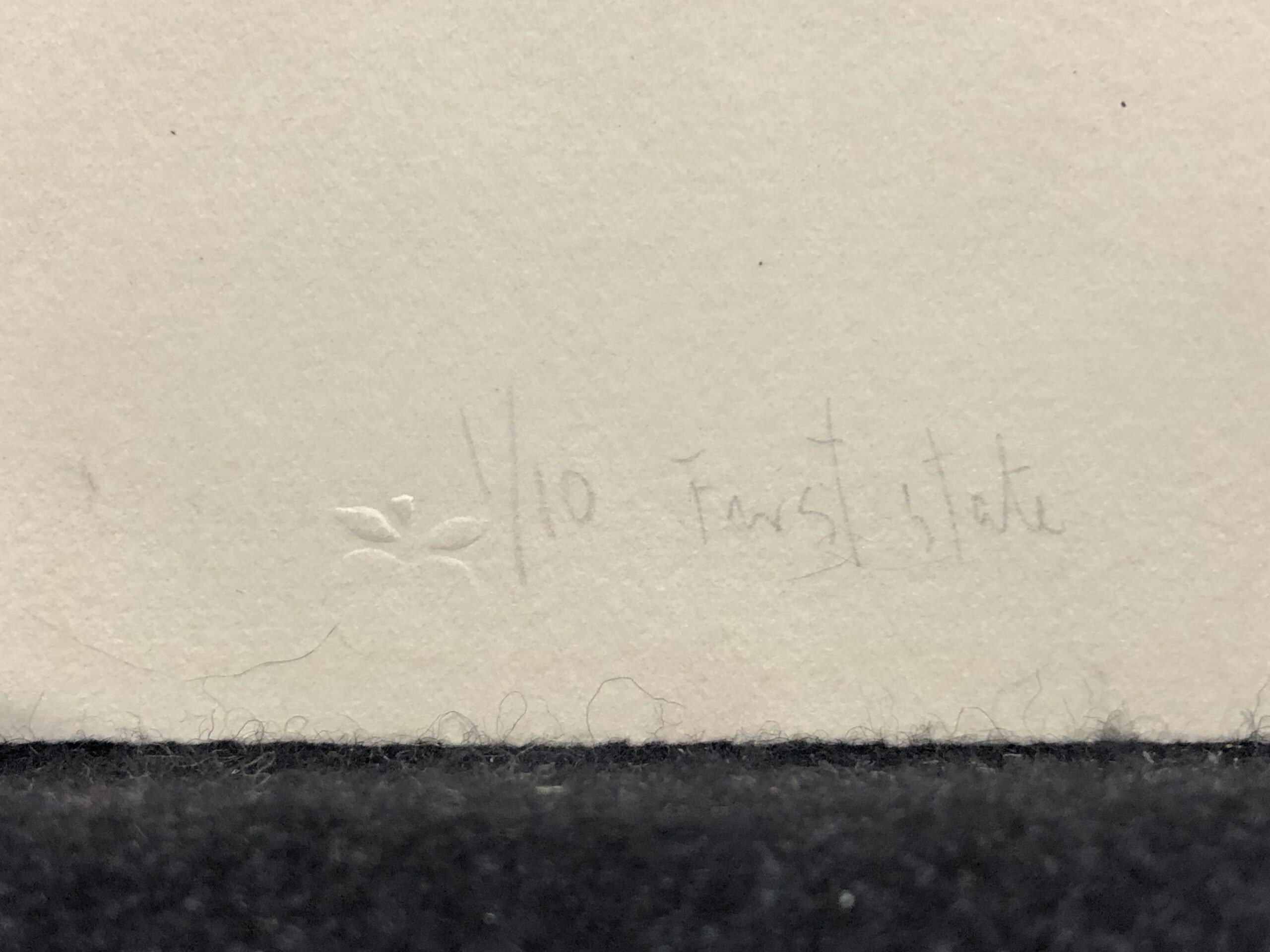 Original lithograph, signed in pencil in the lower right corner along with the artist’s monogram embossed stamp and annotated “1/10 first State” at lower left with the apple embossed stamp, printed on heavy, felt-finish, cream wove paper. Fine condition. Free shipping to US address.
