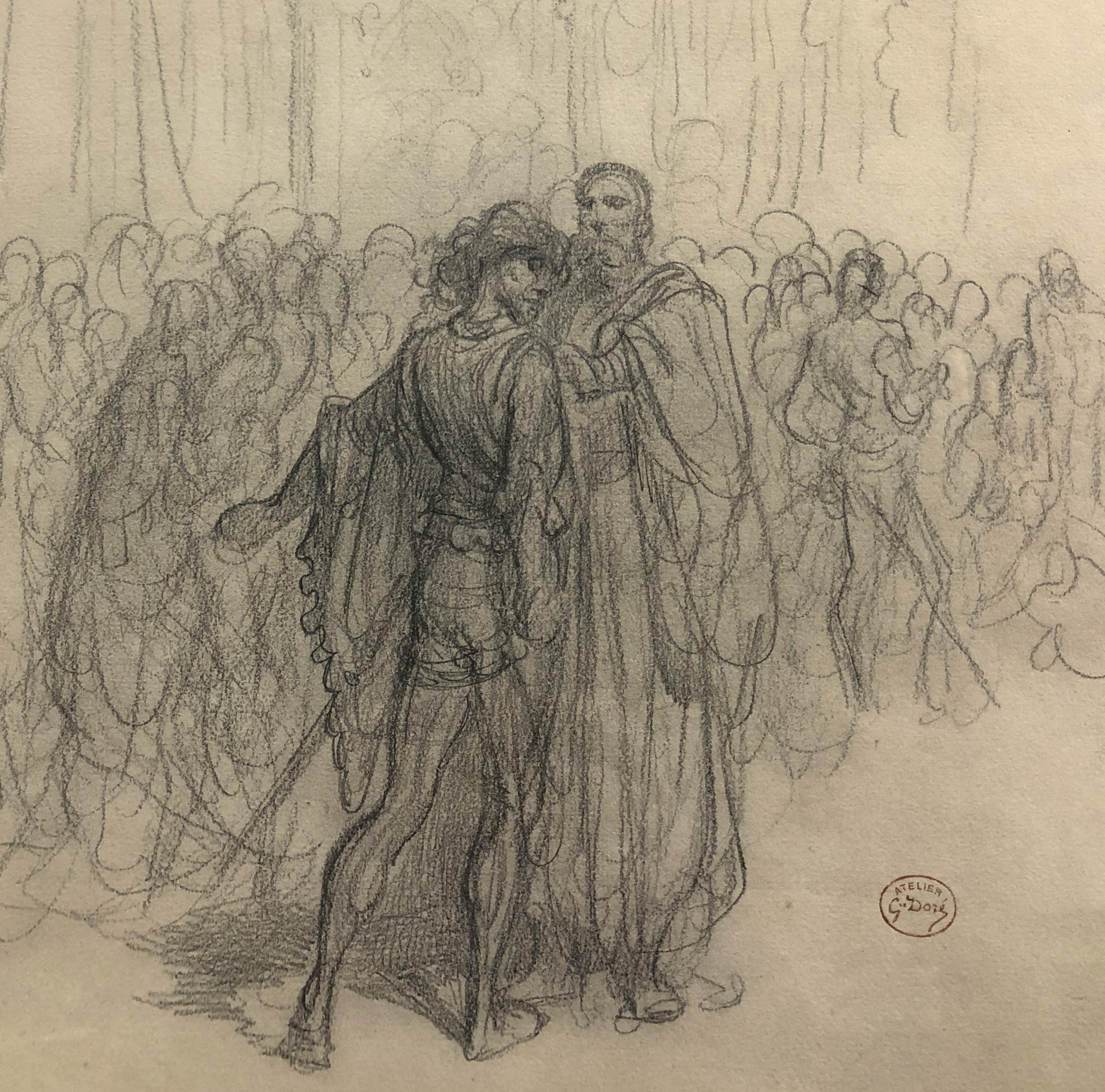 NotesPaul Gustave Louis Christophe Doré was a French printmaker, illustrator, painter, comics artist, caricaturist, and sculptor. He is best known for his prolific output of wood-engravings illustrating classic literature, especially those for the Vulgate Bible and Dante's Divine Comedy. These achieved great international success, and he became renowned for printmaking, although his role was normally as the designer only; at the height of his career some 40 block-cutters were employed to cut his drawings onto the wooden printing blocks, usually also signing the image.