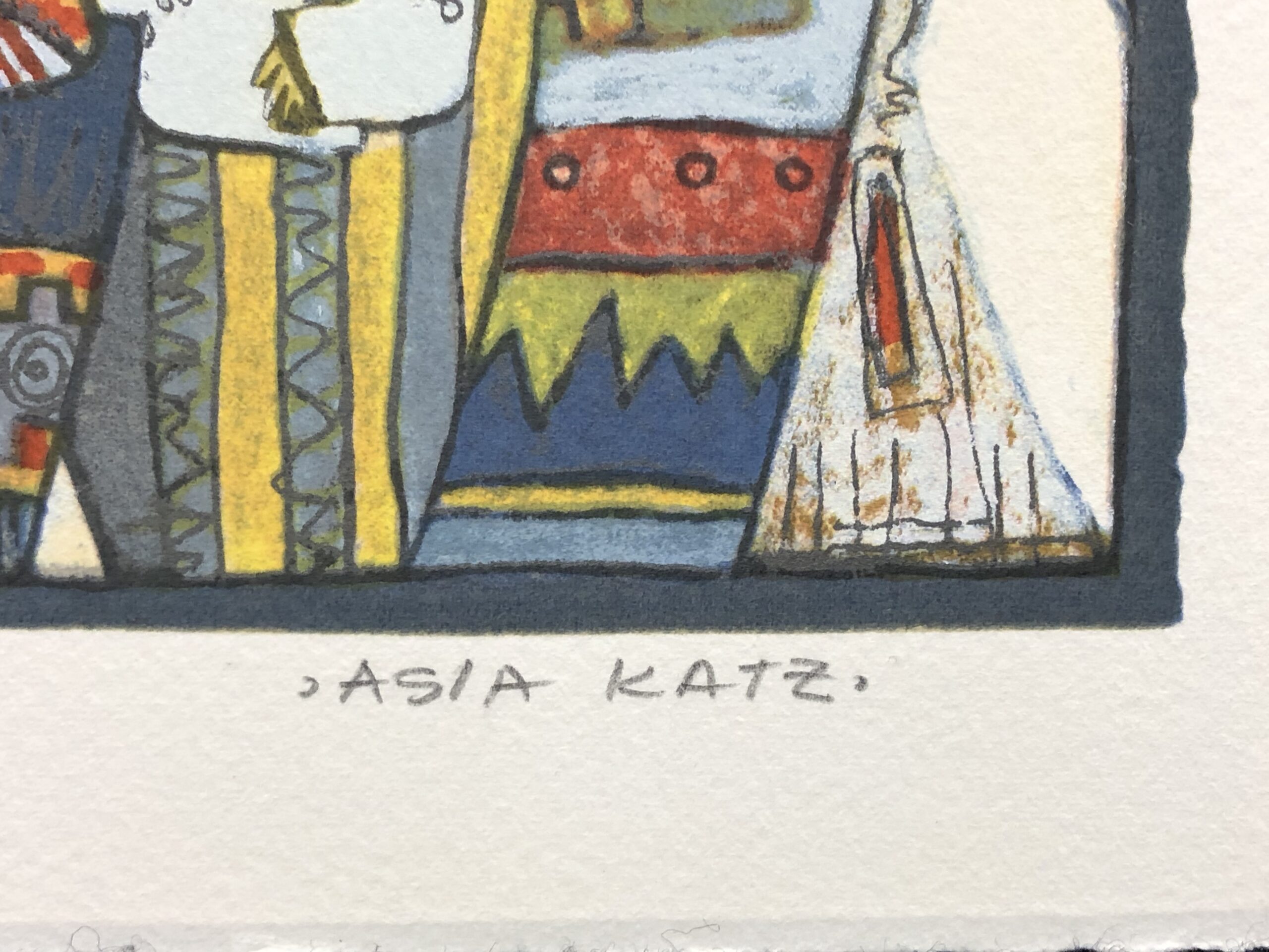 Asia combines multiple styles to create modernistic, cubist-styles drawings and paintings. She employs various approaches with her works including traditional, modern, folk and contemporary art styles. Asia’s paintings and drawings concentrate on exploring people and objects and their interaction with each other and the world around them. Each picture tells its own tale and some, like “Life Story” are a serigraph progression of scenes that fuse together to relate a progressive story. Many of her works feature women as protagonists, depicting women's interactions with each other and with surrounding characters and objects.