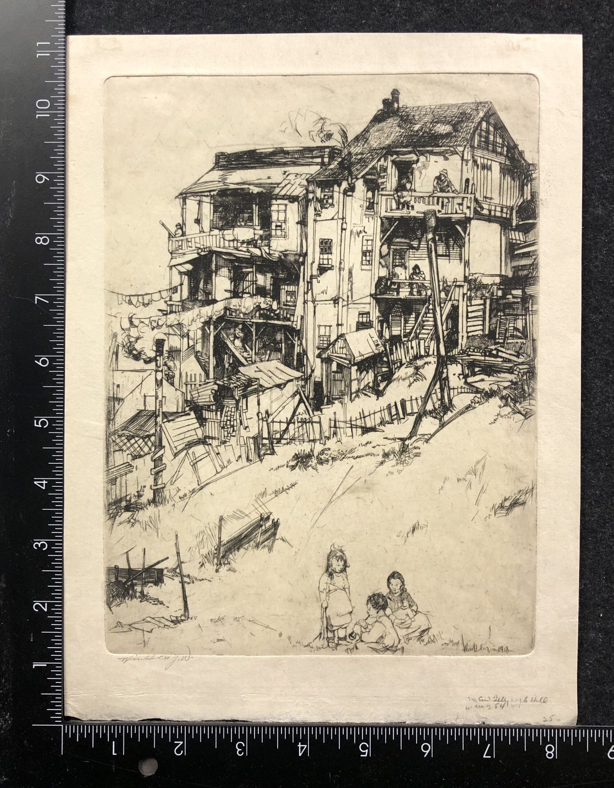 NotesPainter, printmaker, draftsman and craftsman, John William Joseph Winkler was born in Vienna, Austria on July 30, 1894. However, Winkler once wrote that he was born in 1894 and arrived in New York at the age of 16-1/2 years of age. This would coincide with his arrival in San Francisco in 1911. He enrolled in the Mark Hopkins Art Institute and began etching in 1912. San Francisco's Chinatown and Telegraph Hill provided him with fascinating subjects for his etchings and, while on location, he drew directly on prepared plates.