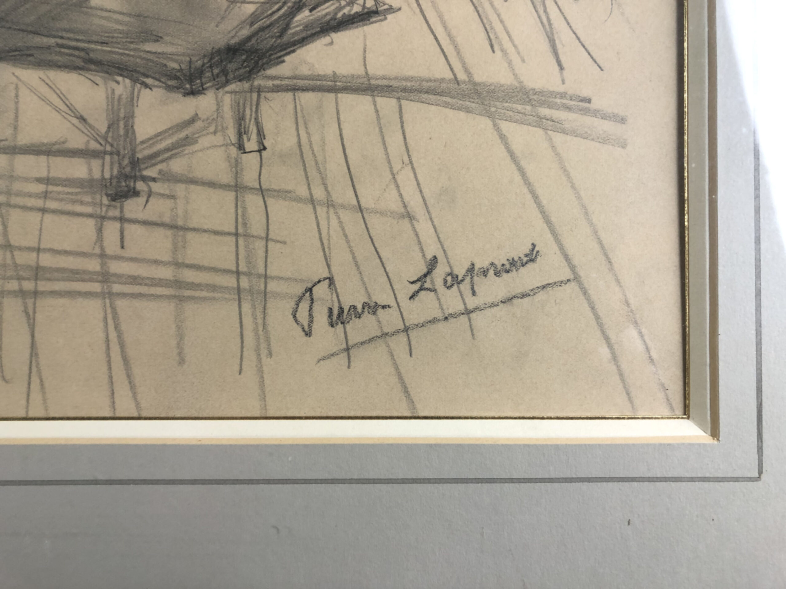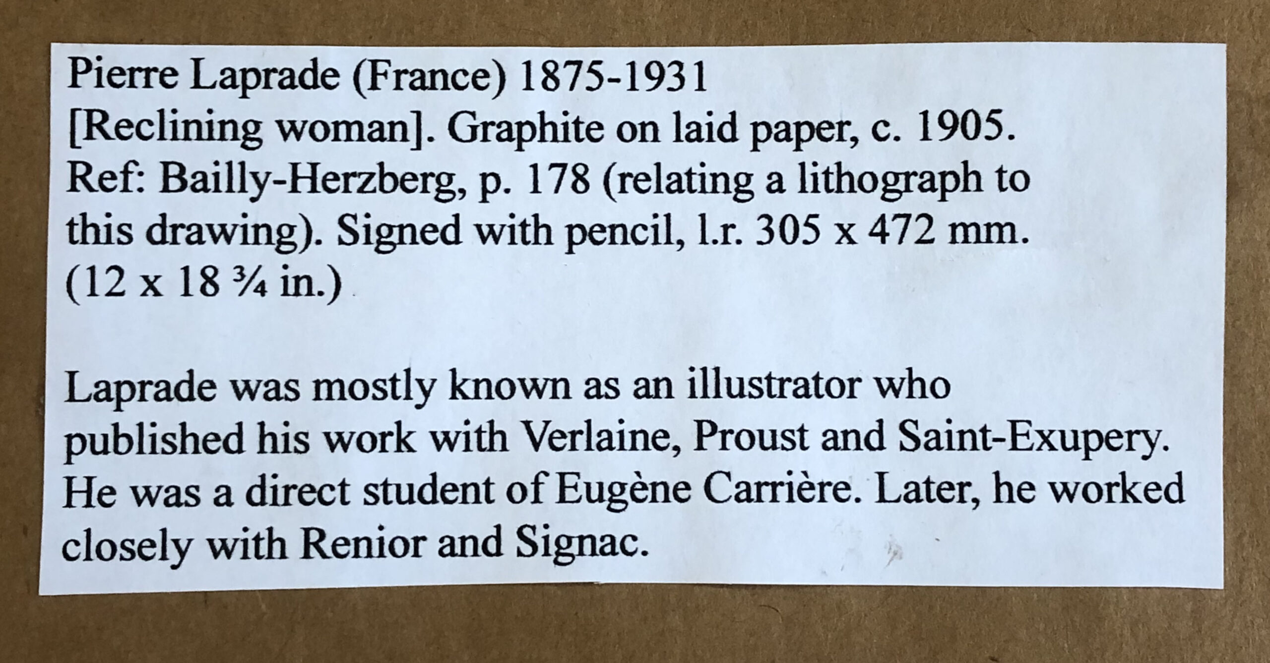 Graphite on cream laid paper, signed “Pierre Laprade” at lower right. Preparatory drawing for a lithograph (