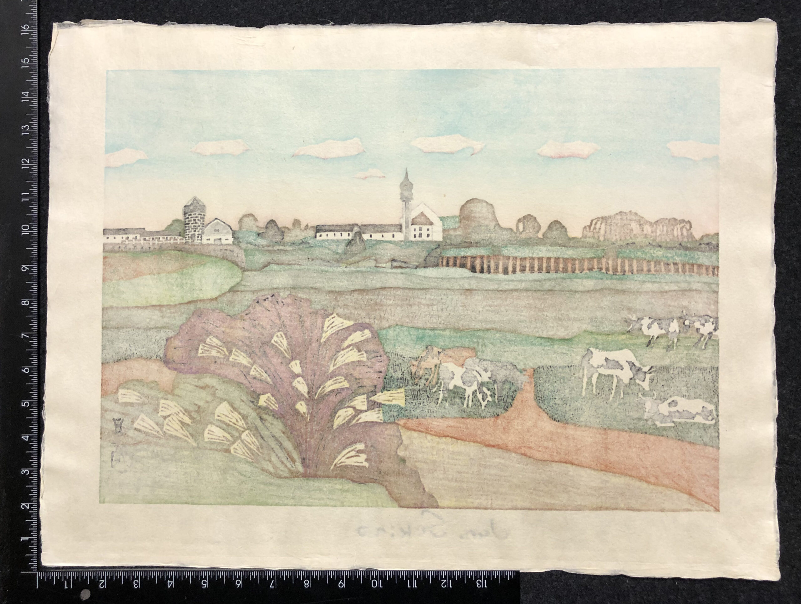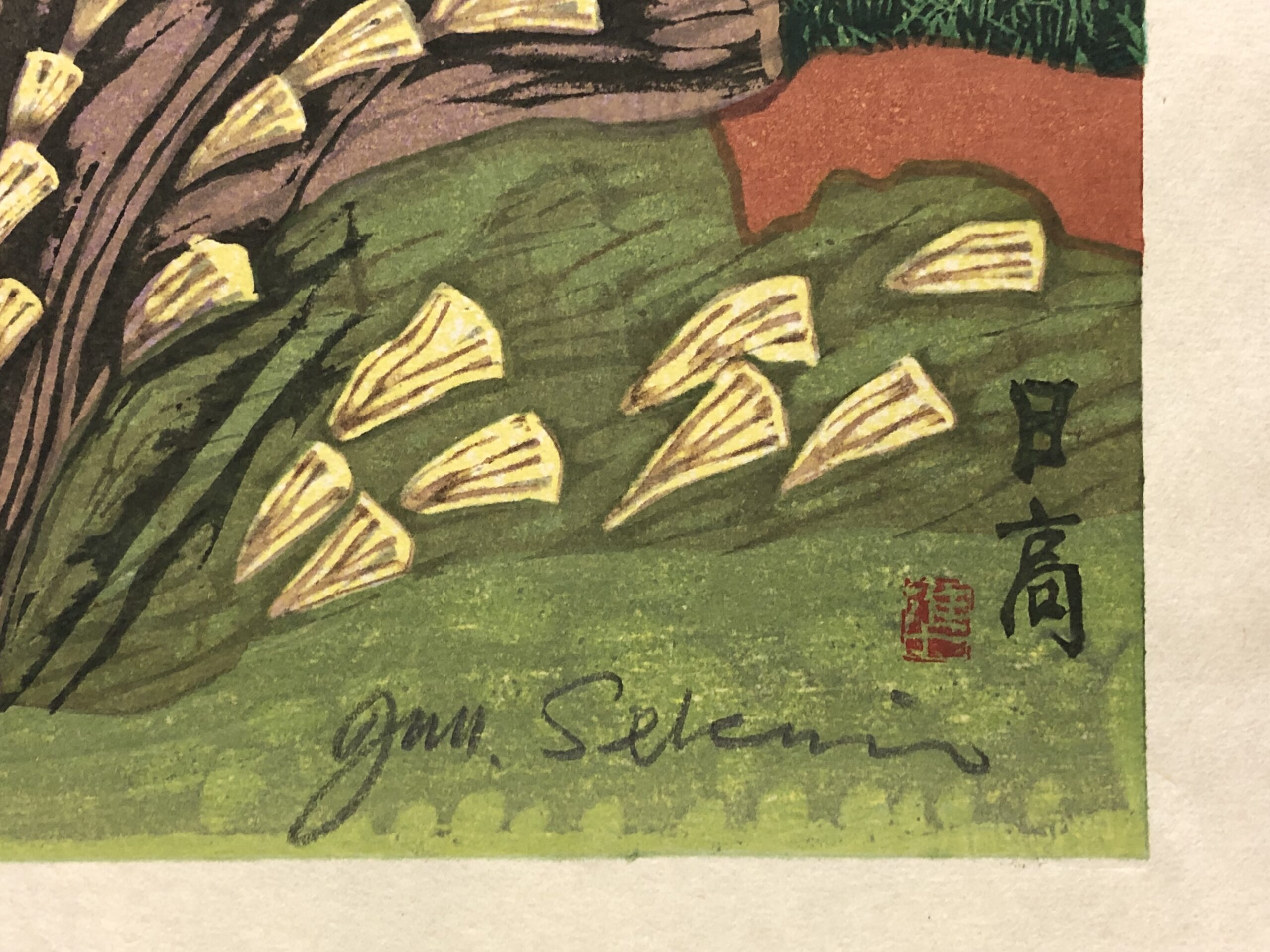 Polychrome woodblock print, signed and dated in pencil within the image and annotated “33/100” at lower left, printed on hand-made Japan kozo paper watermarked “Jun Sekino”. Fine condition. Free shipping to US address.