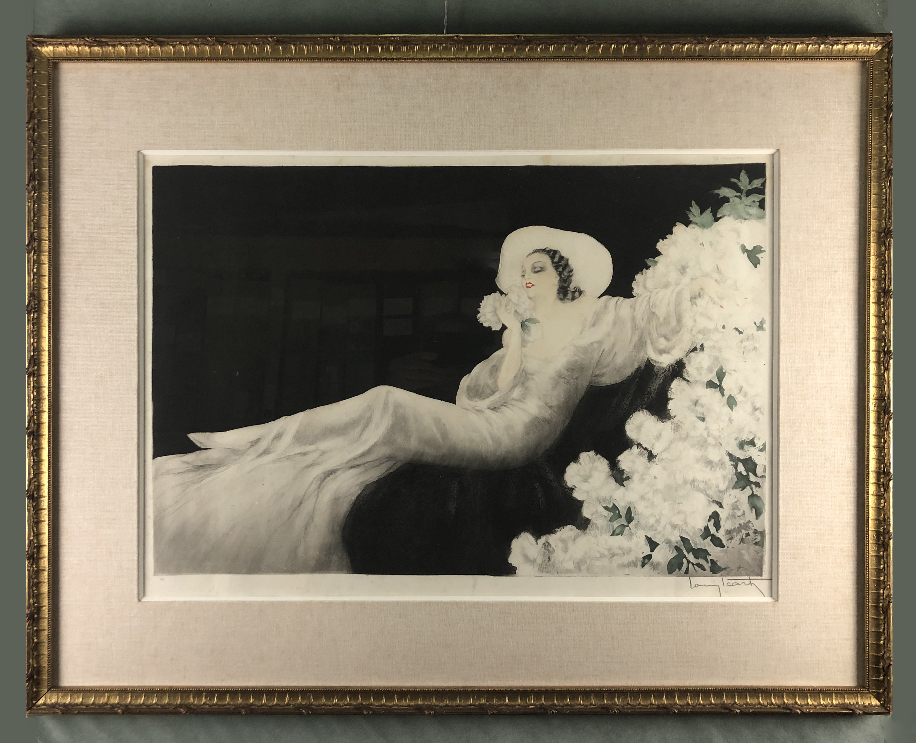 In the studio, where he initially produced frivolous postcards with copies of existing images, he soon designed his own works. Thereupon he received orders for the design of title pages for the magazine La Critique Théâtrale. Fashion houses hired Icart to create fashion sketches, with which he soon became known. In 1913 he showed his pictures at the Salon des Humoristes. Icart then learned the technique of copperplate engraving and from then on worked with this process. He was now working for the large French design studios and illustrated their catalogs. In 1914 he met the eighteen-year-old "beautiful blonde" Fanny Volmers, an employee of the Paquin fashion house, whom he married later and who was the model for many of his works.