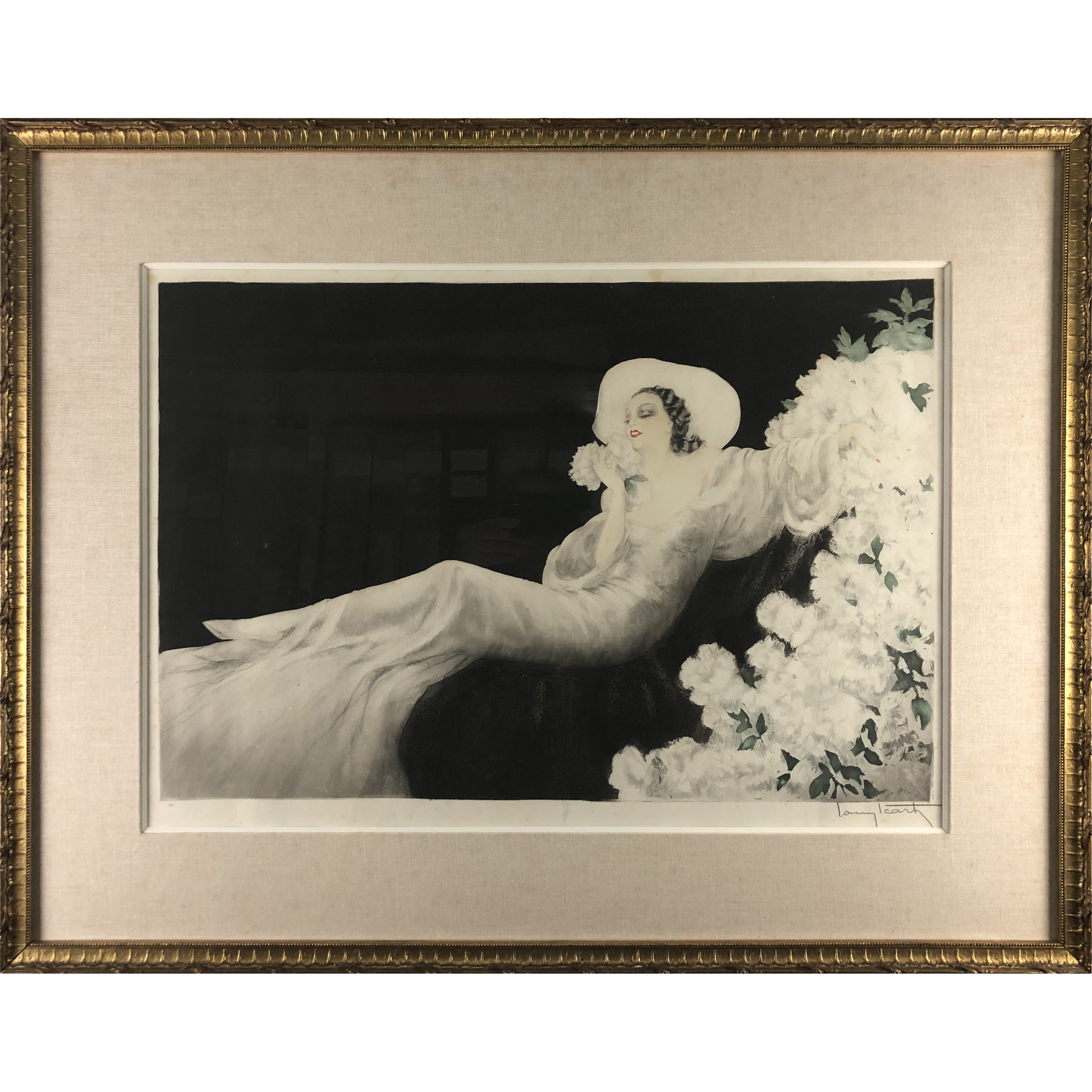 Icart's depictions of women were mostly sensual, often erotic, but also always humorous and full of hinted or direct sexuality. In his pictures, beautiful courtesans frolicked on thick pillows with facial expressions full of passion, dismay or surprise. Horses, dogs or cats were often part of his subjects. Icart made over 500 engravings and illustrated more than 30 books.