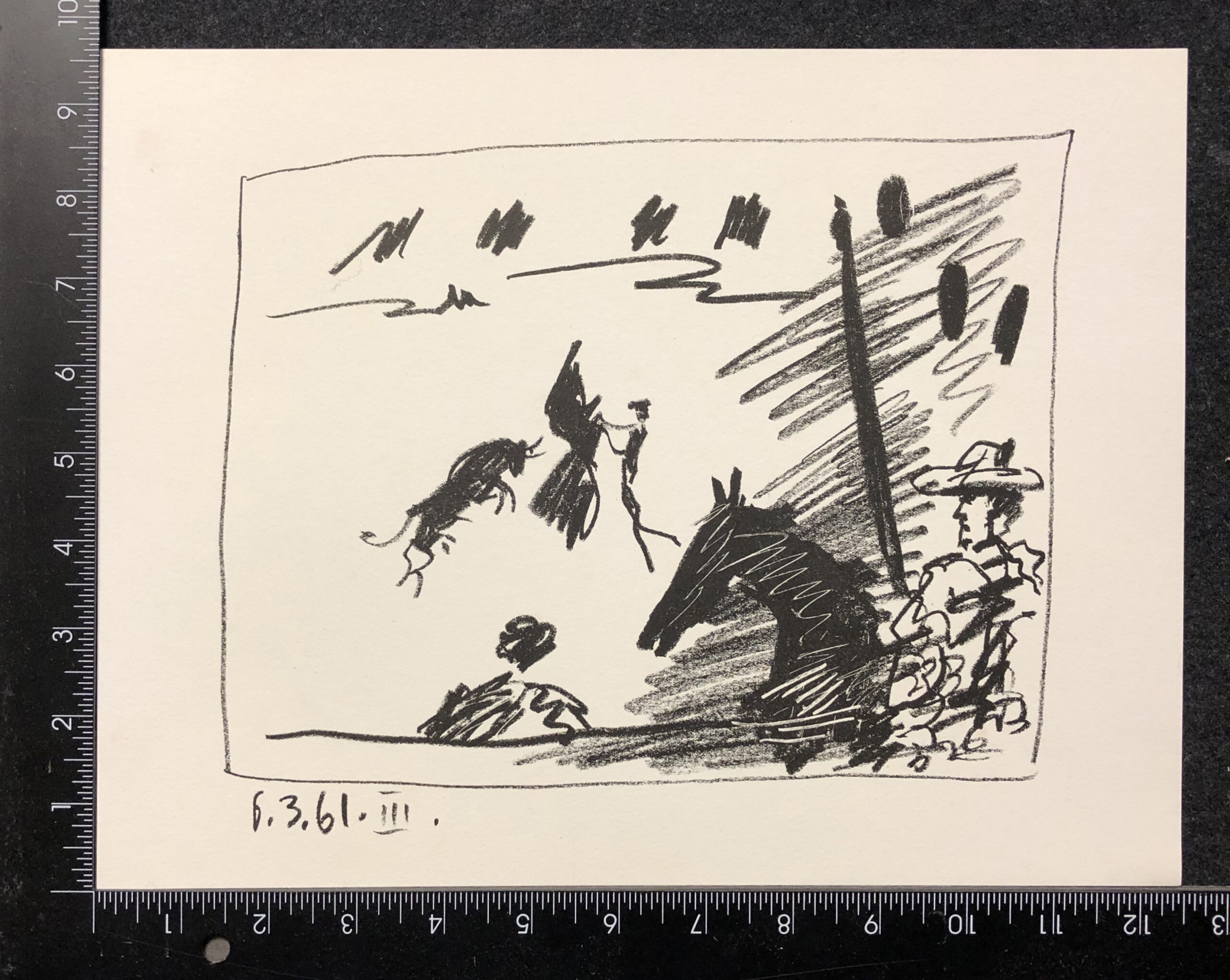 Original lithograph, unsigned, printed in black on felt-finish, white wove paper. Printed by Mourlot Freres, Paris, 1961 for A los Toros, text by Jaimie Sabartes, Andre Sauret Pub., Monte Carlo, 1961. Fine condition. Free shipping to US address. (bx-118)