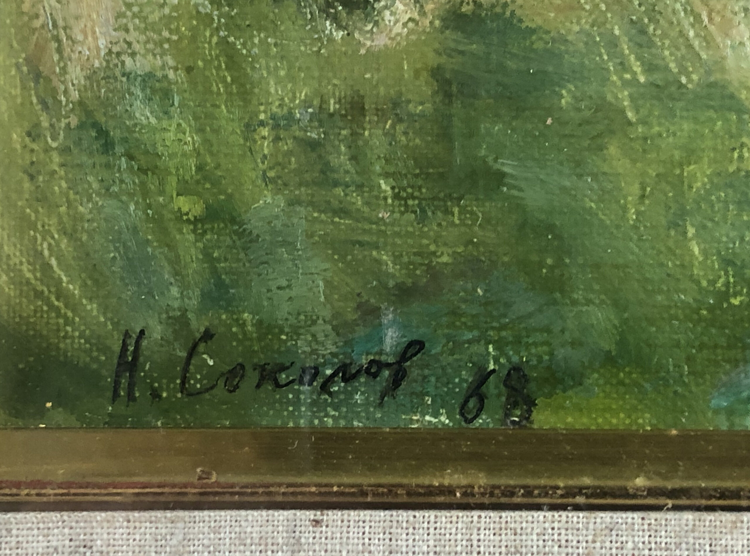 Nikolai Sokolov was a member of the important Soviet art collective known as the KuKriNiksky, comprised of Sokolov, Mikhail Kupriyanov and Porfiry Krylov. The KuKriNiksky created the most famous anti-Nazi propaganda and satiric artwork of World War II. In addition to their work as graphic artists each member of the KuKriNiksky had individual careers as painters. Sokolov's landscapes are intimate and display the romantic influence of his teacher Mikhail Nesterov. Through his work with the KuKriNiksky Sokolov's works are kept and exhibited in every major Russian museum and are also in the collection of the Victoria and Albert Museum in London, The Art Institute of Chicago, MOMA New York, and the Cooper Hewitt Museum.