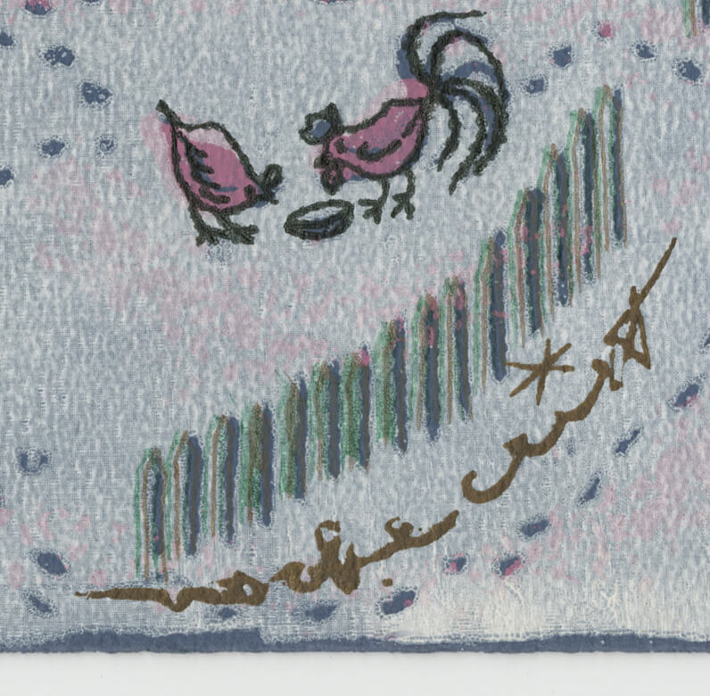 Screen print in 8 colors, signed in the screen, printed on textured, blue wove paper with thread margins.