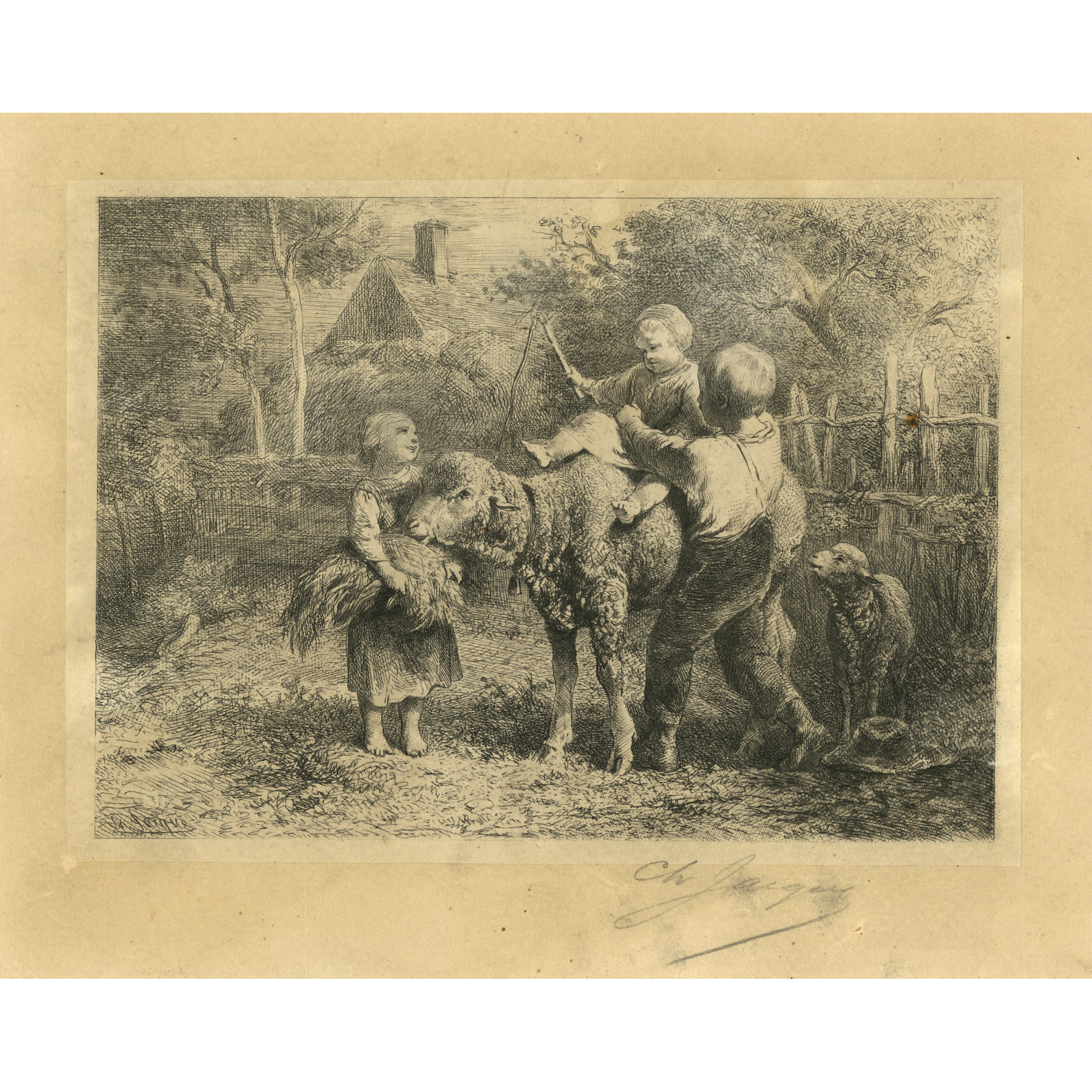 Fleeing the Cholera epidemics that besieged Paris in the mid-nineteenth century, Charles Jacque relocated to Barbizon in 1849 with Millet. There, he painted rustic or pastoral subject matter: shepherds, flocks of sheep, pigs, and scenes of farm life. In addition to painting, Jacque was also famous for his etchings and engravings. He, along with Félix Bracquemond and Felix Buhot, is credited with the nineteenth-century revival of seventeenth-century techniques. He began his career as an engraver around 1841 by publishing a series of etchings with Louis Marvy. He followed this work with a series of engravings based on the works of Adriaen van Ostade, after which he began to create original engravings / artworks. Charles Baudelaire said of him, "Mr. Jacque’s new reputation will continue to grow always, we hope. His etchings are very bold and his subject matter is well conceived. All that Mr. Jacque does on copper is filled with a freedom and a frankness which reminds one of the Old Masters."