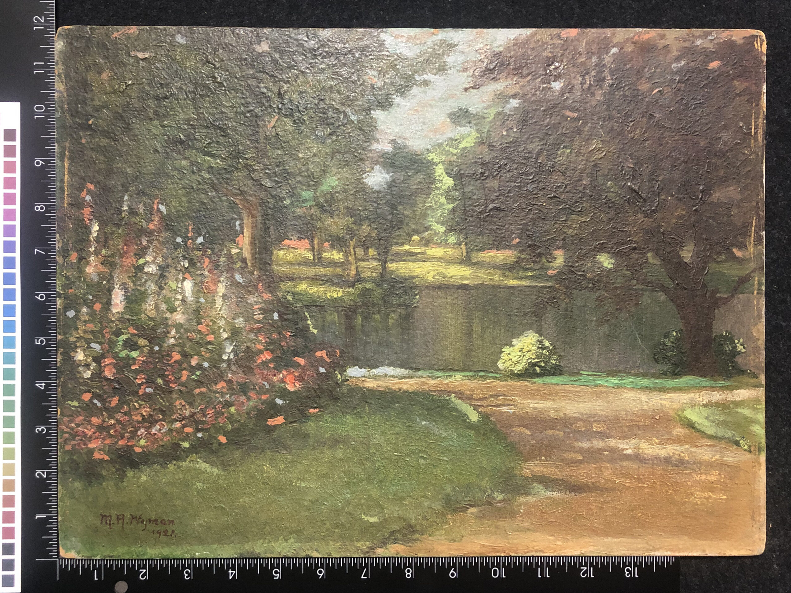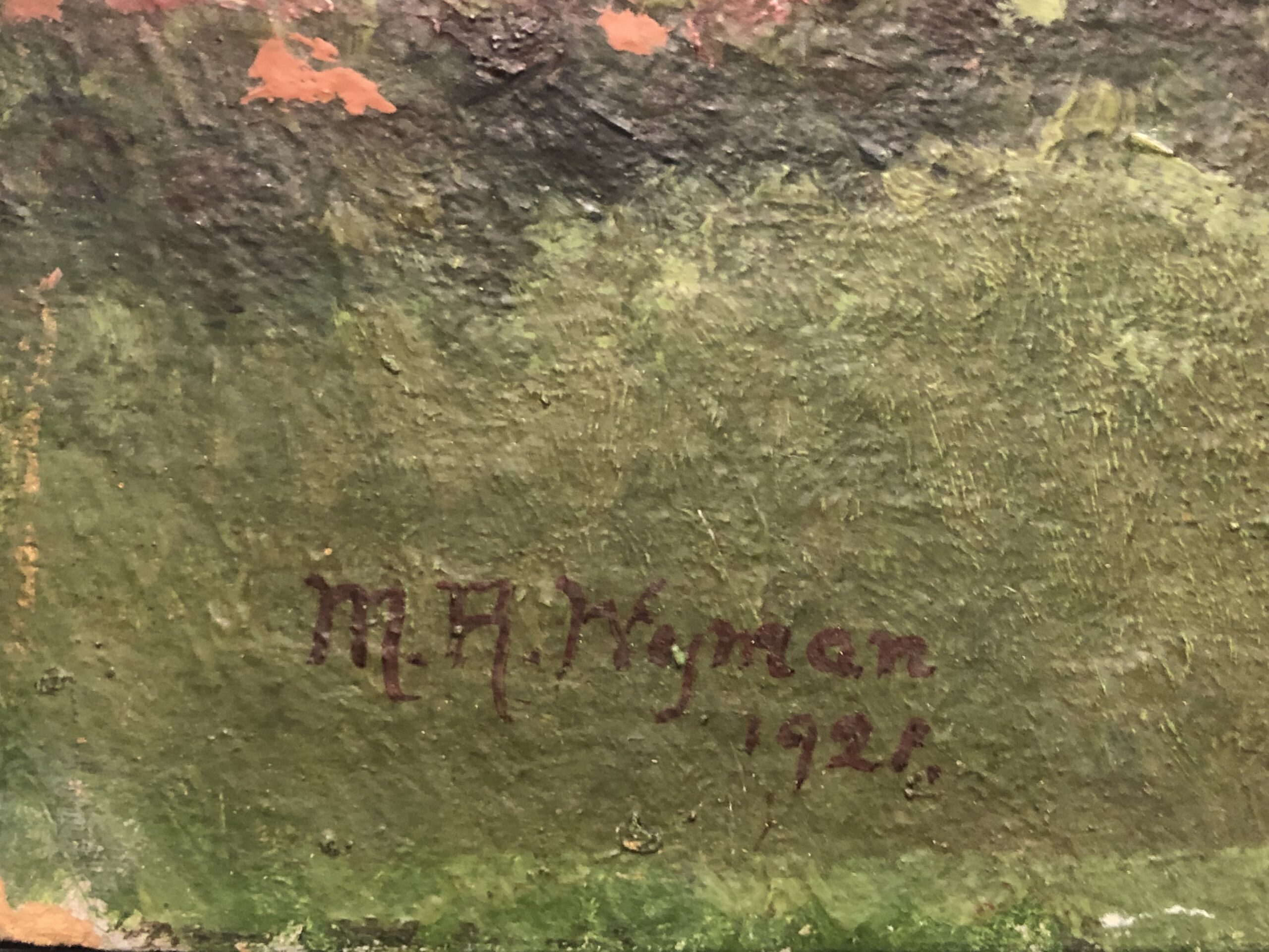 However, her conservative style did not prevent Wyman from experimentation. She enjoyed the imaginative quality and spontaneity of water oils, a process where drops of oil paint of varying hues and tints are dropped on the surface of a pan of water. When moved, abstract forms appear on the water’s surface, and a piece of paper is quickly laid on top, transferring color onto the paper. The abstract design then serves as inspiration for the final composition, which the artist brings out by using layers of watercolor washes until the desired effect is achieved. Wyman also painted figurative landscape miniatures on milk glass as a hobby.